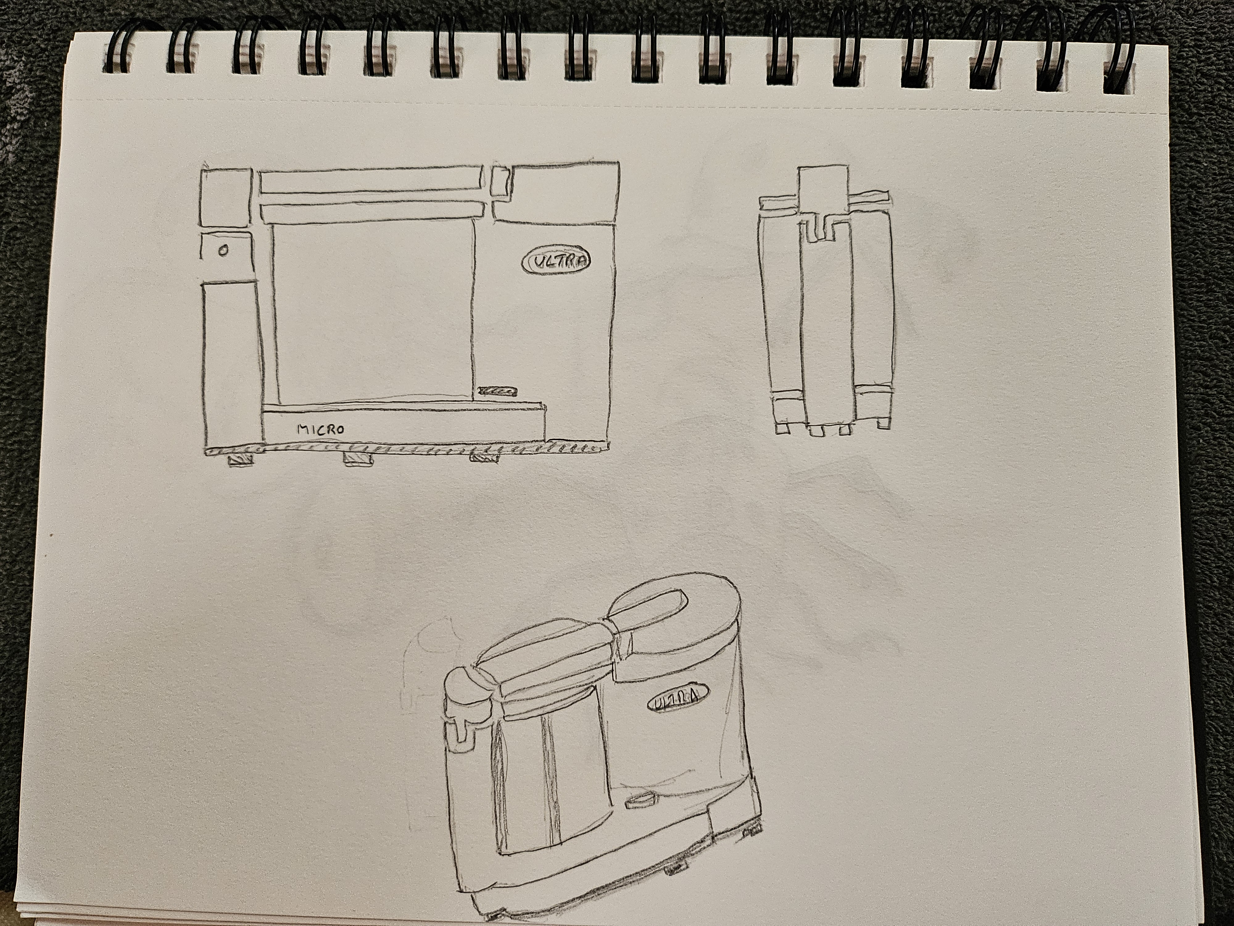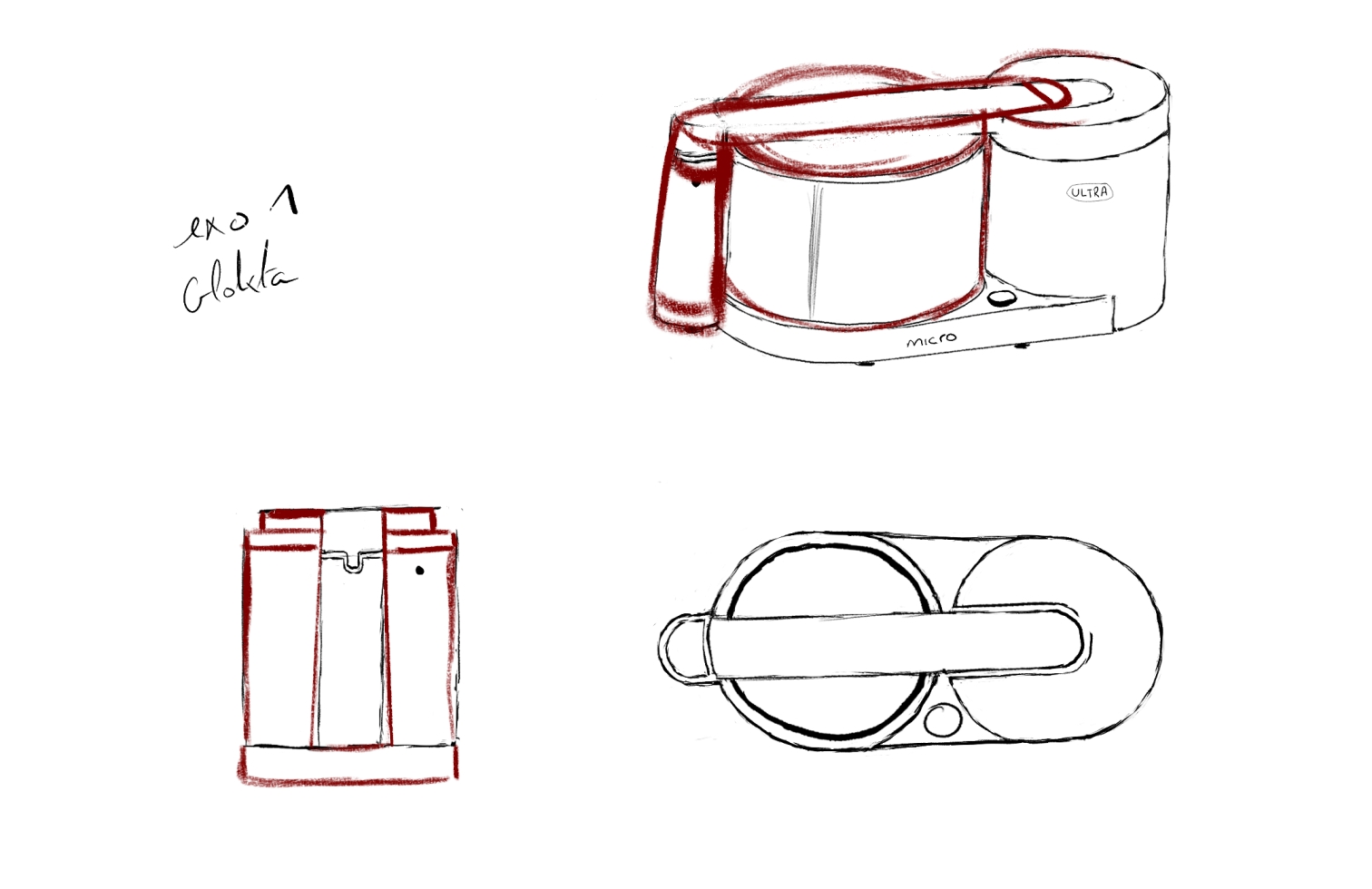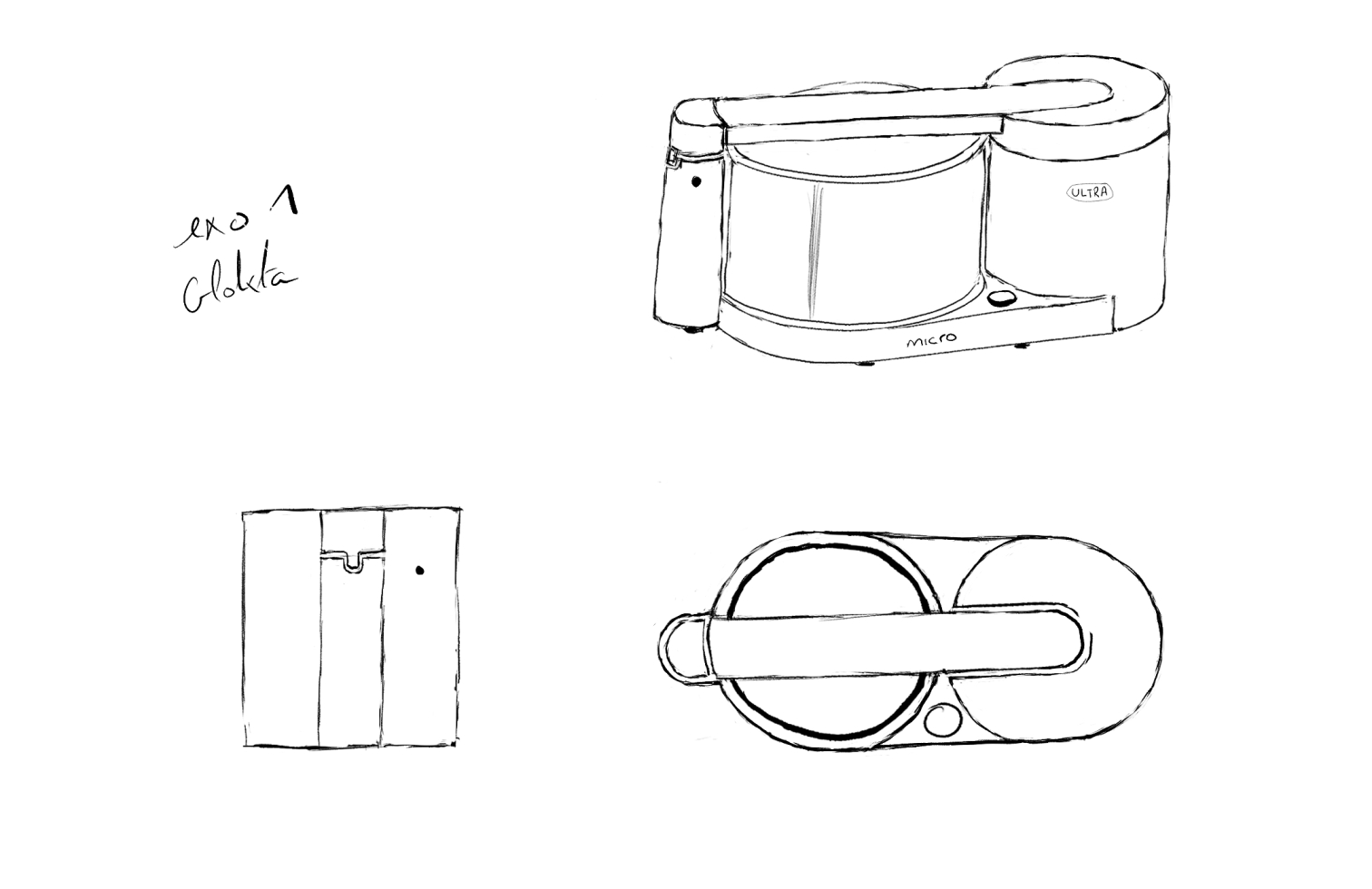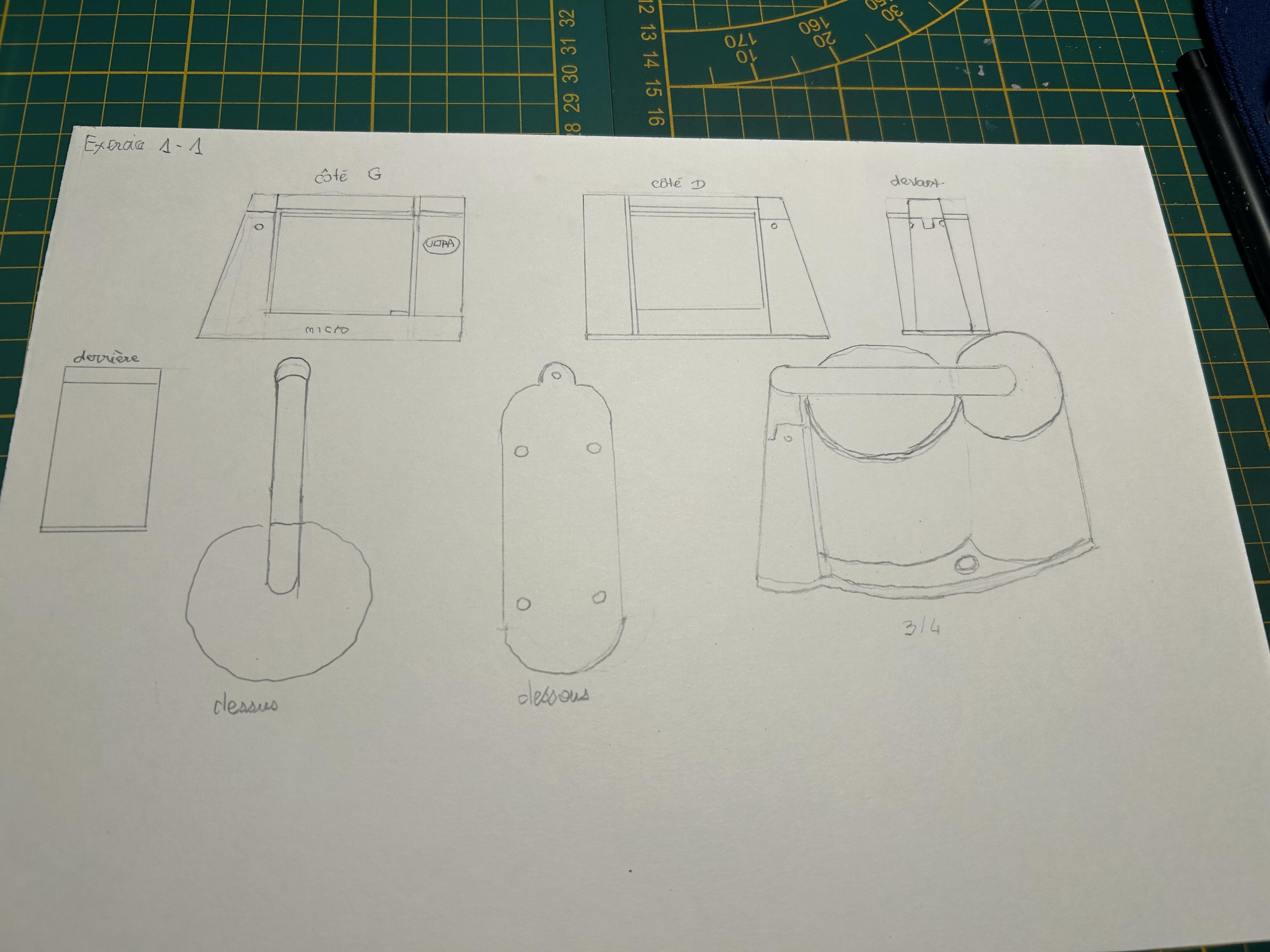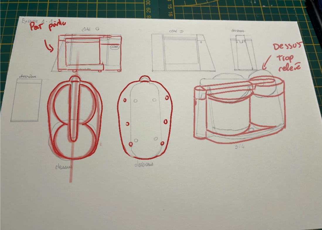 Voila la correction de ton exercice, au niveau des vue de profil, l'appareil n'est pas pointu comme tu as pu le faire mais plutôt plat, sur les vue de dessus il manque quelques éléments et l'appareil est plus arrondis pour la vue de dessous. Au niveau de la vue de 3/4 les proportions sont plutôt bonnes mais le dessus de l'appareil est trop relevé, tu peux imaginer les faces d'un cube pour essayer de faire correspondre les différentes face de l'appareil et garder une cohérence sur le tout :)
