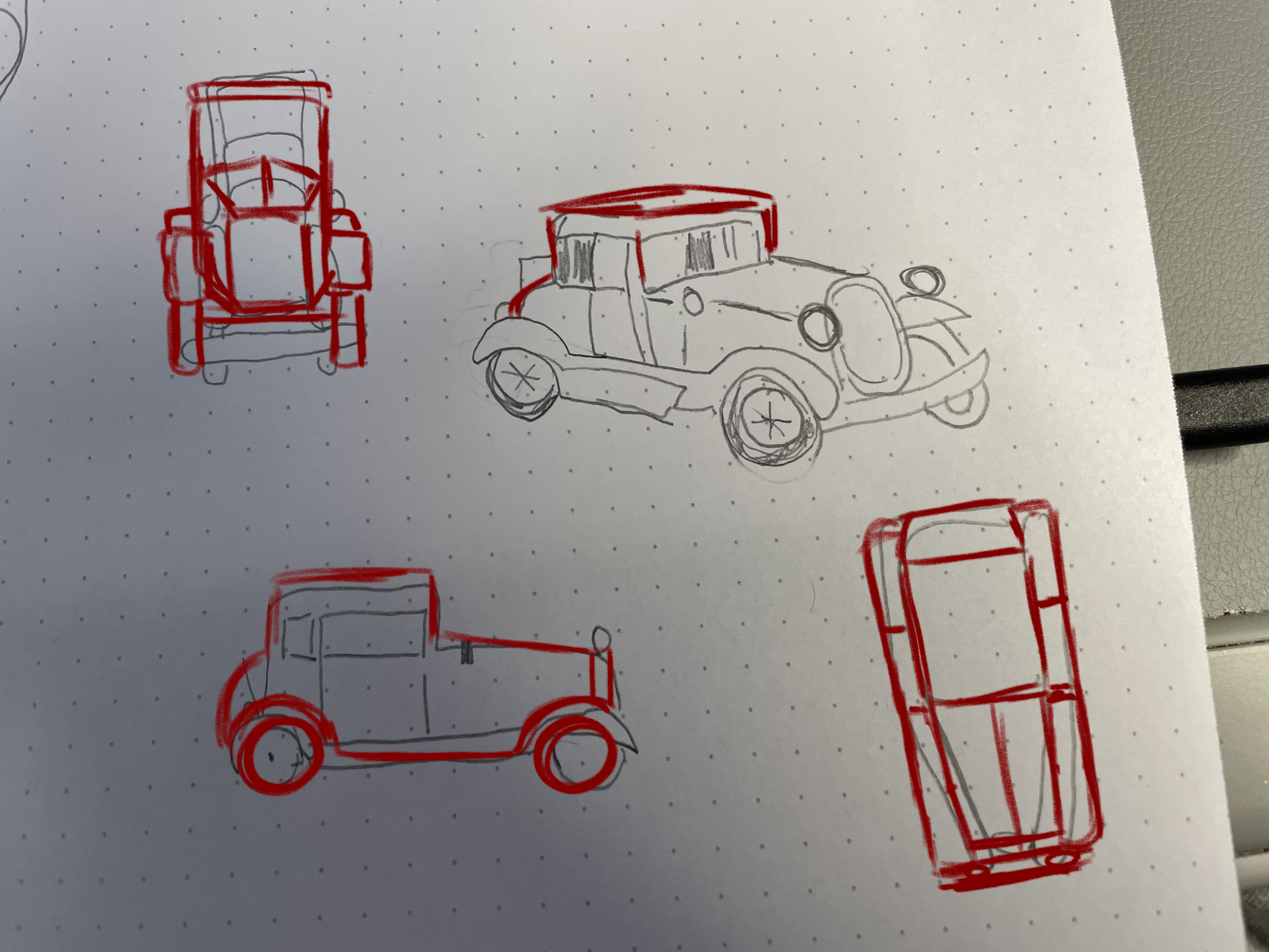 Voilà la correction, sur les guerres de face et de profil il y a quelques erreurs de proportions. Au niveau de ta vue de 3/4 l'ppareil paraît légèrement tordu, je t'ai fait une correction sur le côté pour que tu puisses comparer. Je te conseil de t'aider d'un cube afin de bien positionner les différentes face, par exemple le dessus de ton appareil était un peu trop relevé les les côté penché un peu trop également, c'est ce qui donne cette impression d'appareil tordu, en revenant à des formes de constructions plus simple cela devrait t'aider :)