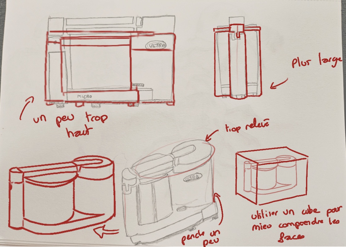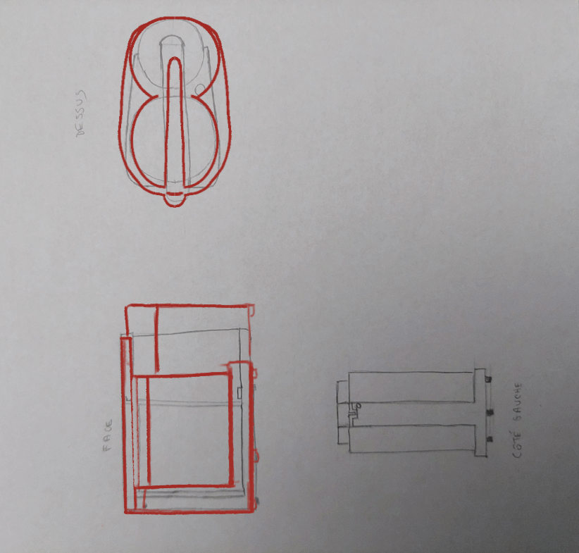 Esta es la corrección, en las guerras desde el frente y el perfil hay algunos errores de proporciones. A nivel de su vista de 3/4, el Ppareil parece ligeramente retorcido, le hice una corrección en el costado para que pueda comparar. Le aconsejo que lo ayude con un cubo para colocar adecuadamente las diferentes caras, por ejemplo, la parte superior de su dispositivo también se elevó un poco el lado inclinado un poco también, esto es lo que le da esta impresión de dispositivo retorcido, volviendo a construcciones más simples que deberían ayudarlo :)