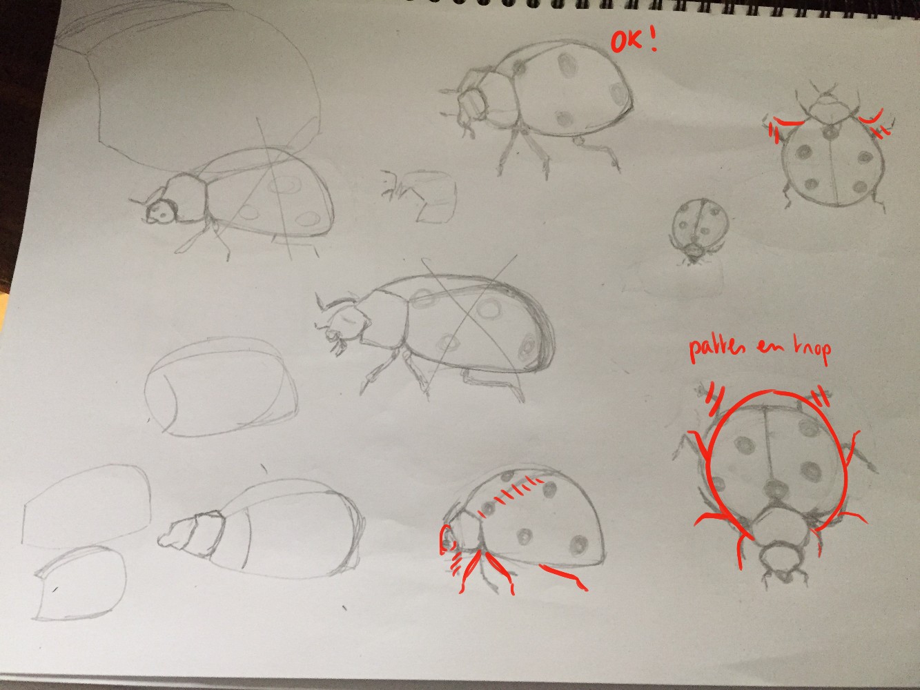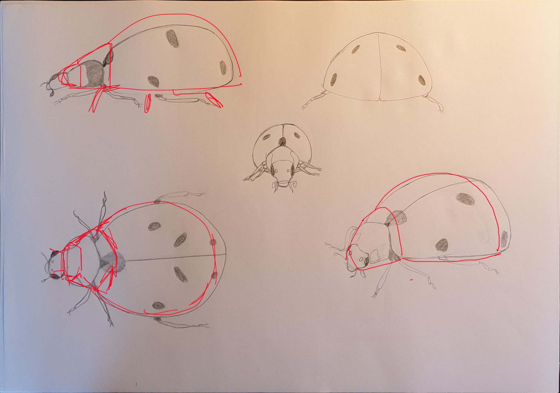Tu t'es améliorée au cours de tes essais, les dernières sont bien mieux que les autres notamment niveau arrondi. Il y a quelques erreurs que je t'ai annotées dans une correction visuelle, souvent sur les pattes et leurs positionnement, et i y a une paire de pattes en trop sur celle de dessus. Pour celle de profil vu que la ligne sur son corps est sur le dessus du dos, de profil on ne la voit pas. J'espère que tu comprendras mieux, c'est du bon travail en tous cas :)