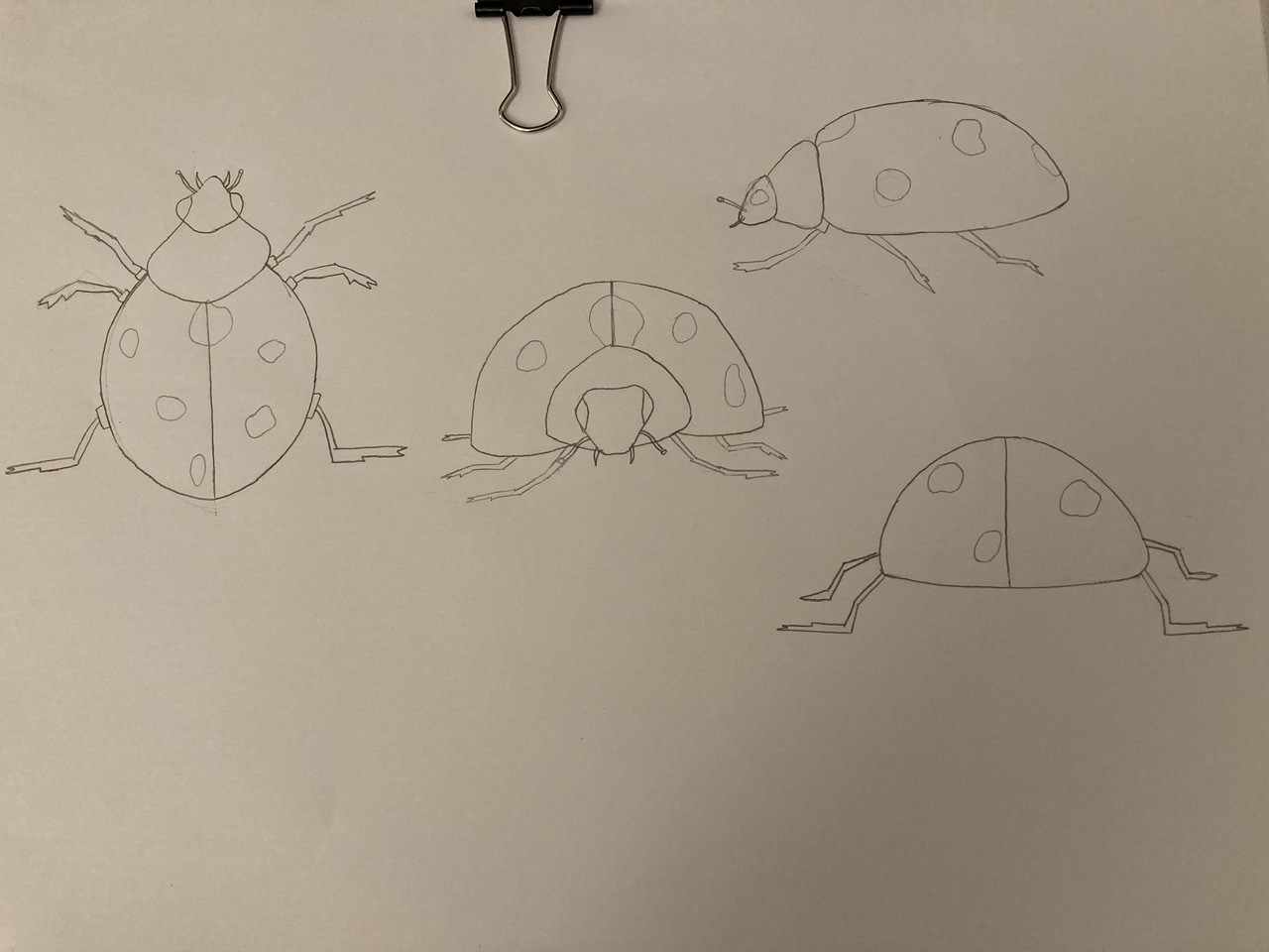 ¡Esto es bueno, el principio de los puntos de vista se entiende bien! En la vista de perfil, tenga cuidado, hay una pierna extra, la mariquita tiene 3 patas en cada lado, no 4. De lo contrario, es bueno :)