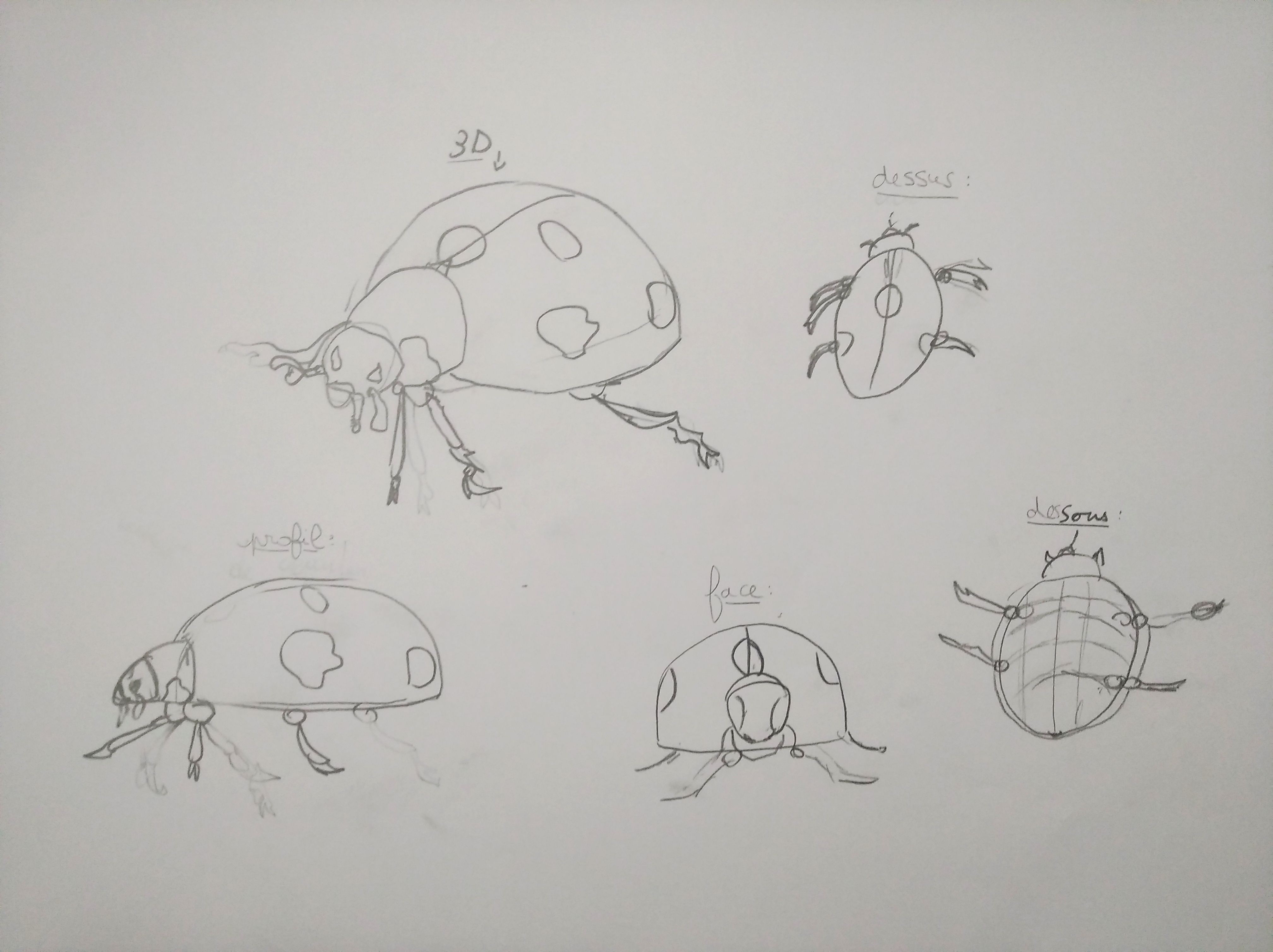C'est bien, le principe des vues est bien compris ! Sur la vue de profil, attention, il y a une patte en trop, la coccinelle a 3 pattes de chaque côté, pas 4. Sinon elle est bien :)