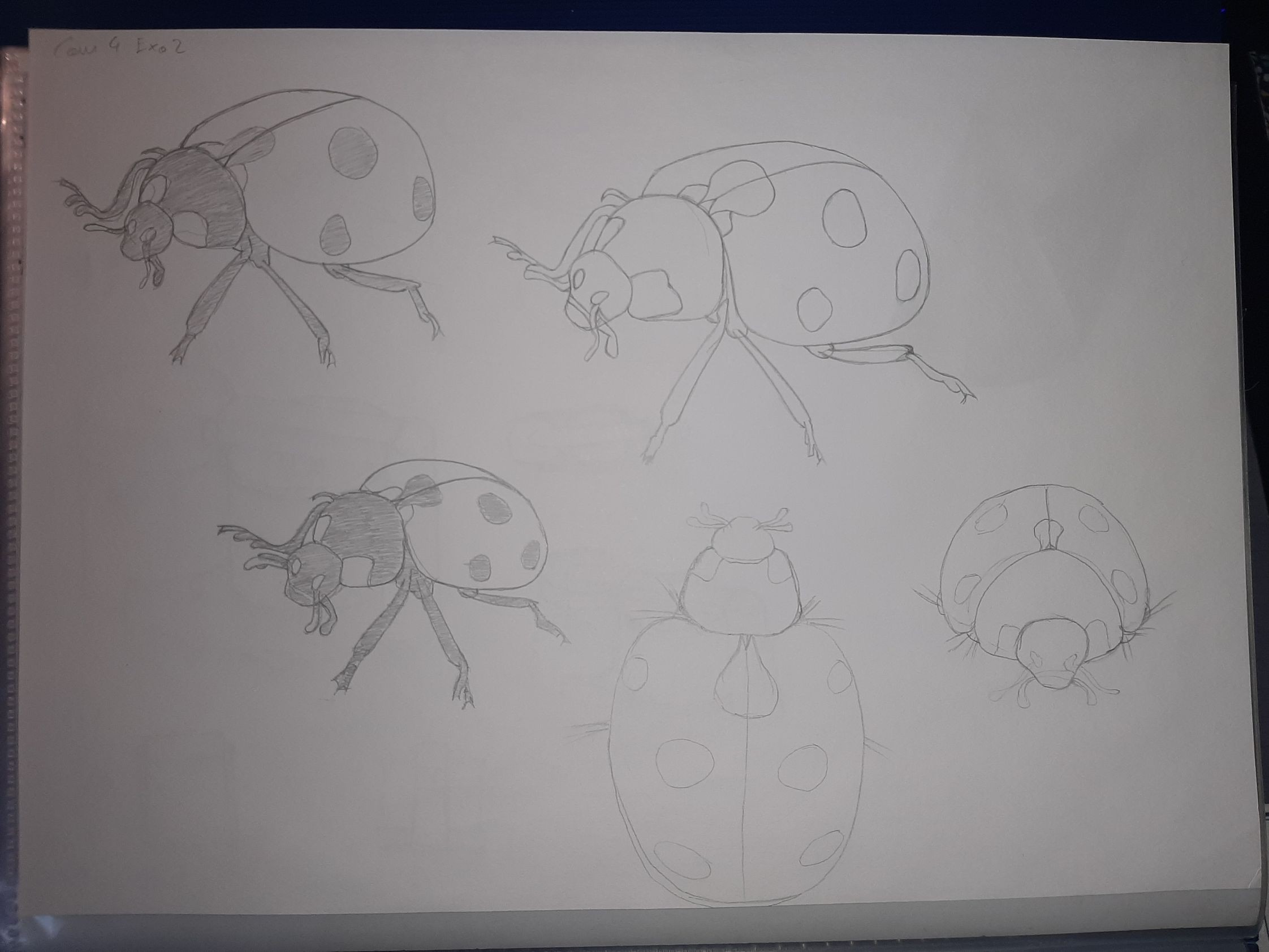 Joli travail, dans la construction c'est bien compris :) Tu as notamment compris comment faire des vues bien en face et pas légèrement tournée en perspective donc ça c'est bien :) Ta vue en perspective est bien :) Ta vue de dessus est pas mal mais j'ai l'impression qu'il manque la zone noire derrière la tête. Aussi, le corps de la coccinelle par un peu de travers vers la gauche et n'est pas assez bombé sur les côtés. Aussi, la première paire de pattes à l'avant devrait partir vers l'avant plutôt que l'arrière.