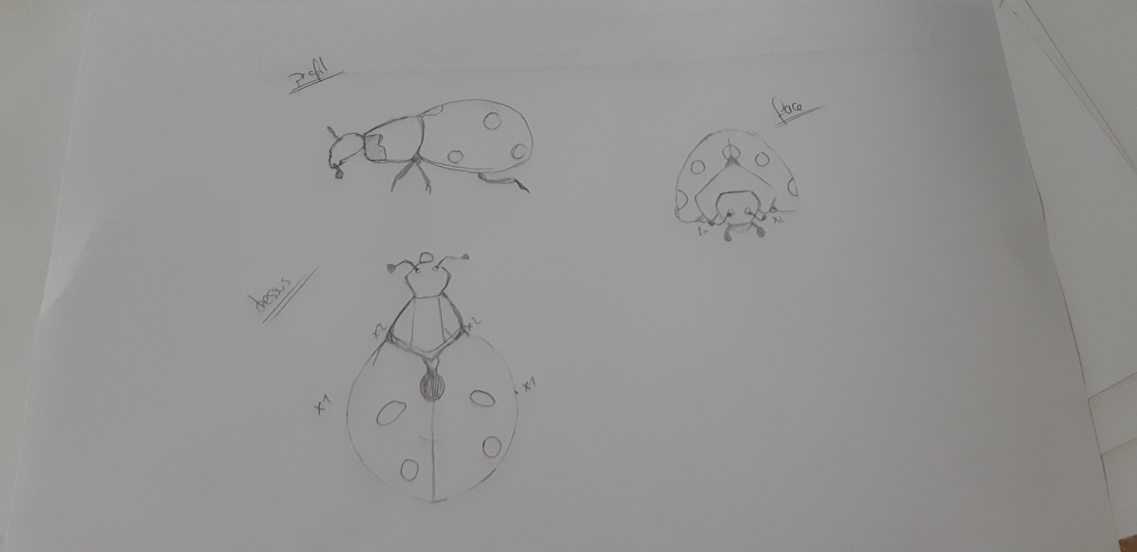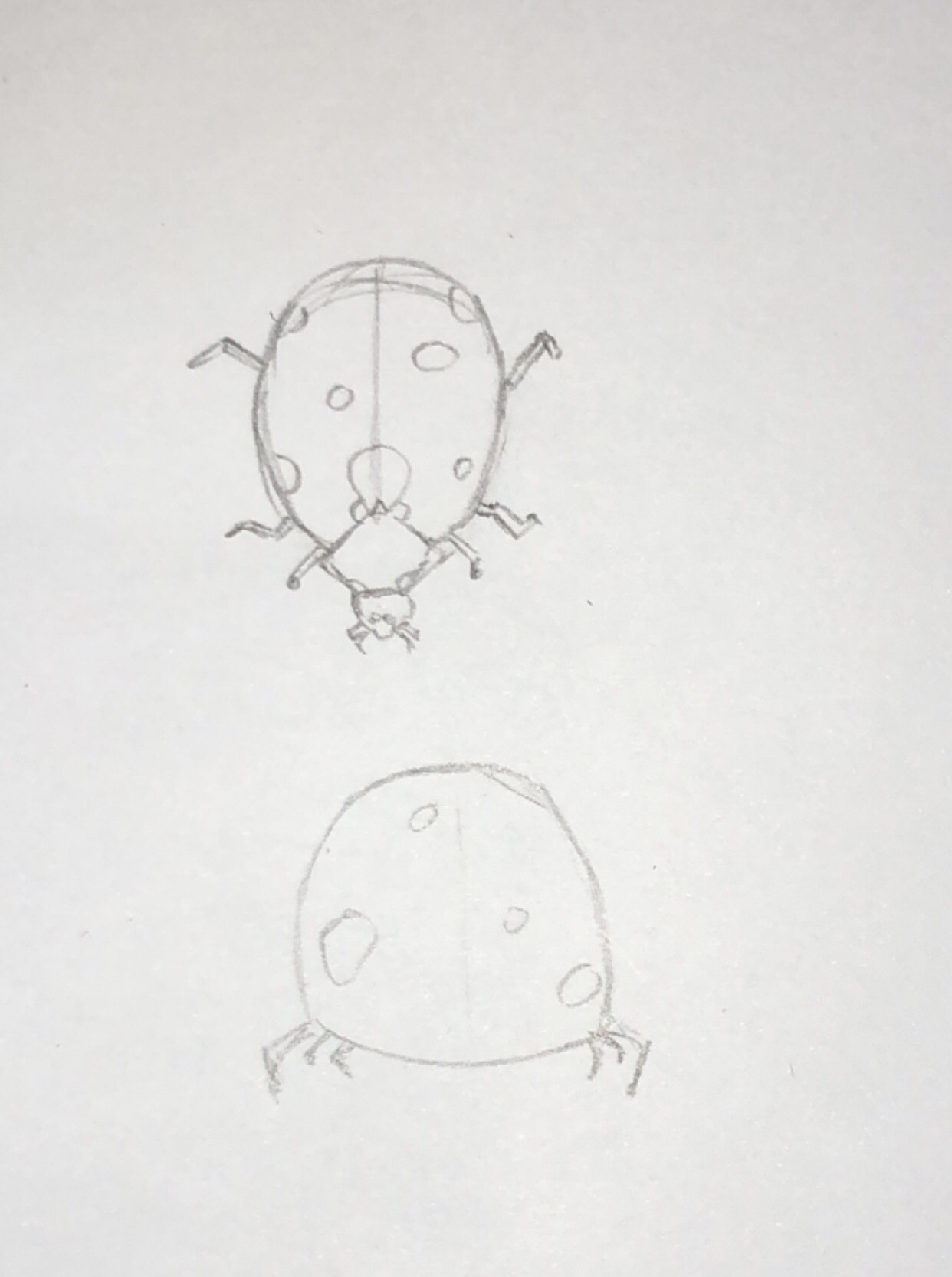 Pas mal pour la vue de face, juste attention pour les pattes qui ont une perspective qui ressemble un peu à une vue de dessus, bien de face elles devraient se poser à peu près sur une même ligne représentant le niveau du sol. Pour la vue de dessus il faudrait la bomber plus sur les côtés, et rendre les pattes plus visibles : elle en a 3 de chaque côté En tous cas tu as globalement compris la construction d'une coccinelle, bien joué :)