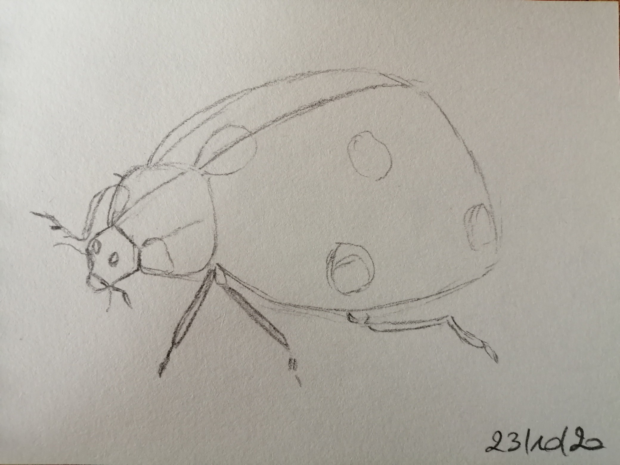 Très chouette cette petite coccinelle ! Mmmmh sur la vue de face tu as fait comme un effet de perspective avec la tête qui paraît très grande, plutot contre-productif quand ici on essaye de comprendre la structure et les proportions d'un sujet :<