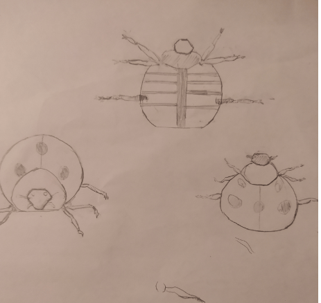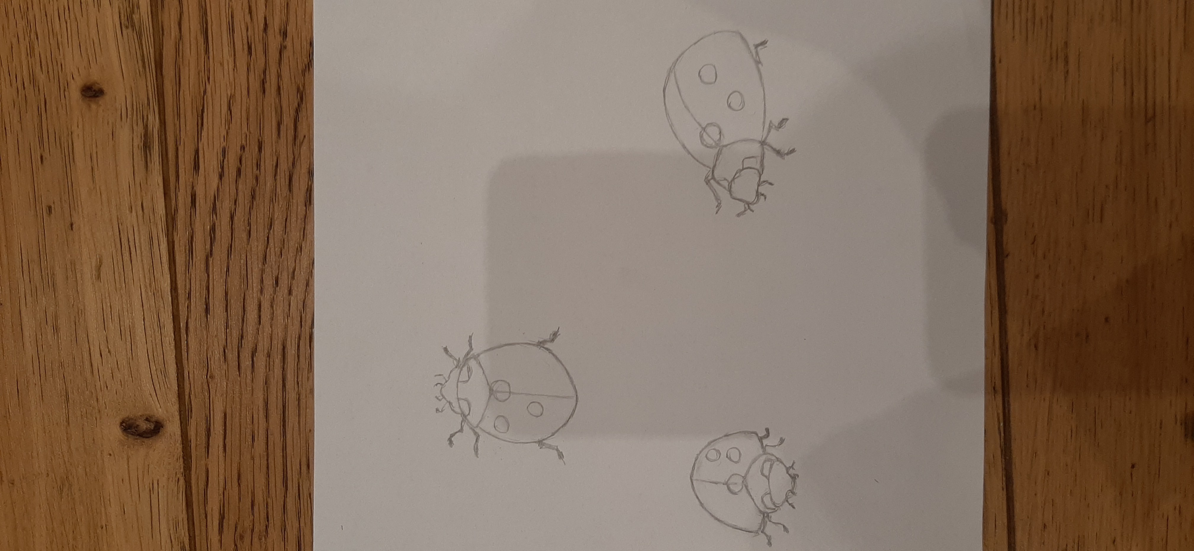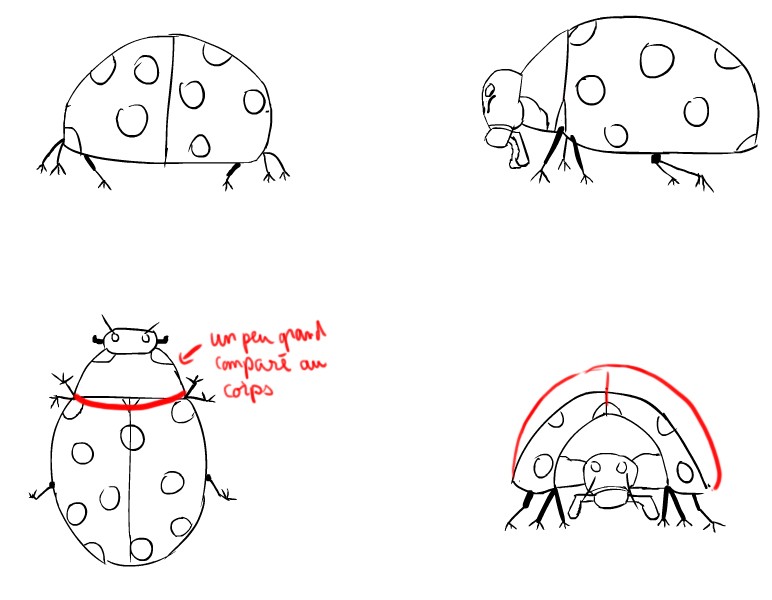 En haut à gauche, la coccinelle en perspective est pas mal, mais le corps manque un peu de bombé sur le dessus. En haut à droite pour celle de profil, la tête et la zone noire derrière sont beaucoup trop grosses pour son corps qui paraît tout petit. Le corps est d'ailleurs pas assez bombé. Au milieu pour la vue de face le principe de la vue de face est compris, mais comme pour la vue de profil, la tête et la zone noire derrière sont énormes par rapport au corps, qui lui manque de bombé sur le dessus.