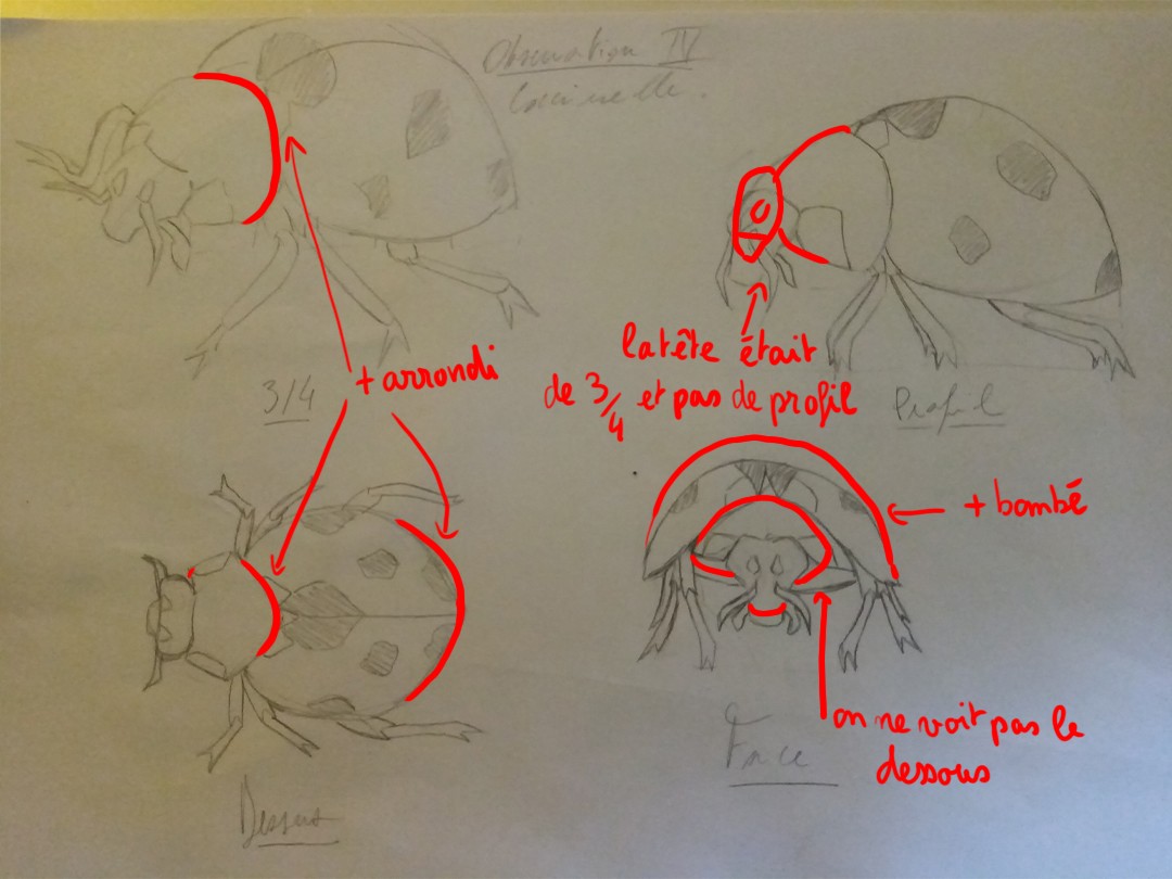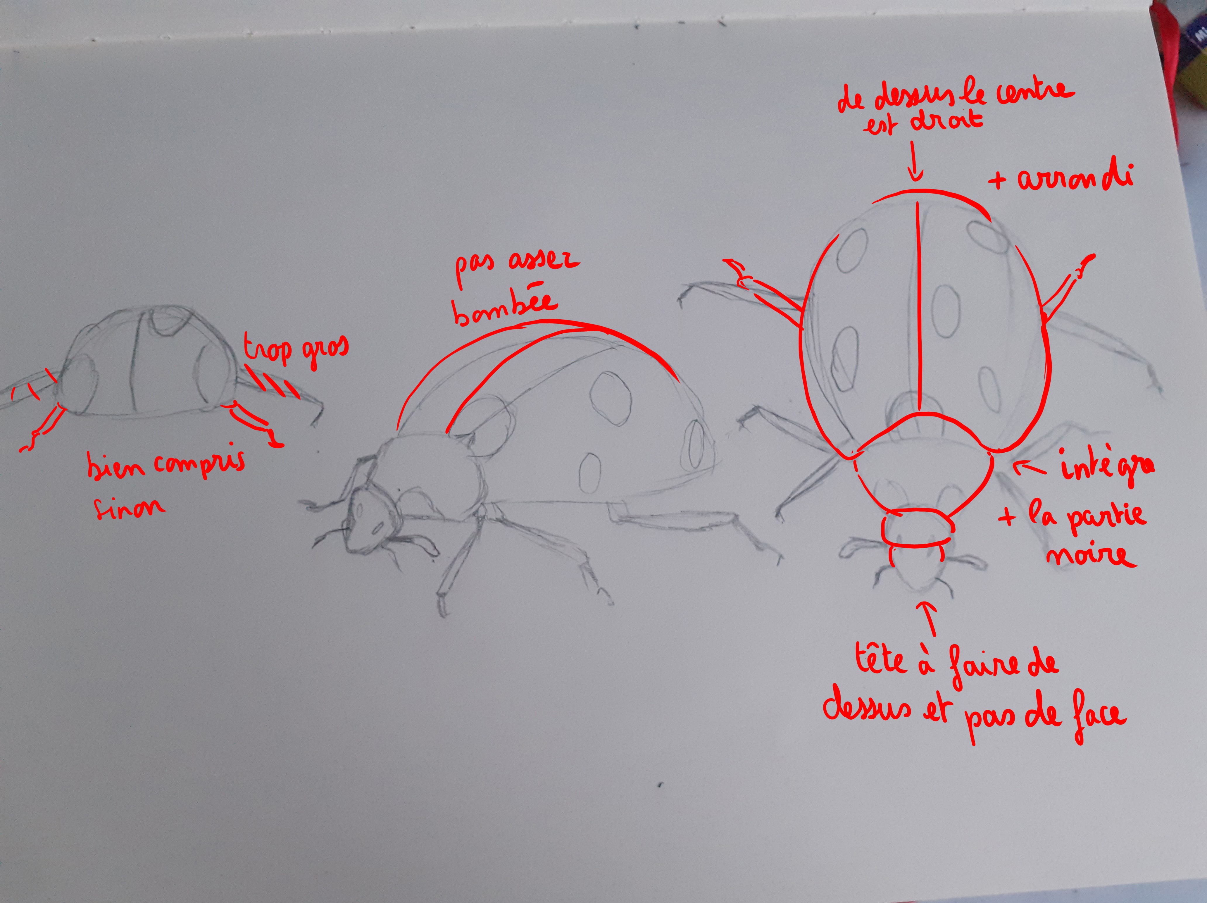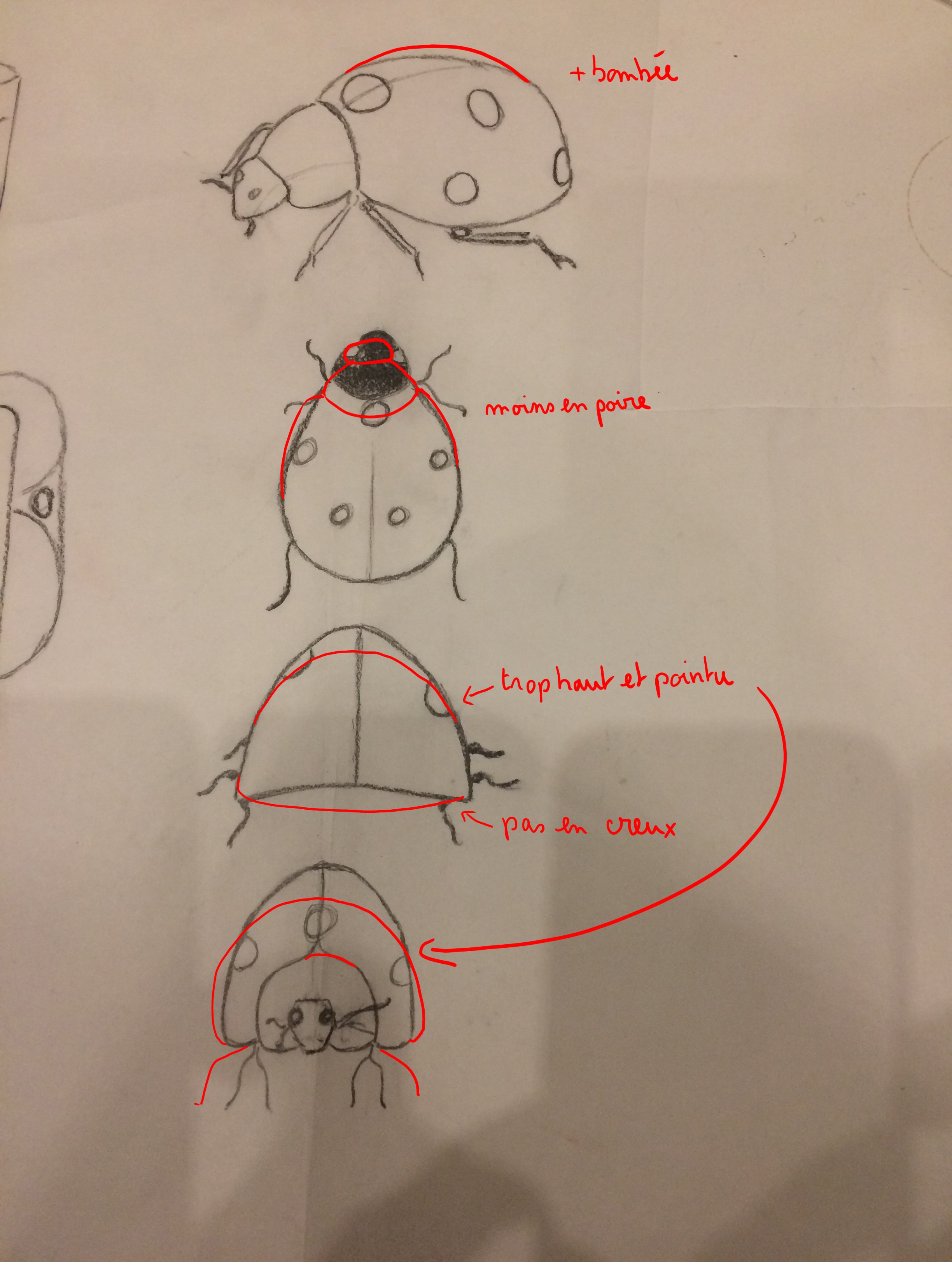 C'est pas mal, la construction de la coccinelle est bien comprise :) Il y a surtout des ajustements de formes à faire, que je t'ai annotés visuellement, dis moi si tu as une question. Pour bien juger si tu as tout compris il me manquerait juste une vue de face ^^