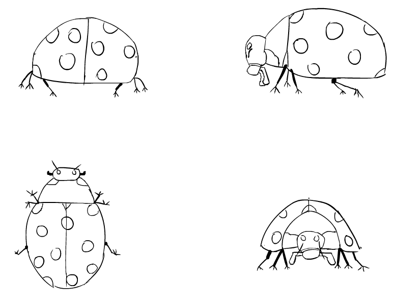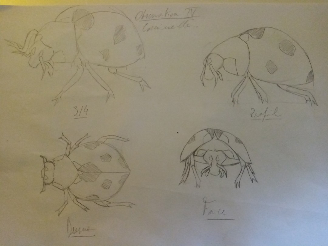 C'est très bien tout ça, la coccinelle est bien comprise :) La seul vue où j'ai un léger doute est la vue de dos. Elle devait être bien en face comme pour la vue de face ou un peu de dessus ? Car si la volonté était de la faire bien "en face", les pattes les plus hautes devraient se poser plus basses un peu plus sur la même ligne. Aussi, le corps de la coccinelle devrait être moins arrondi en bas un peu comme la vue de face. Dans tous les cas le corps manque un peu de bombé. Sinon l'exercice est nickel, bravo :)