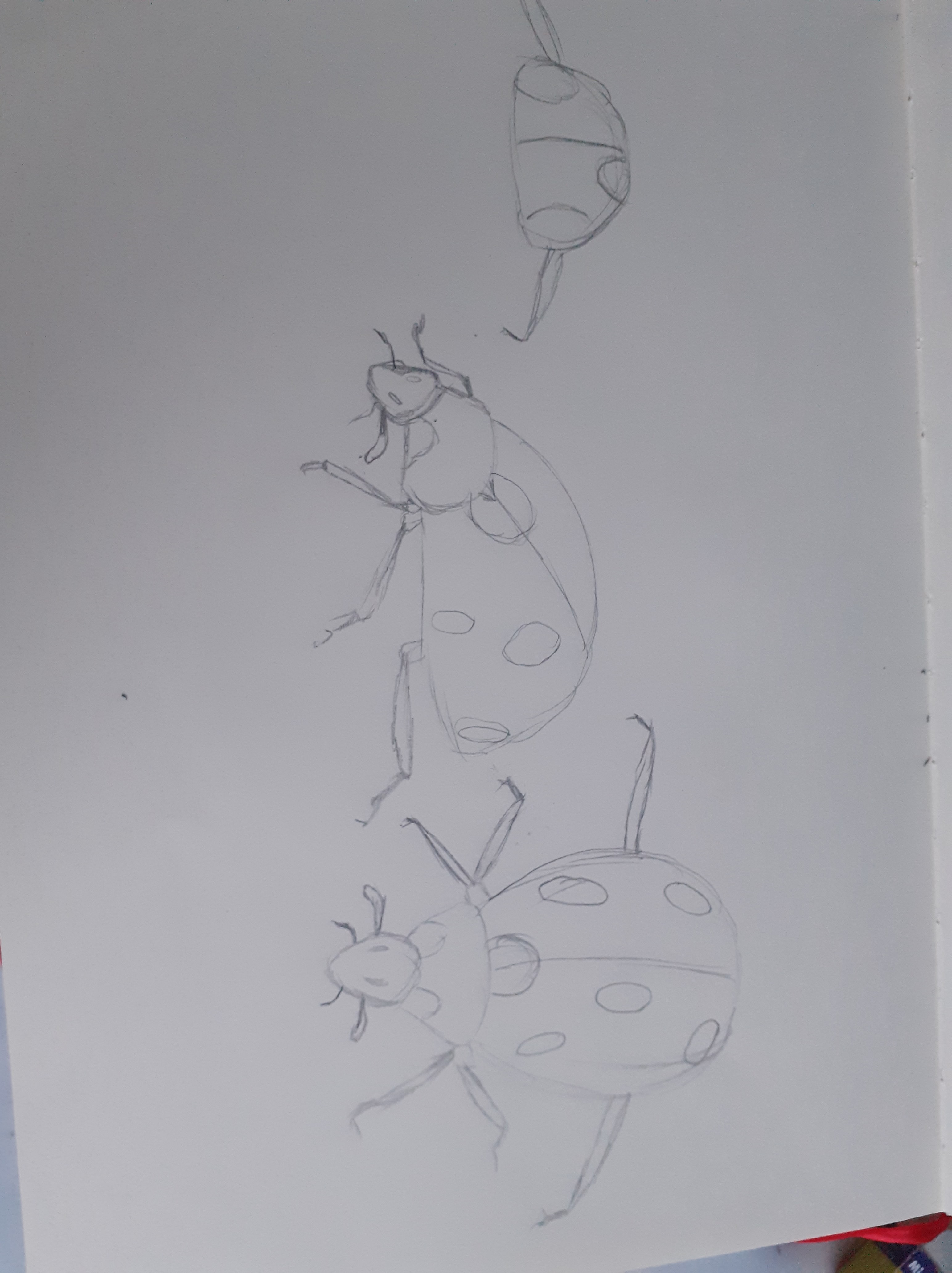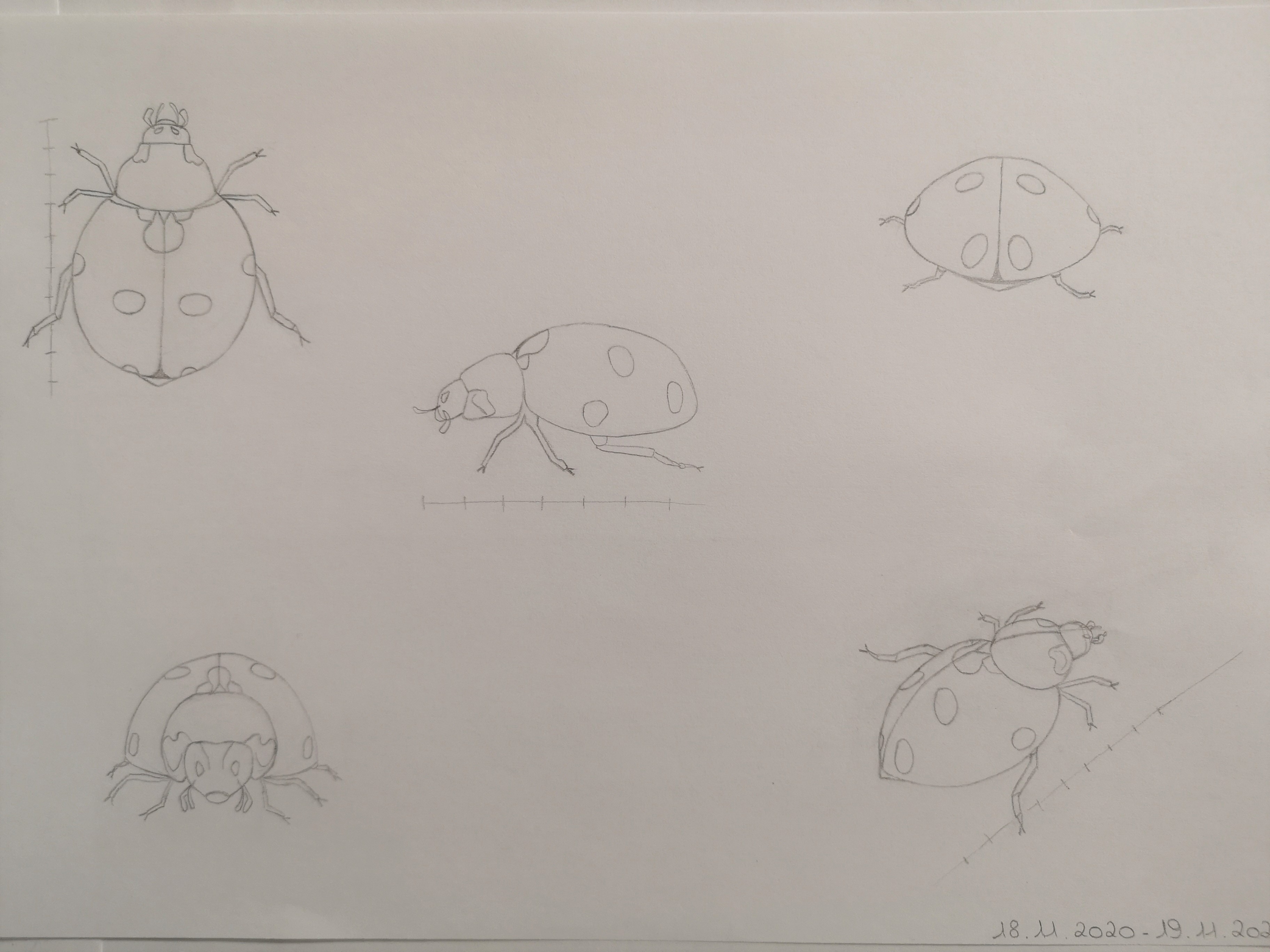 Buen día ! Aquí están mis bocetos de coccinelle. No siempre es fácil encontrar las formas correctas y especialmente dibujar las piernas, pero espero que el resultado esté cerca de la realidad :-)