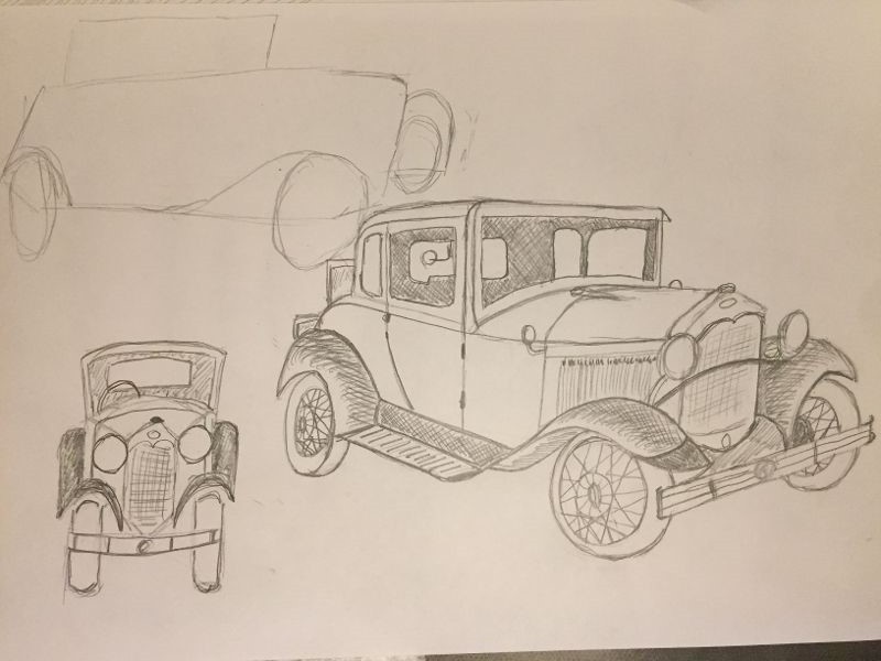 Au début, la voiture que je donne en exo fais peur à tout le monde, mais en réalité elle n'est pas si complexe que cela à décomposer, car ses grands volumes ont l'air "emboîtés" les uns dans les autres. Avec les voitures plus modernes, tout est en courbes et en fluiditié... Difficile de décomposer et d'identifier les grands volumes et les grandes formes !