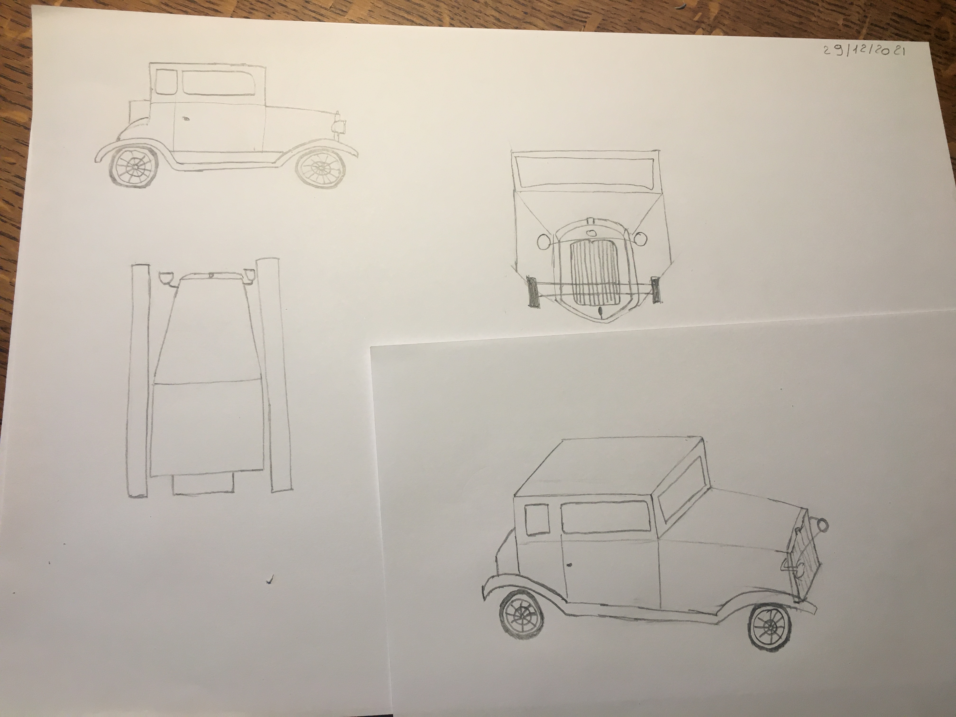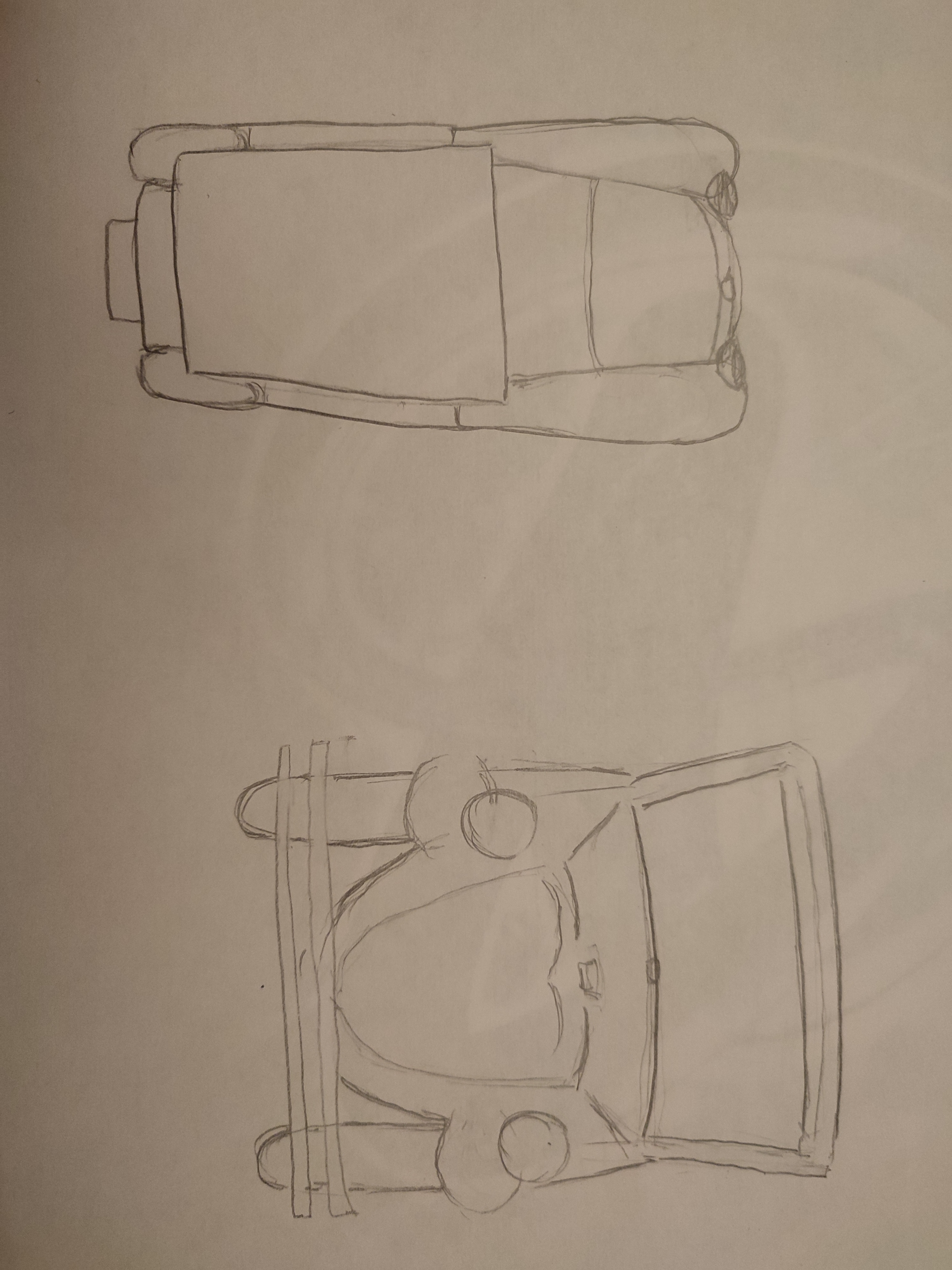 Bonjouuur, voilà ce que j'ai pu faire pour la voiture. Je suis étonnée de moi même je ne savais pas que je pourrais dessiner quelque chose d'aussi difficile ! la vue d'au-dessus est fausse je pense j'ai eu beaucoup beaucoup de mal, si je pouvais avoir des conseils ? En espérant que ce que j'ai fait soit juste