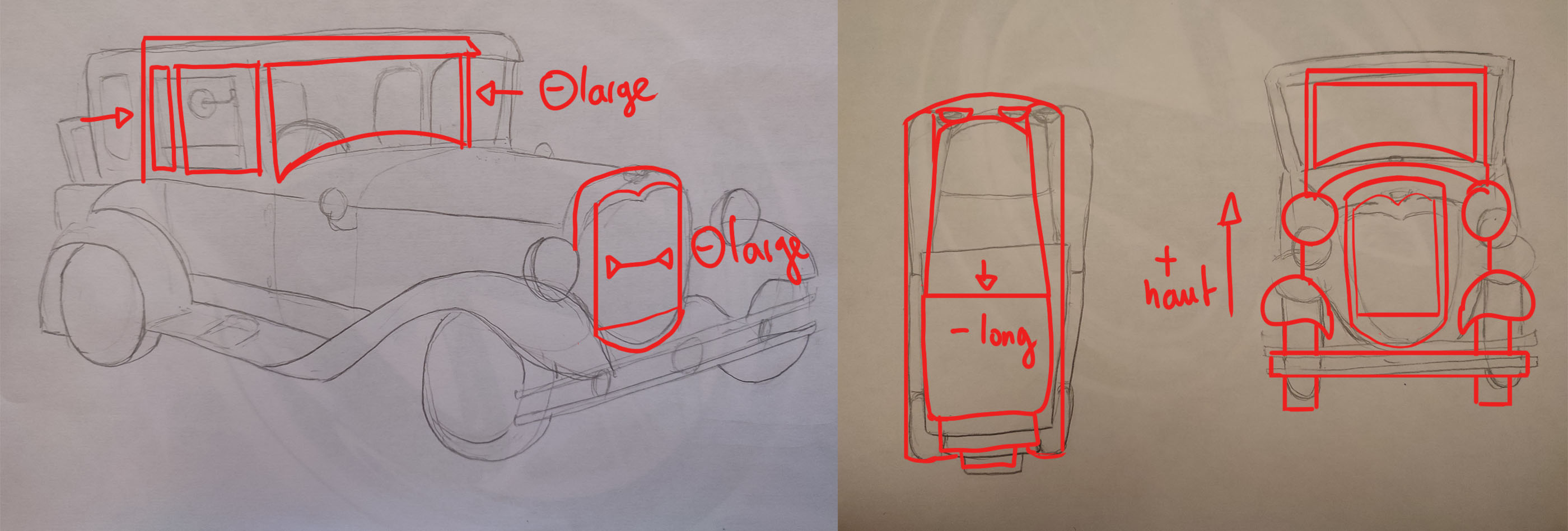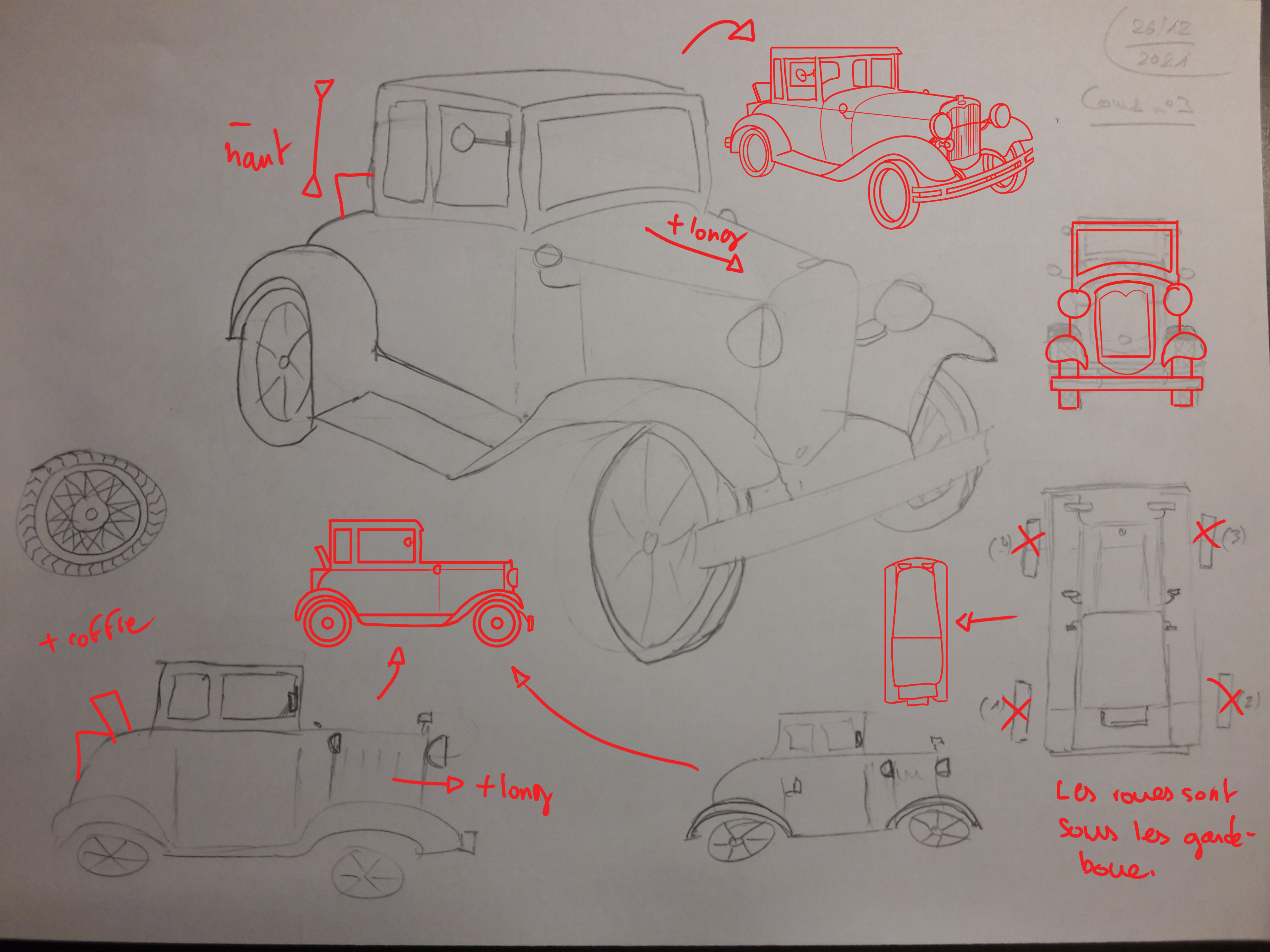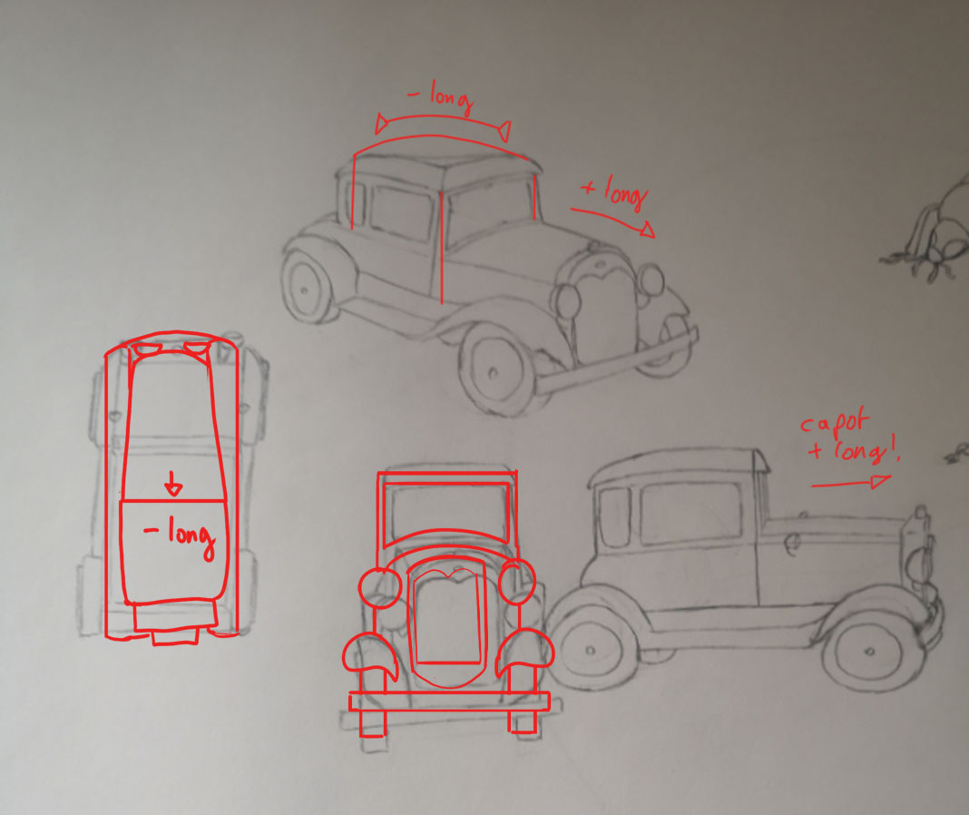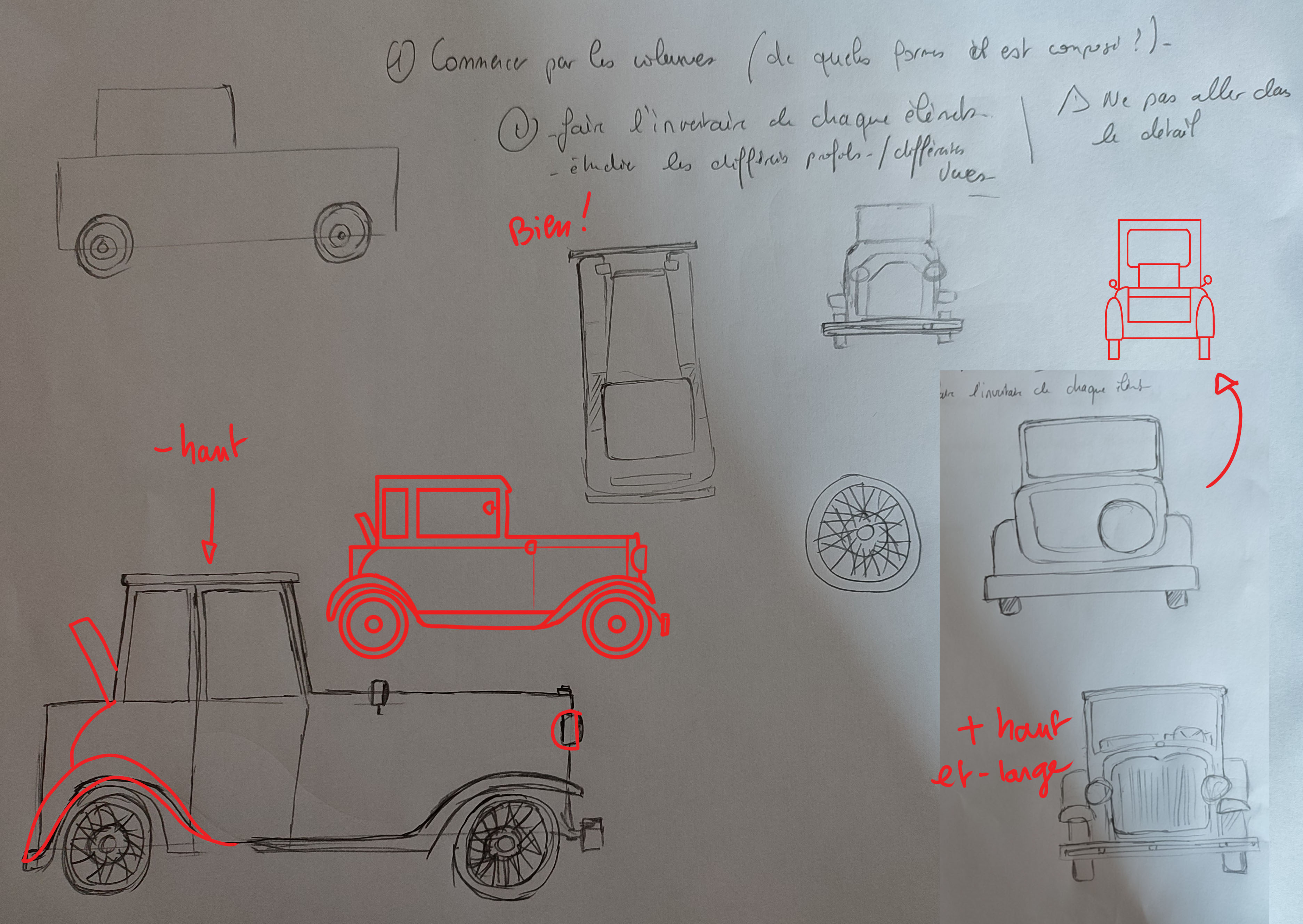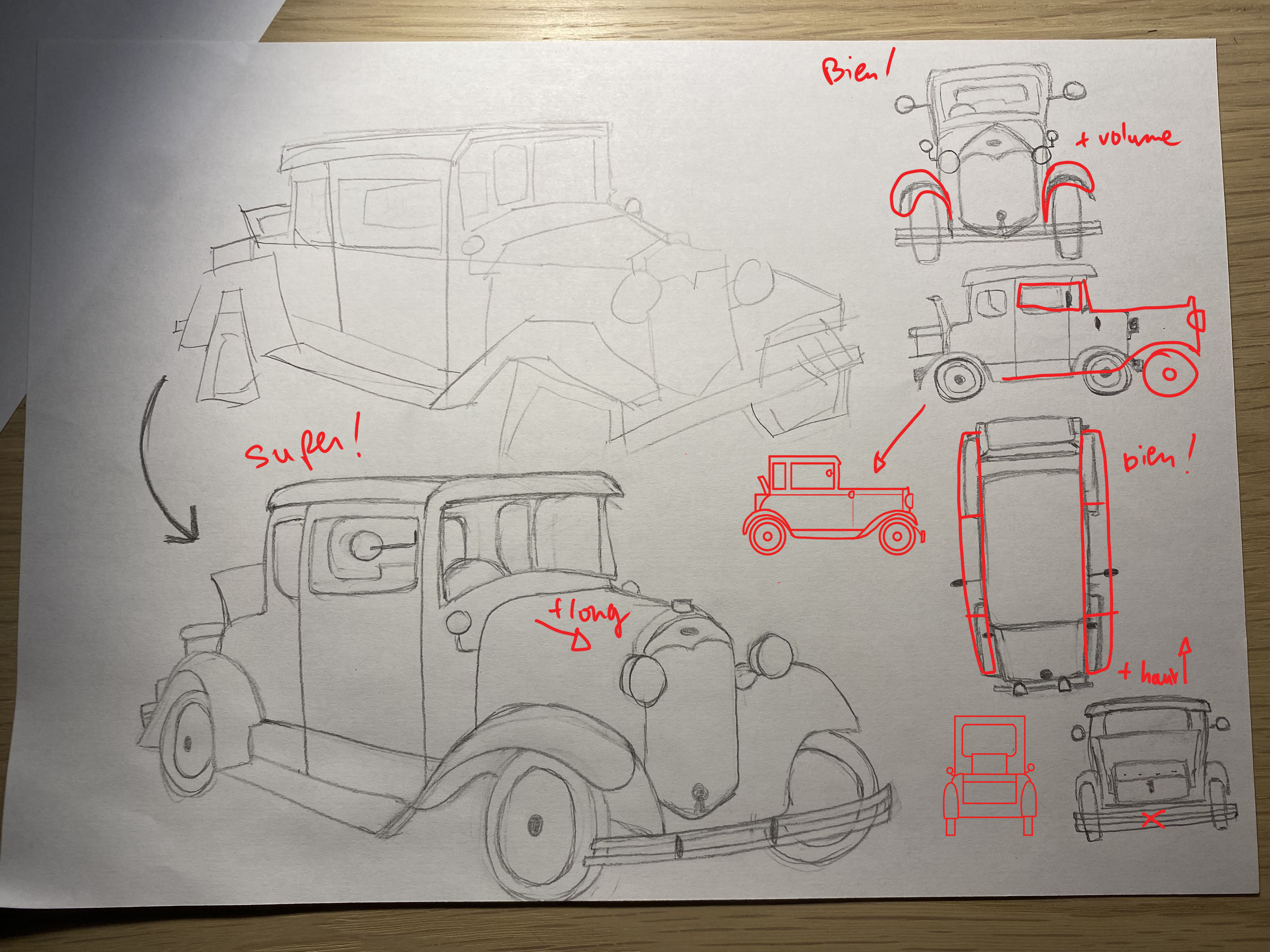 Les corrections que je t'ai faites sont surtout sur les proportions. Tu as eu tendance à un peu trop élargir la voiture.