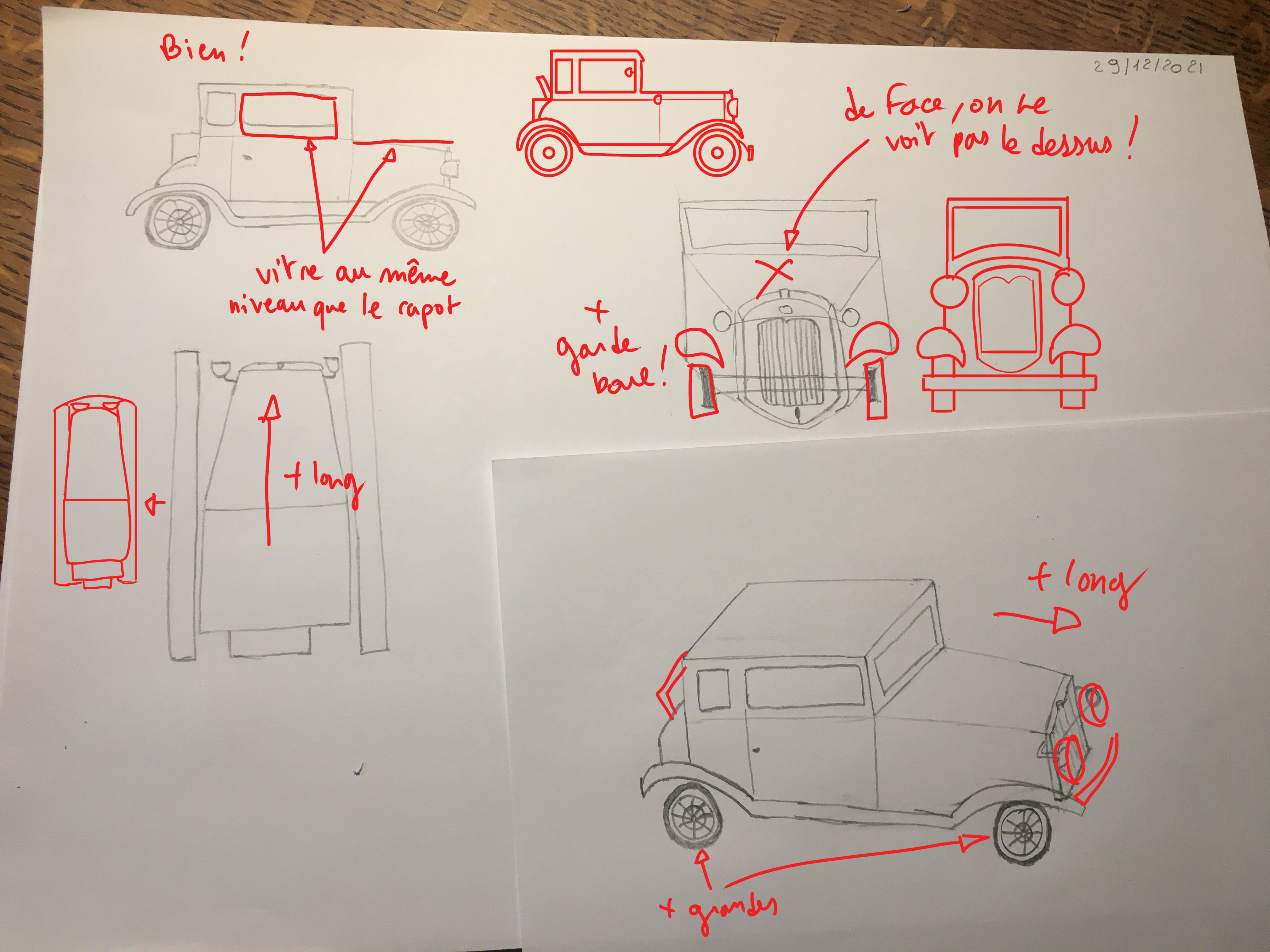 Hola damien33, Aquí está mi corrección dibujada ^^ Usted ha tendido a compactar el automóvil demasiado compacto, de hecho es muy largo.