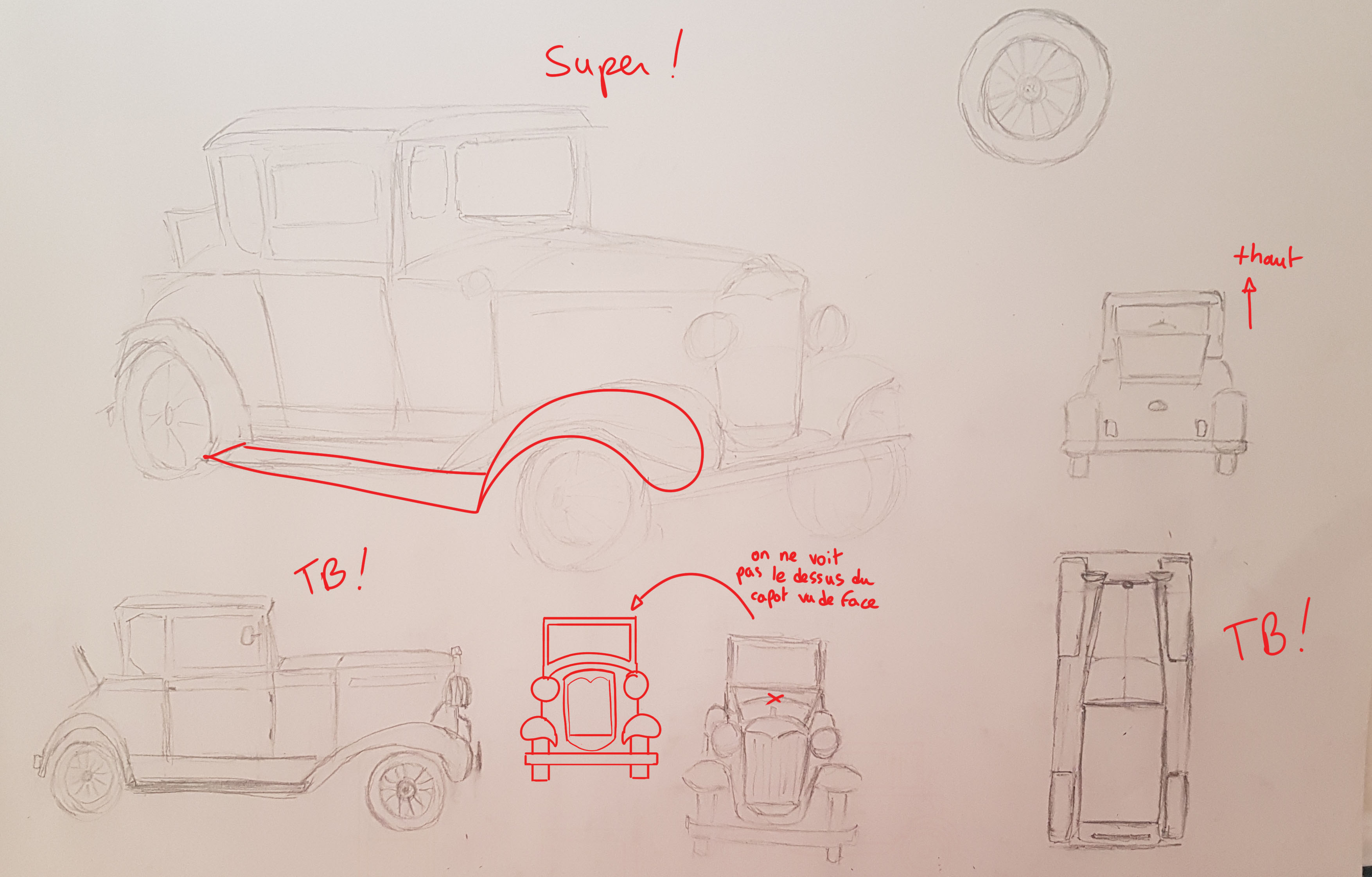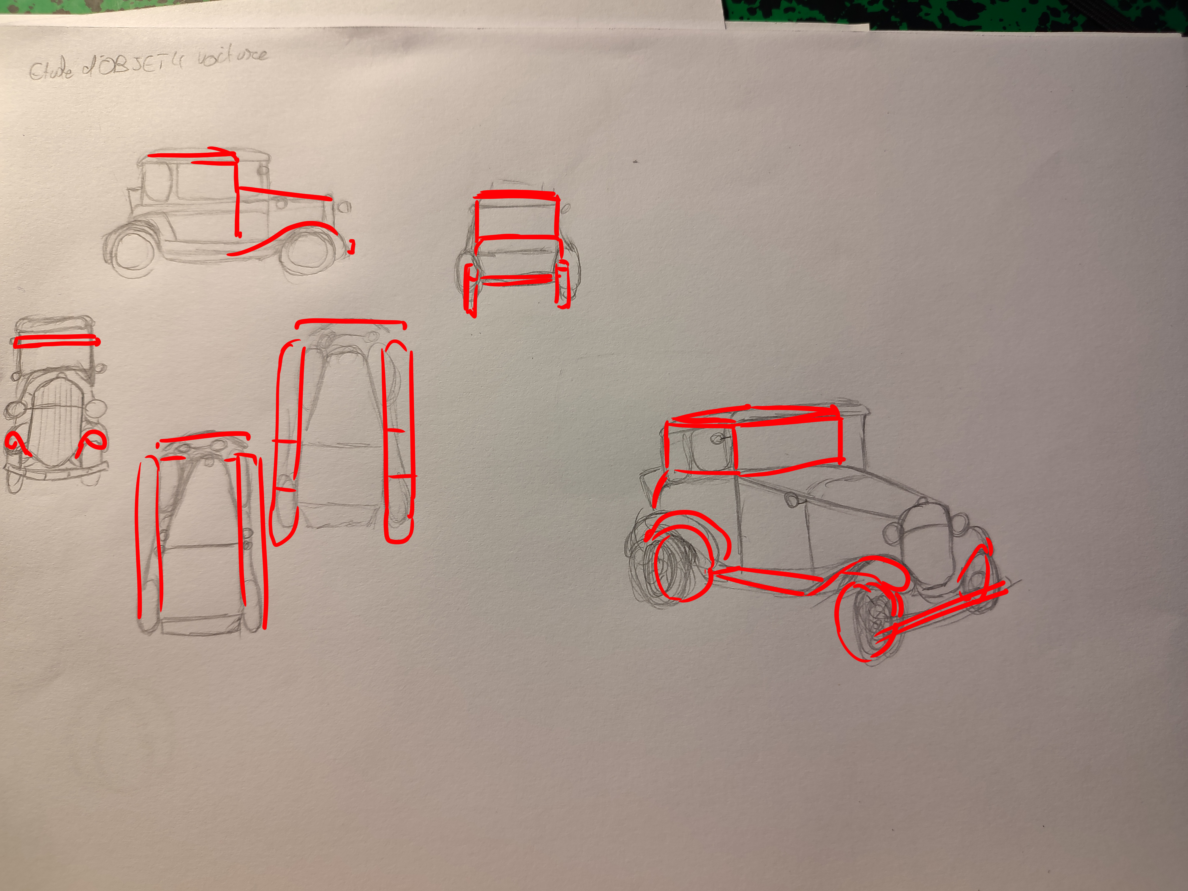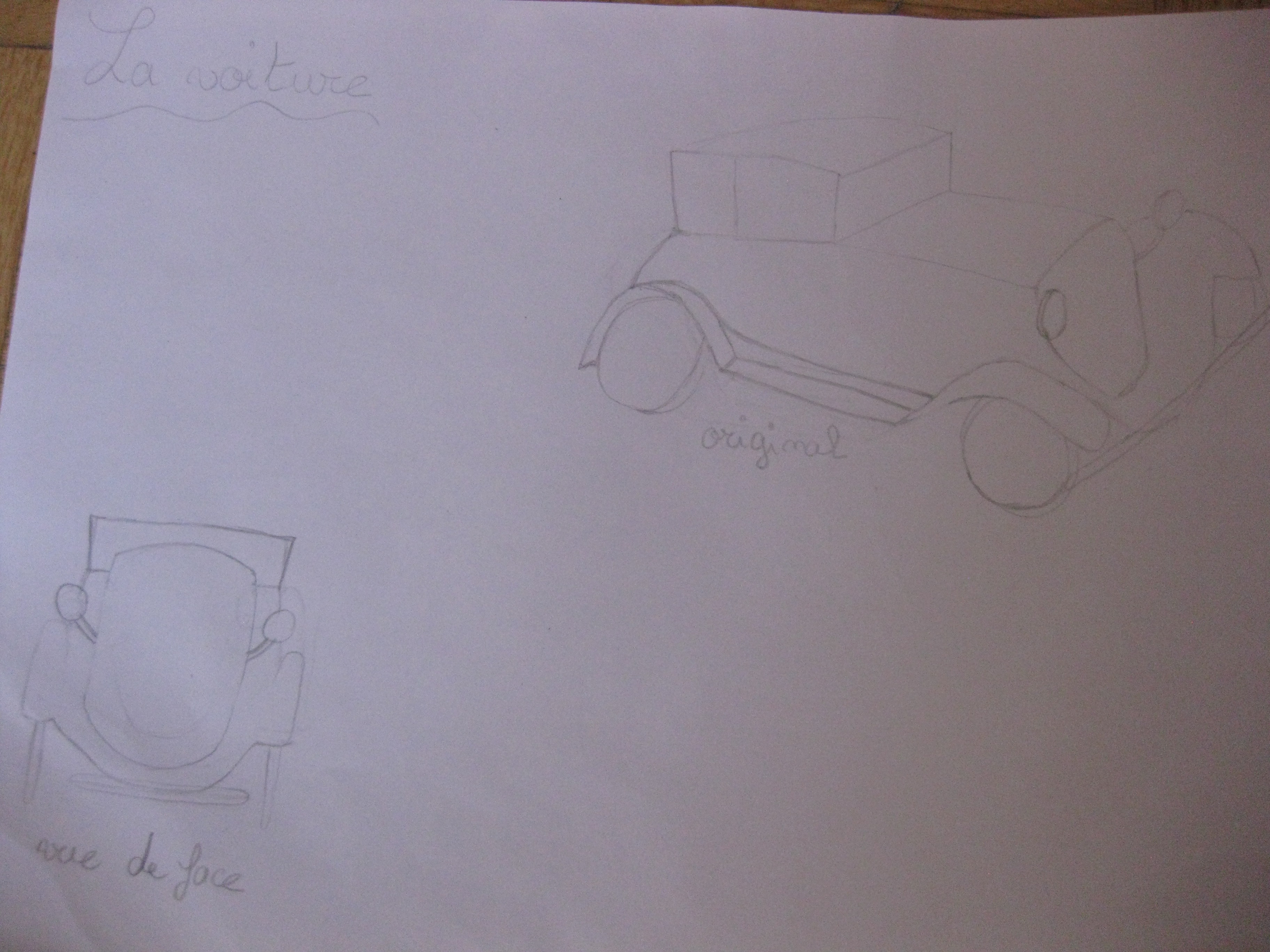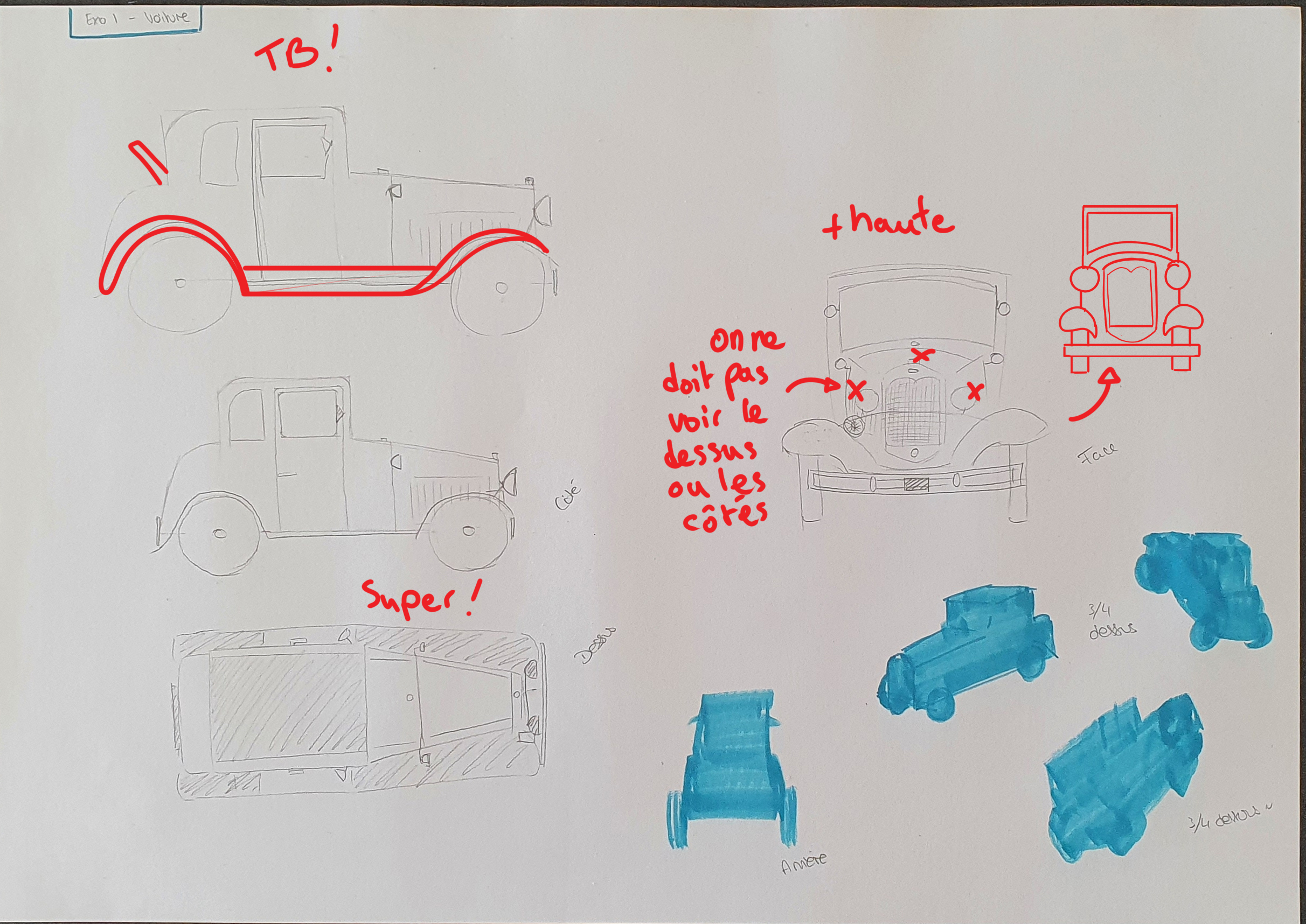 Ci-joint ma planche pour la voiture. Au vu des explications de Grégoire en vidéo, j'ai normalement capté les formes principales. J'ai ensuite ajouté quelques détails, mais pas tous (les roues m'ont échappés par exemple). Je complèterai plus tard au besoin.