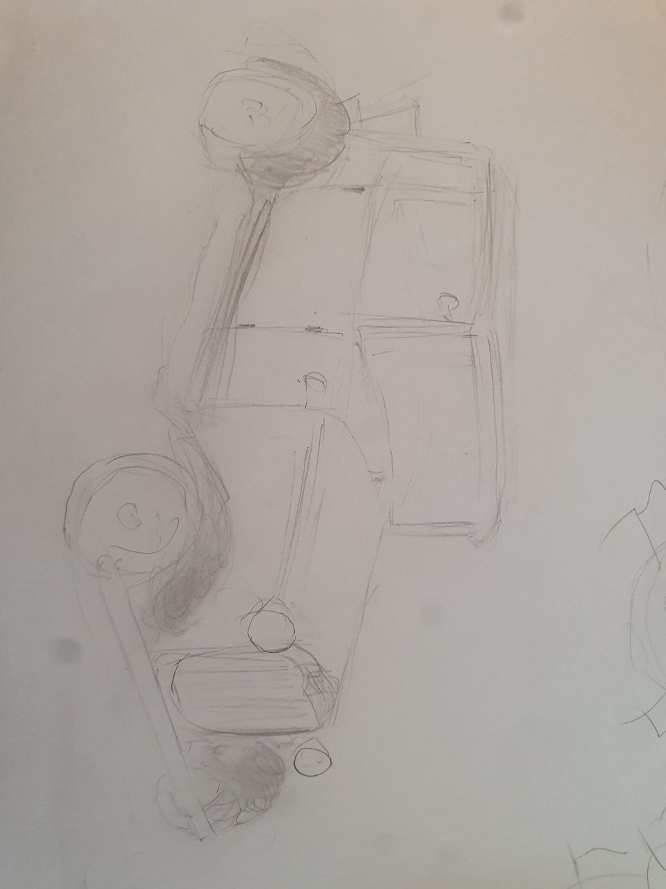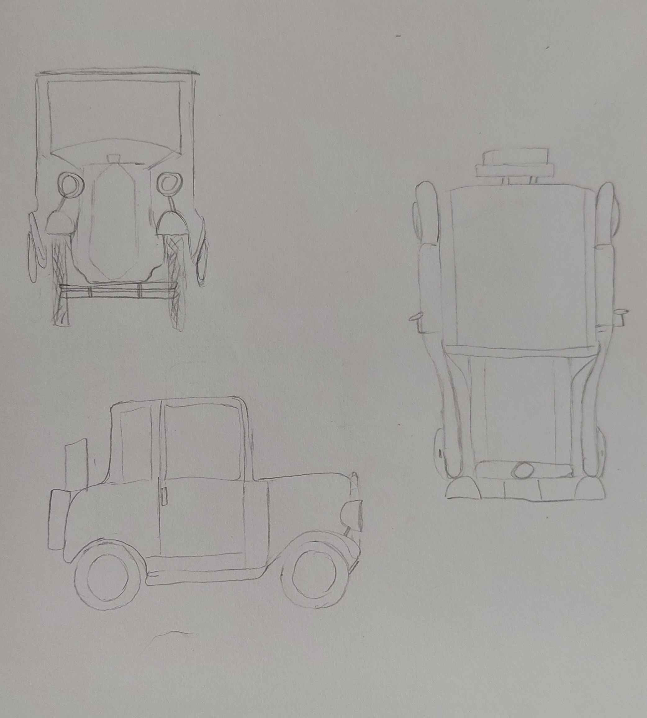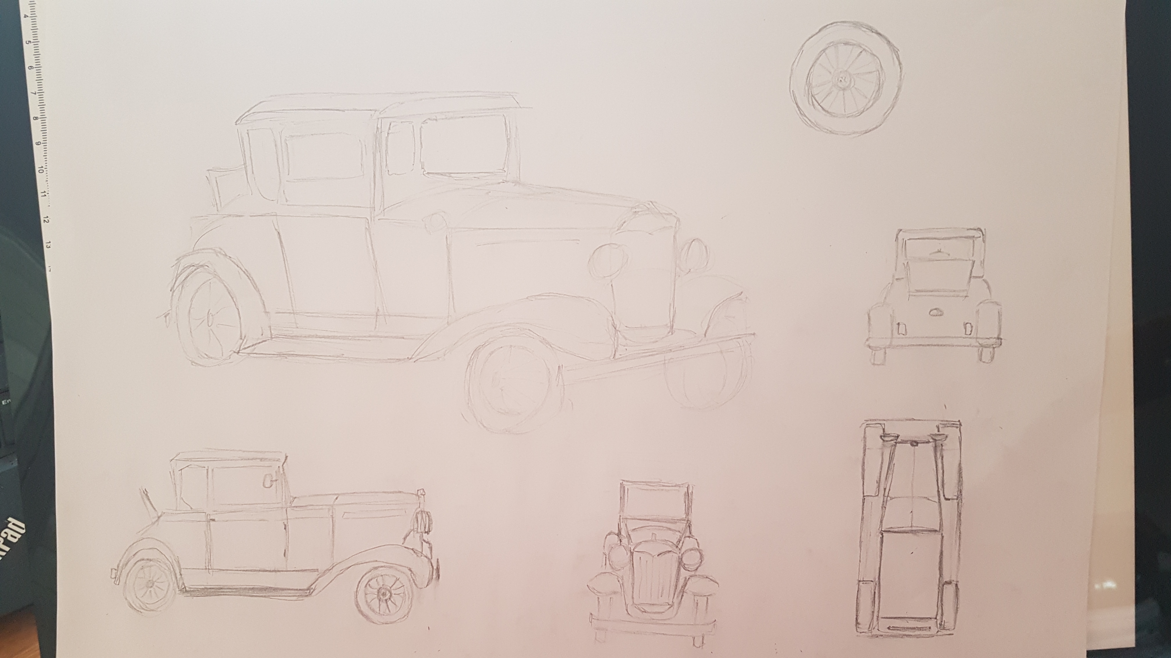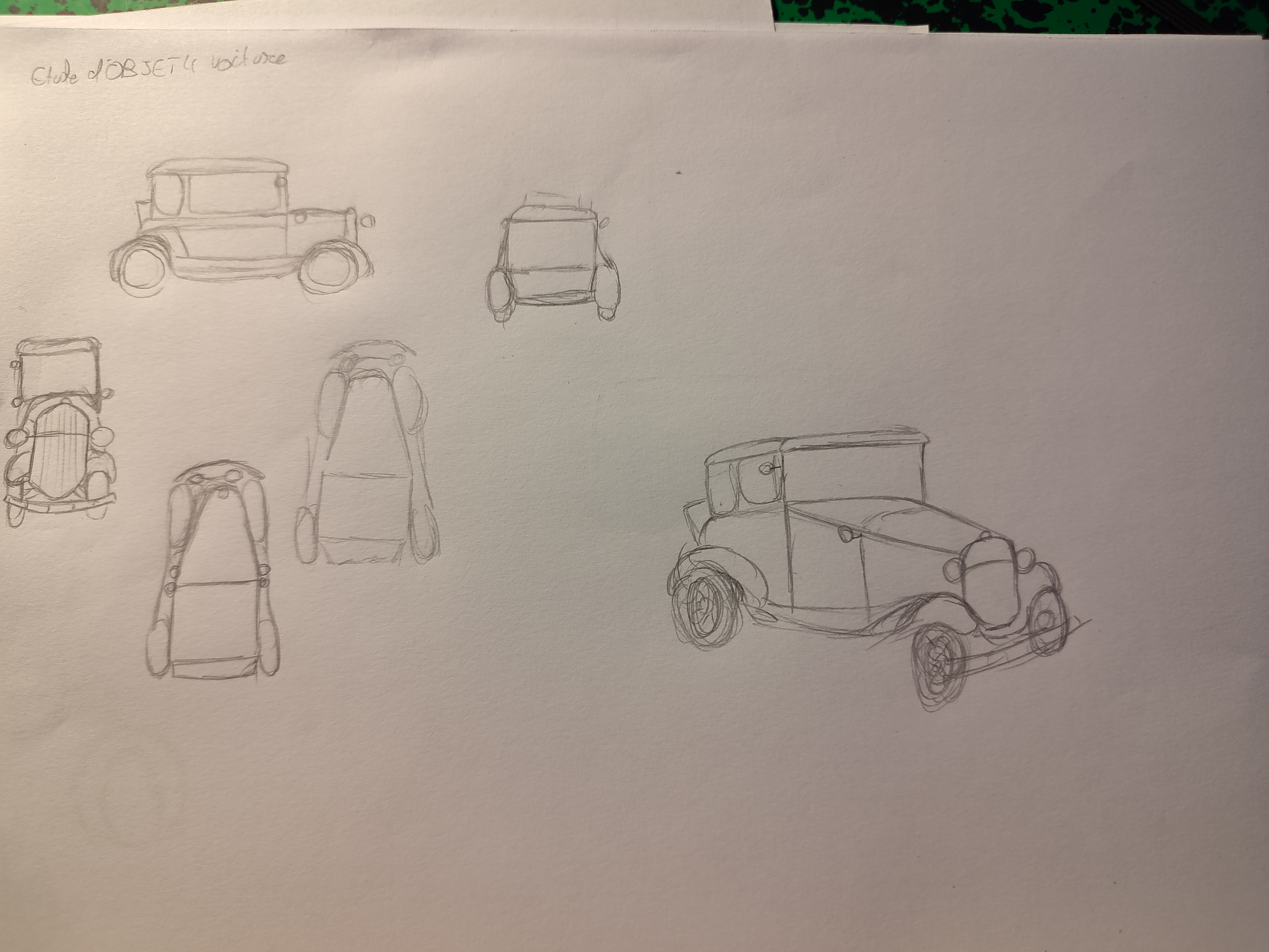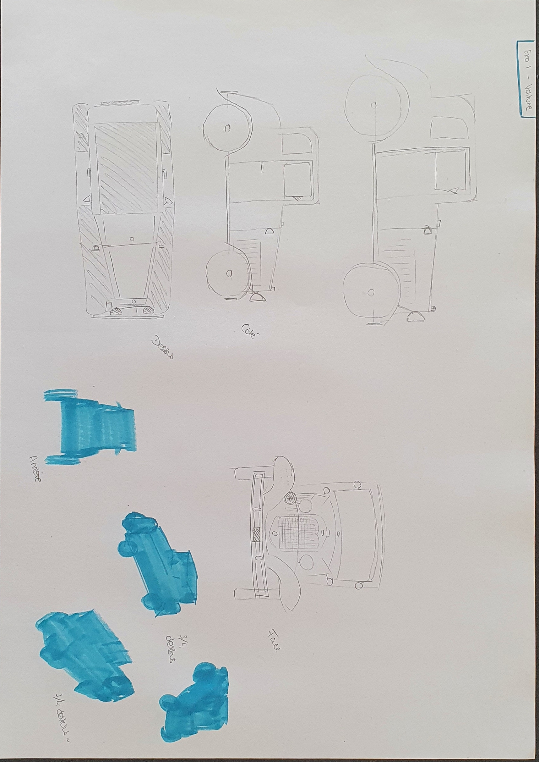 Ci-joint ma planche pour la voiture. Au vu des explications de Grégoire en vidéo, j'ai normalement capté les formes principales. J'ai ensuite ajouté quelques détails, mais pas tous (les roues m'ont échappés par exemple). Je complèterai plus tard au besoin.