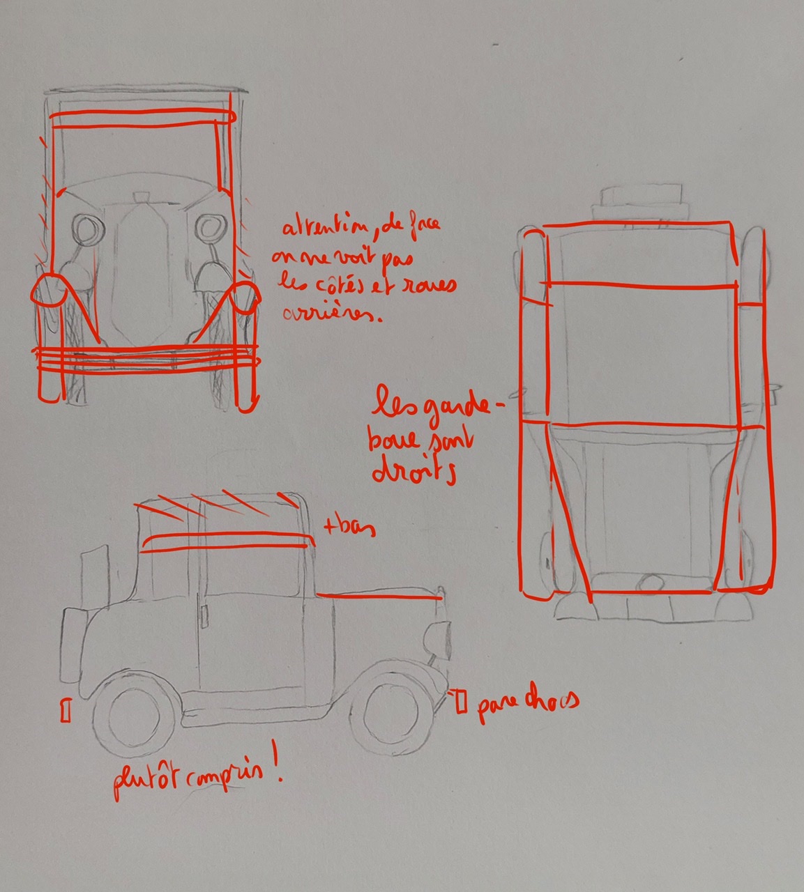 Joli travail ! J'ai corrigé quelques soucis de proportions et perspective, les garde-boue qui doivent aller droit, mais sinon la construction est bien comprise 😀