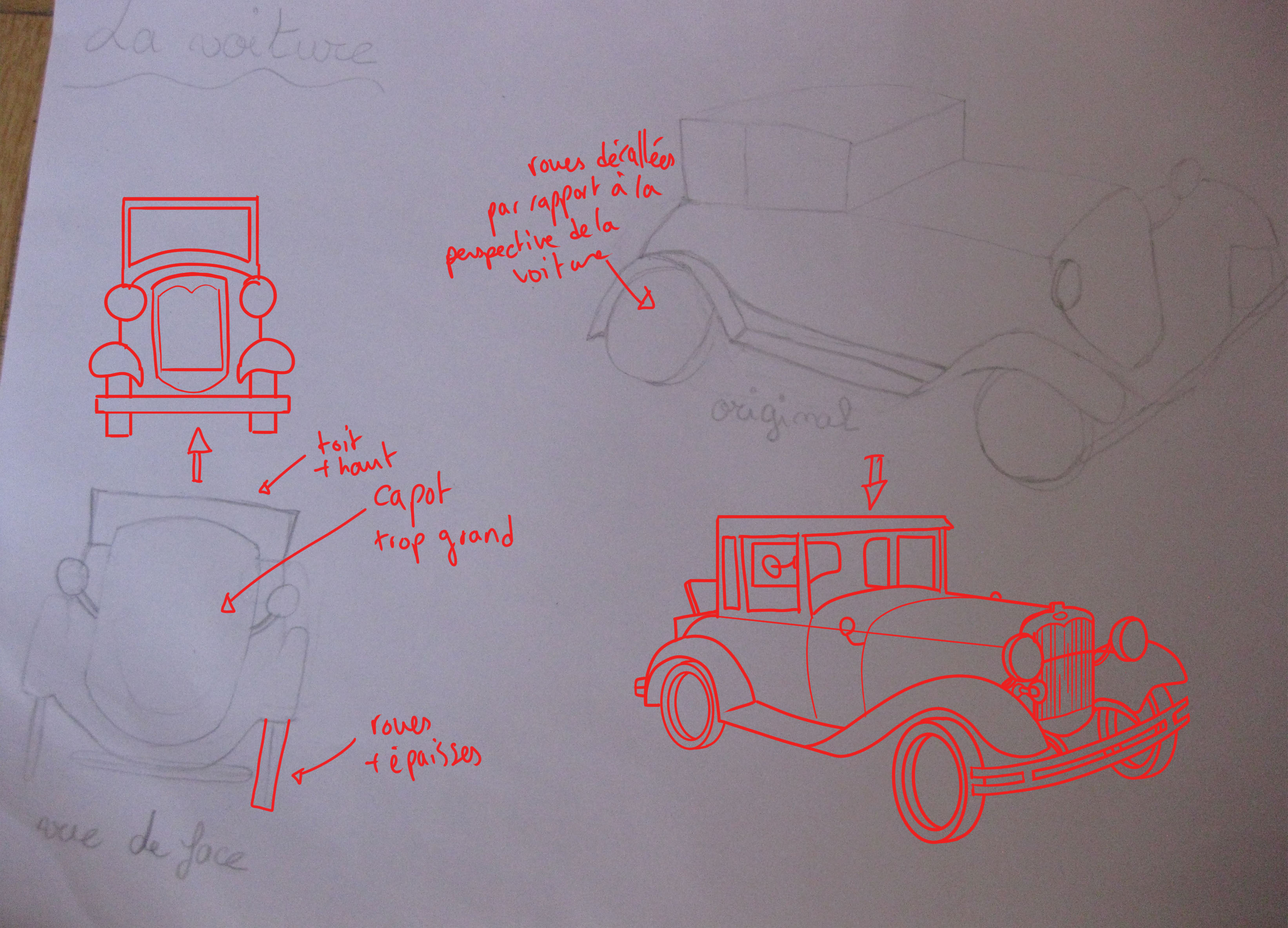 Y sí, el auto no es fácil, ¡pero el ejercicio parece bastante entendido! Corregí visualmente algunas inversiones y el punto de vista de ciertos elementos. En cualquier caso, ¡es un buen trabajo!