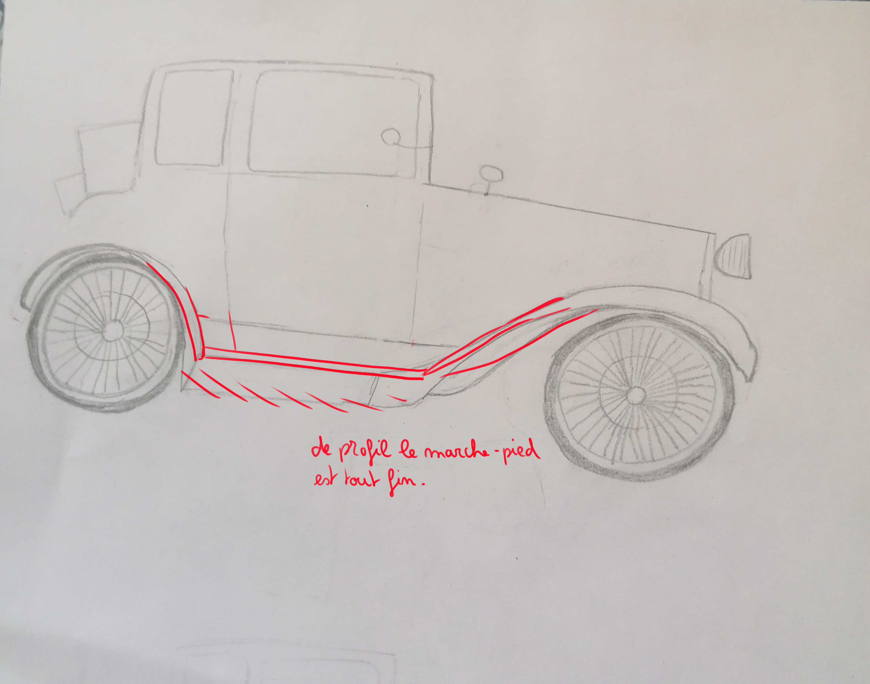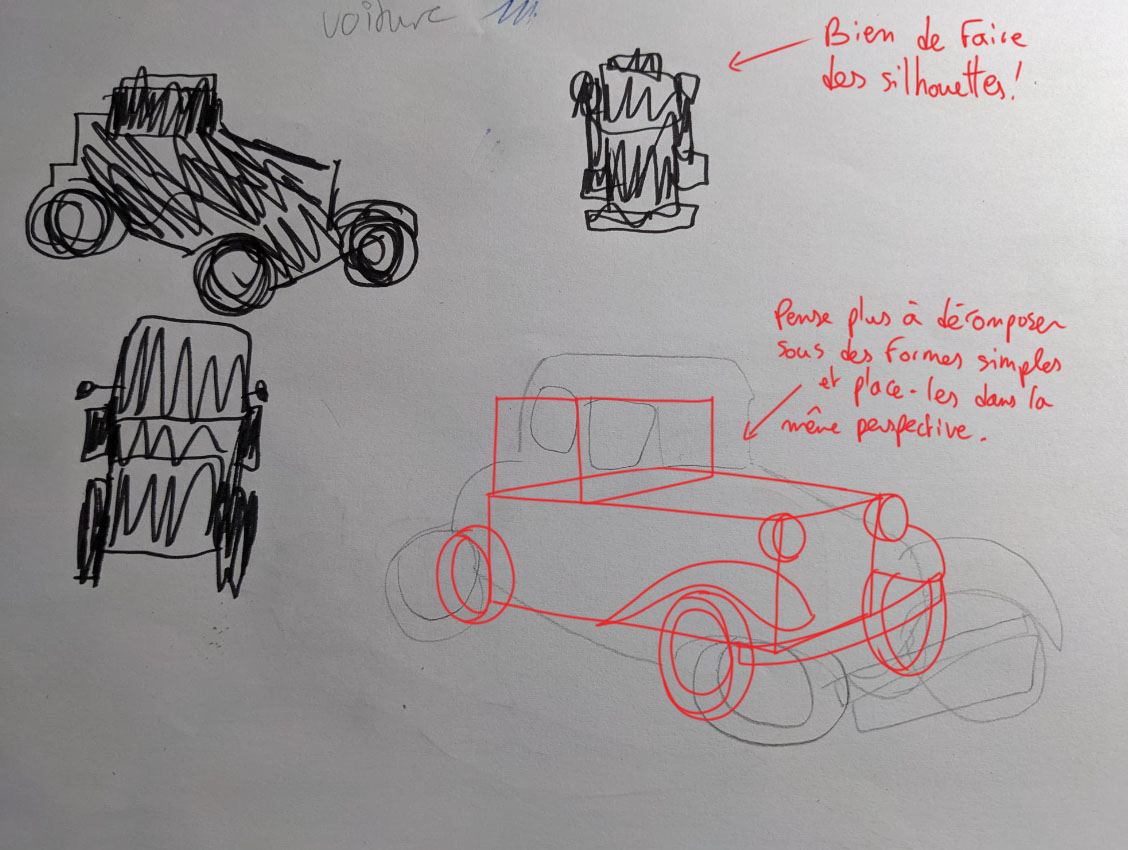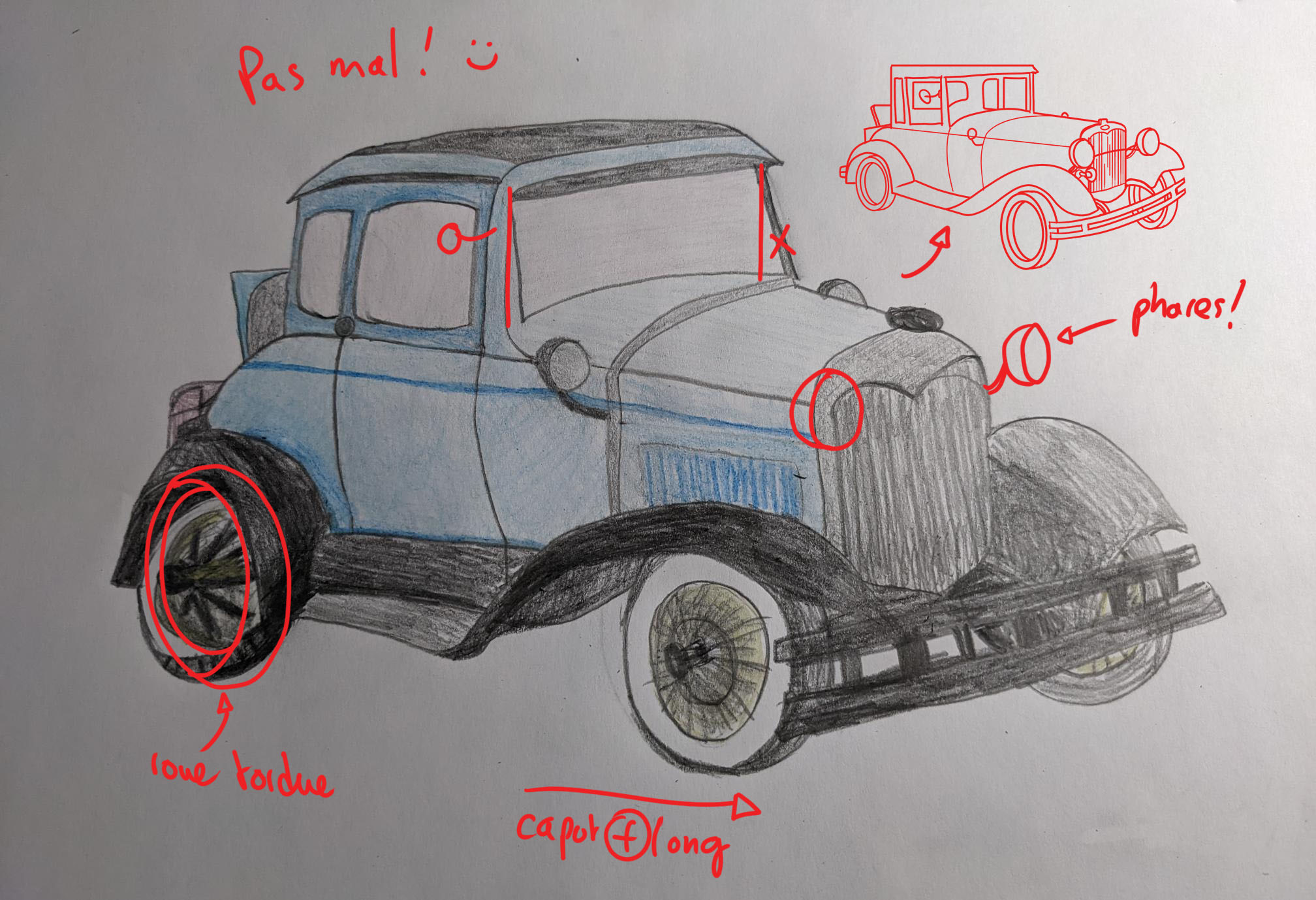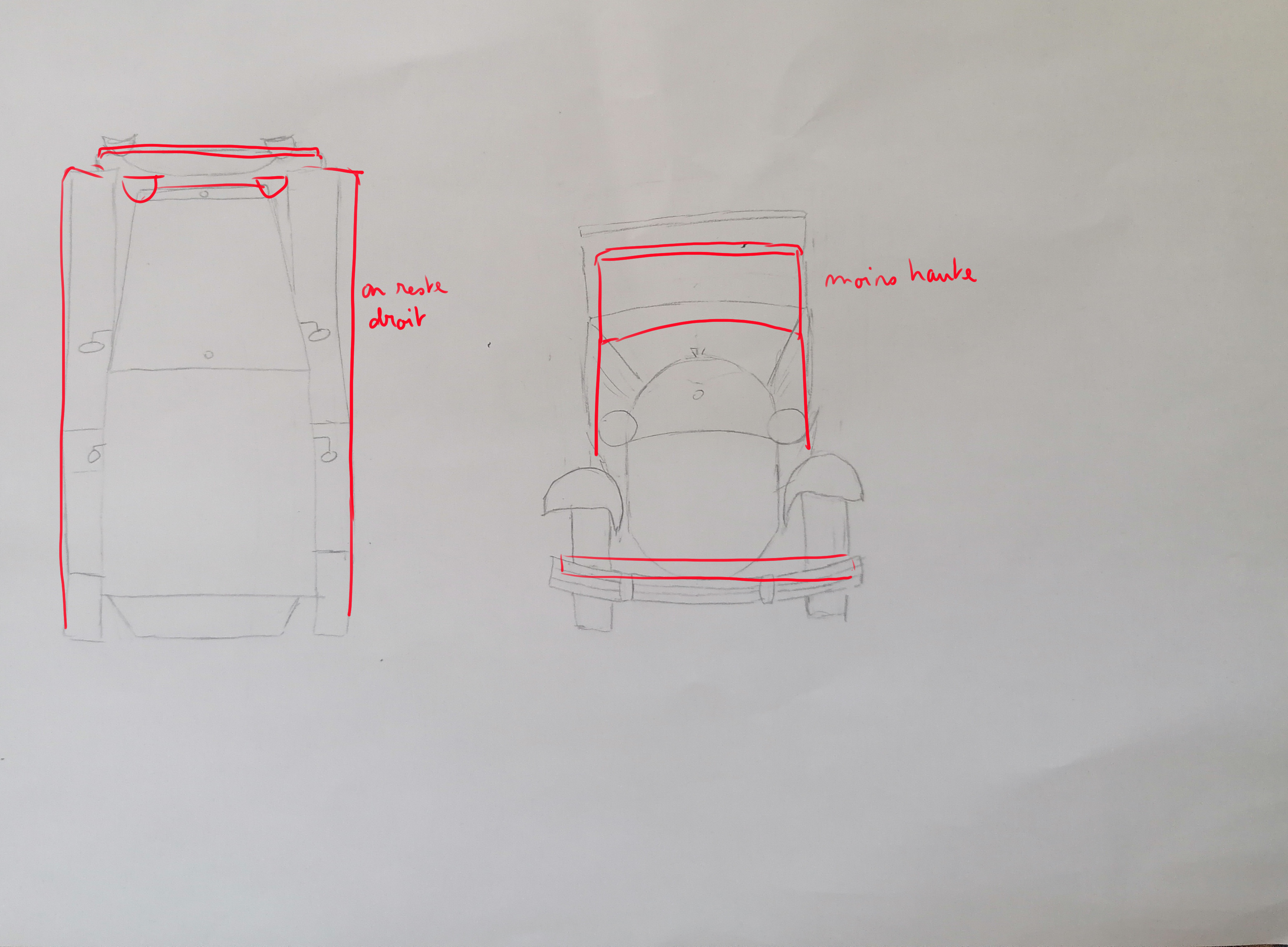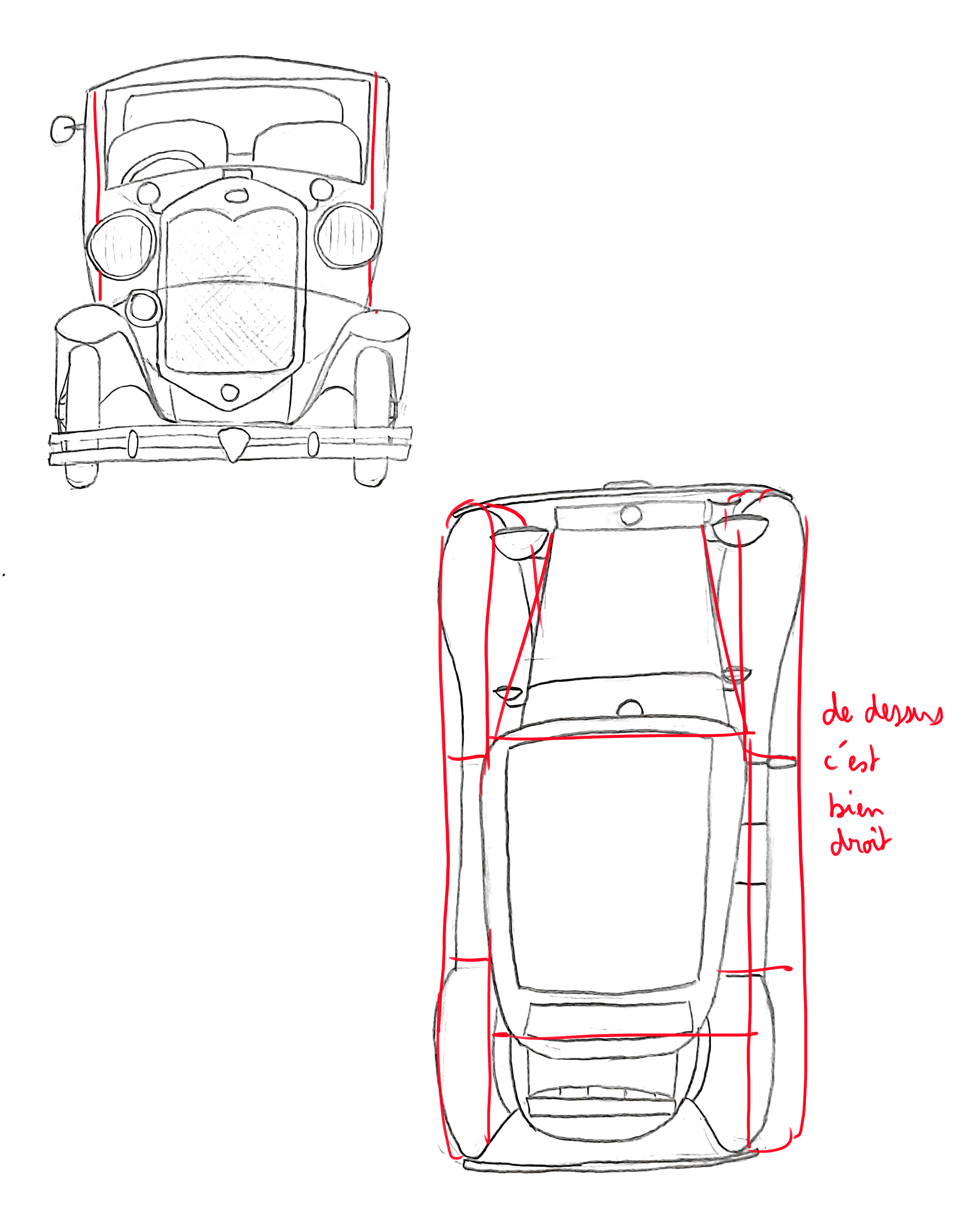 Super, c'est très bien! Je t'ai mis mes correctifs en images. Pour la vue du dessus, c'est du détail car tu as bien visualisé les formes et leur emplacement. C'est plus sur la vue de face où il y a quelques petites erreurs, notamment la position des gardes-boues qui doit être plus écartée sur les côtés.