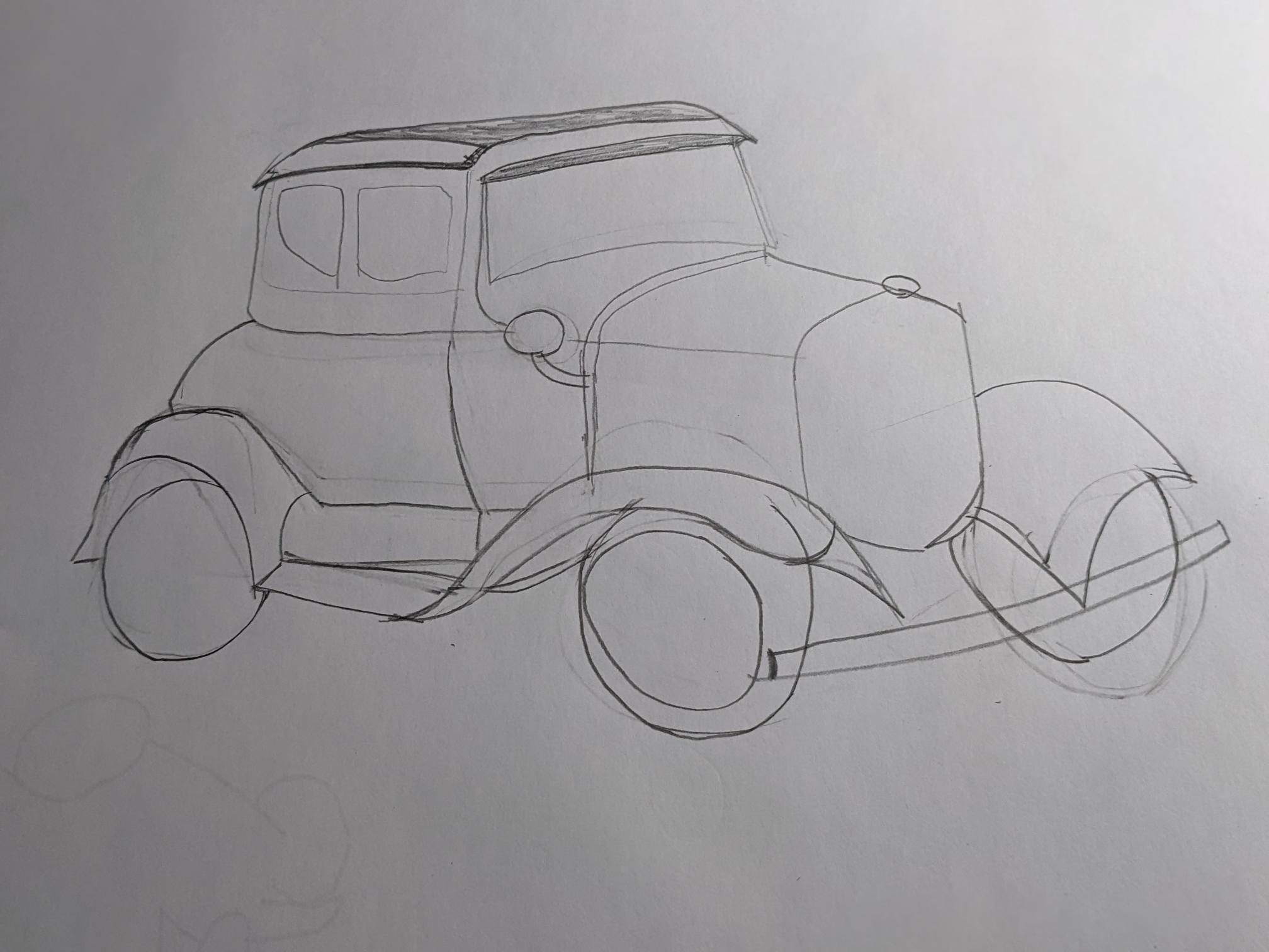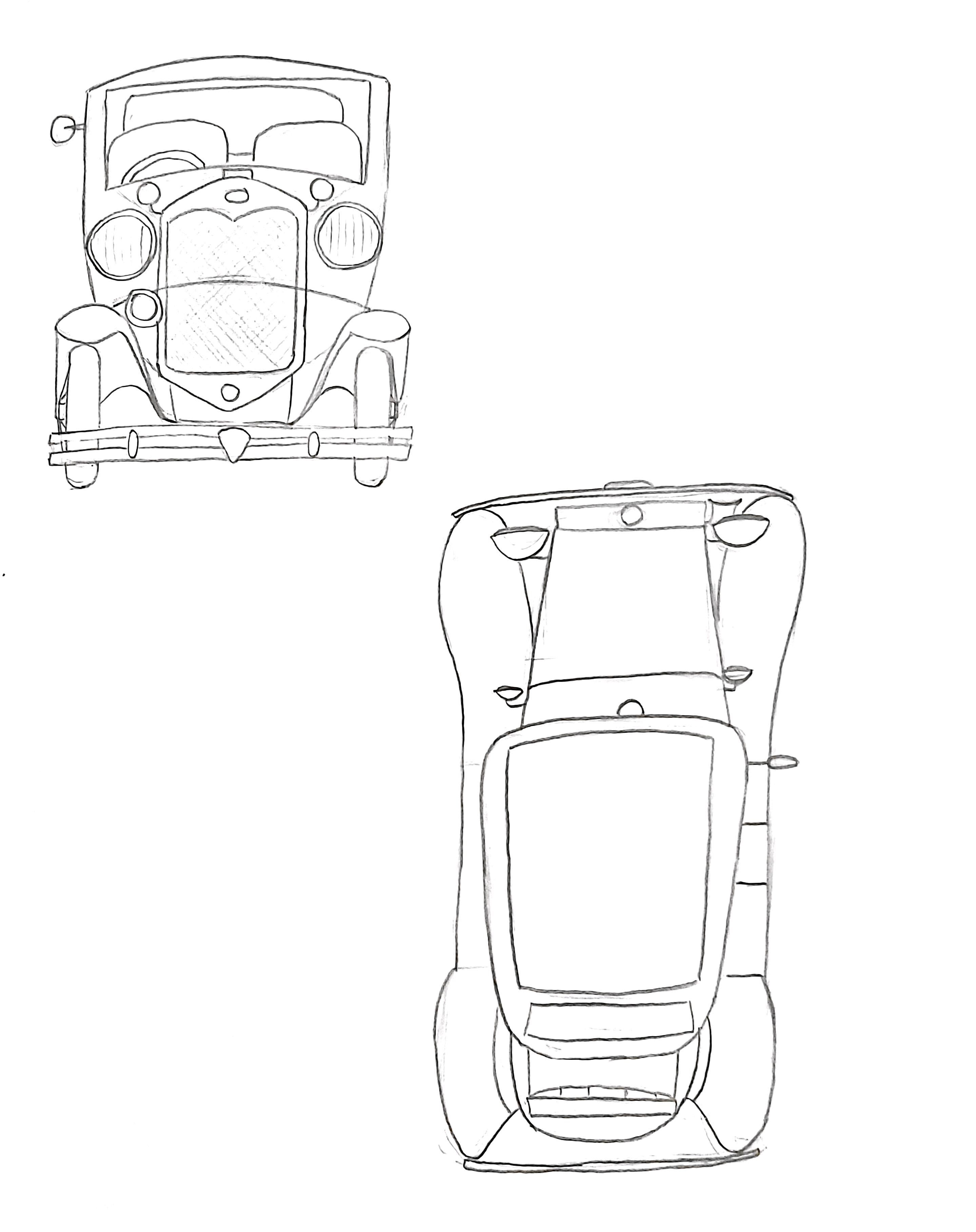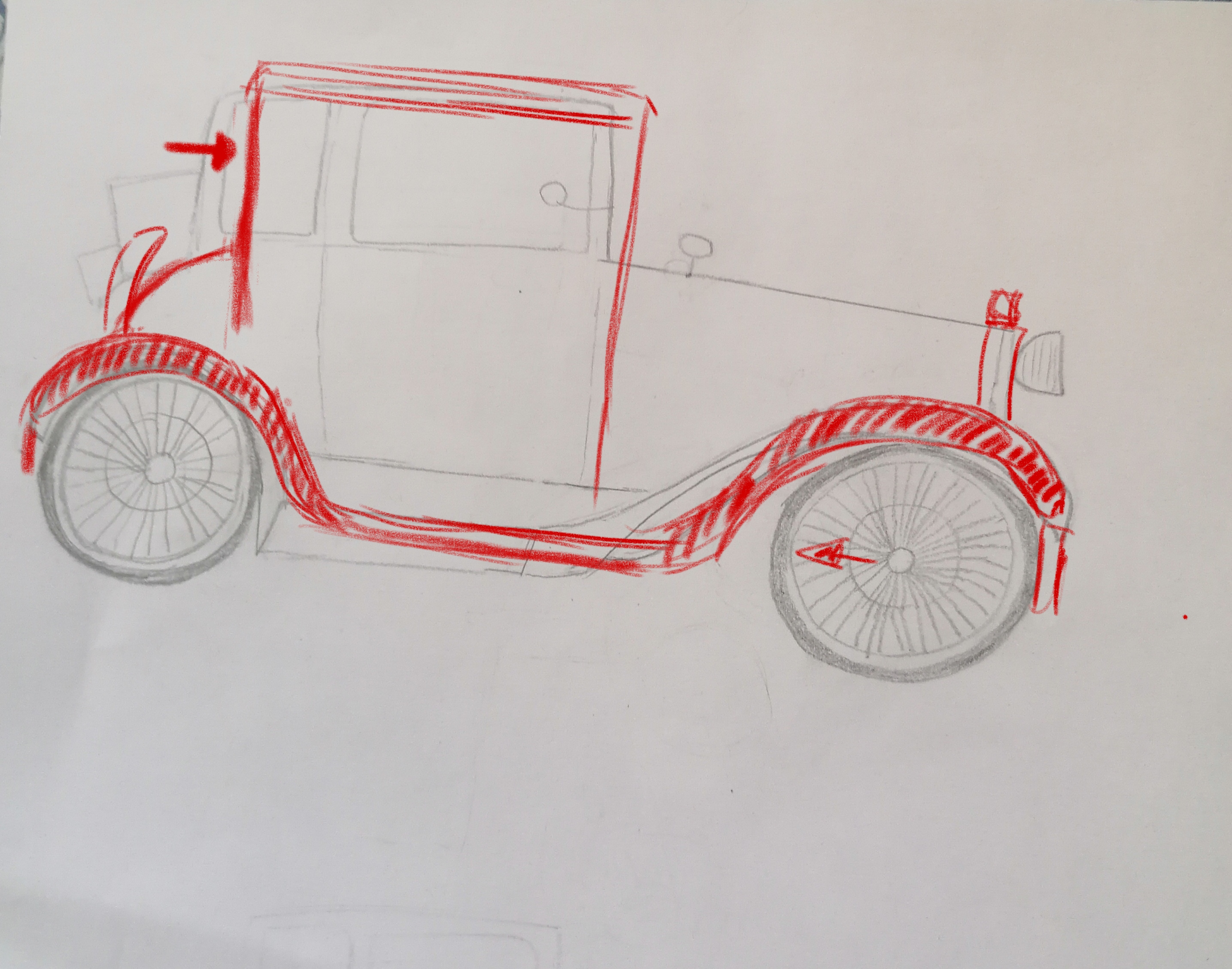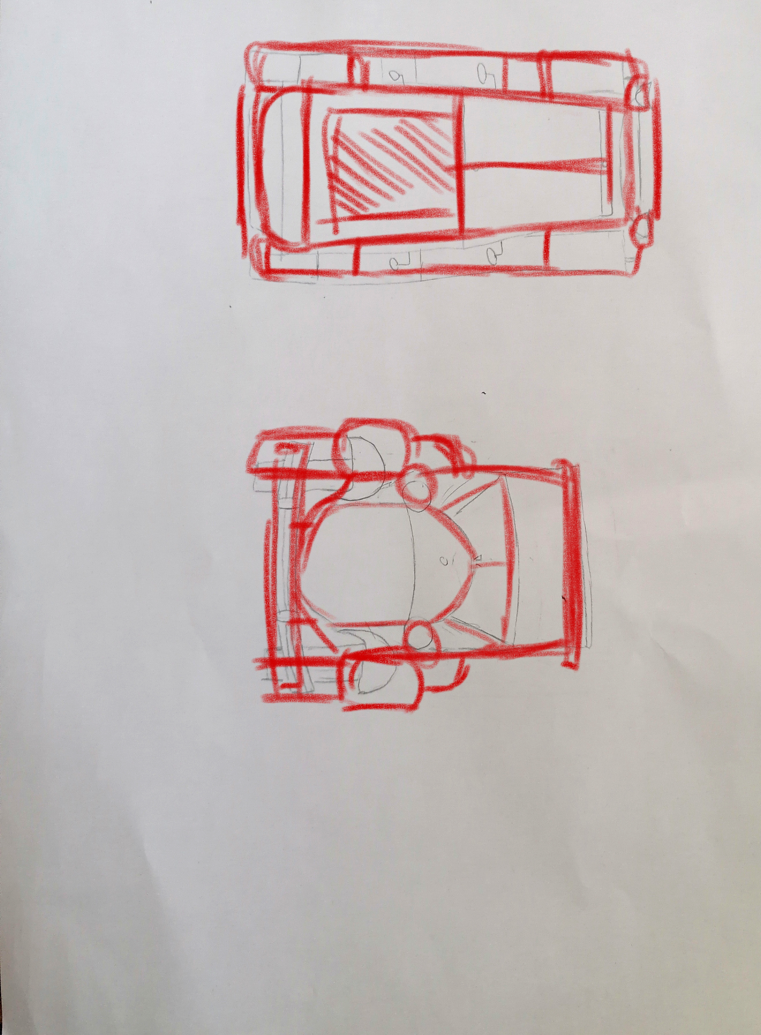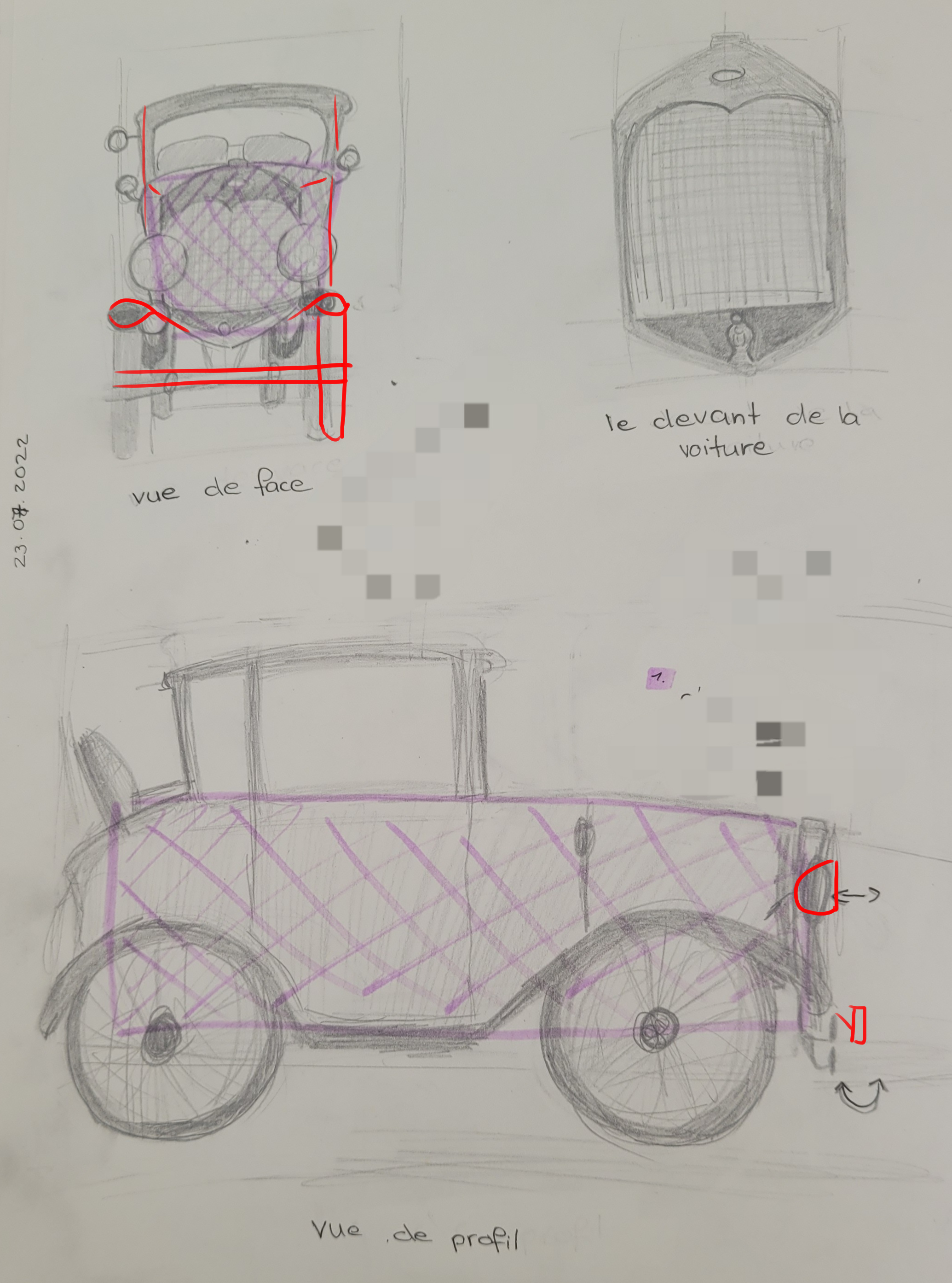 Super, c'est très bien! Je t'ai mis mes correctifs en images. Pour la vue du dessus, c'est du détail car tu as bien visualisé les formes et leur emplacement. C'est plus sur la vue de face où il y a quelques petites erreurs, notamment la position des gardes-boues qui doit être plus écartée sur les côtés.