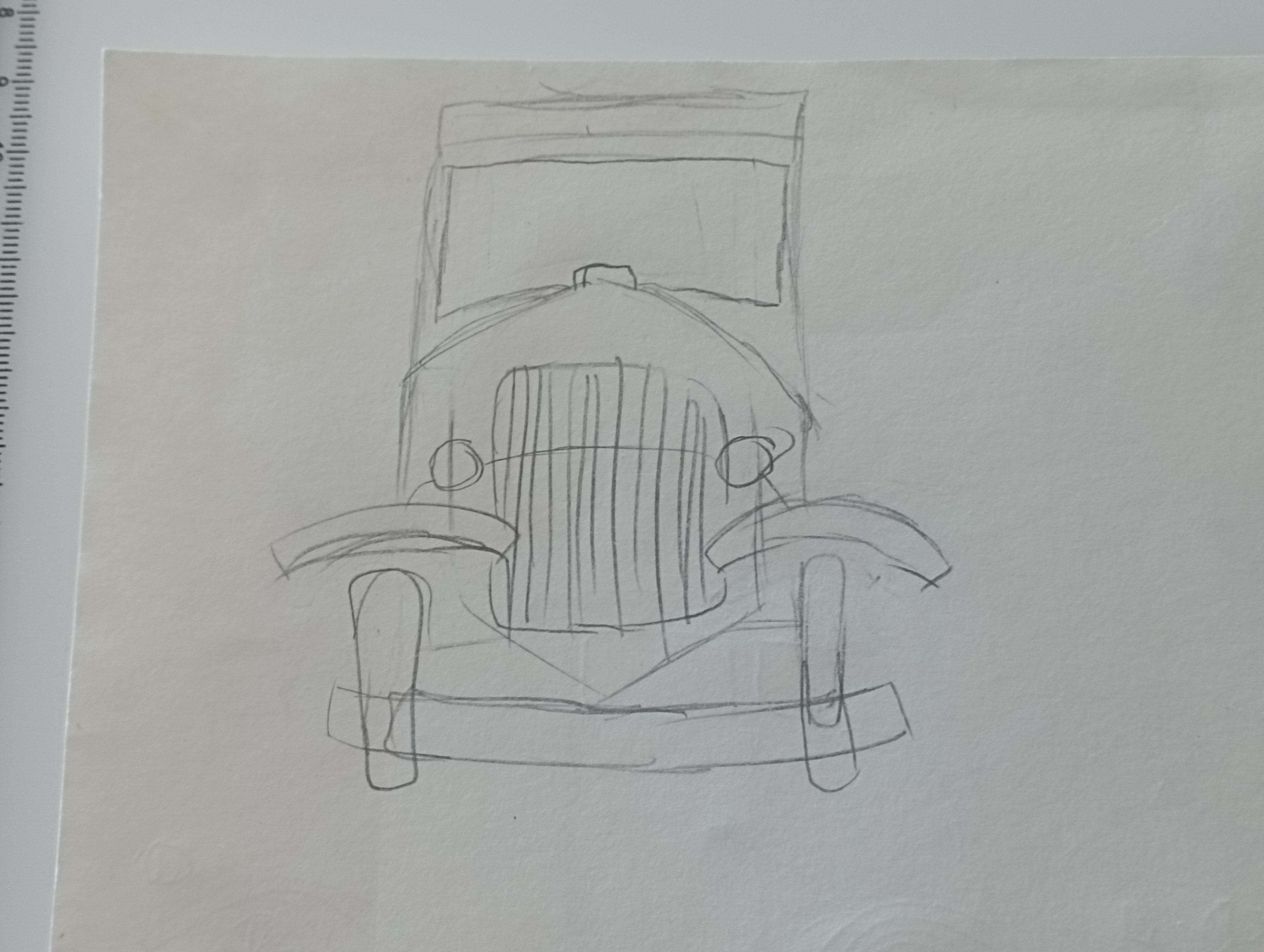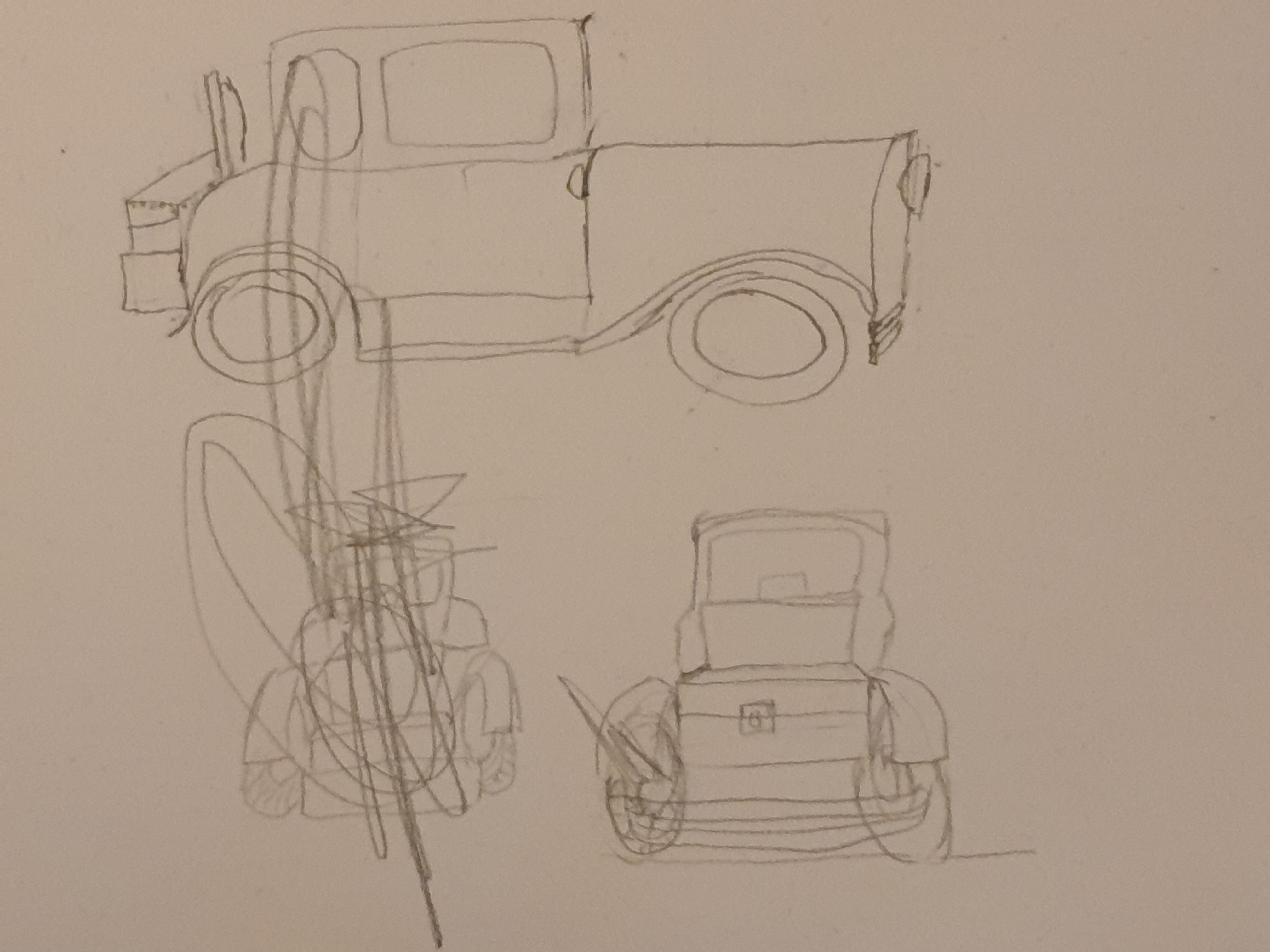 Bon, mon correctif sera moins parlant sans support visuel, mais j'ai un problème pour poster mes images depuis quelques temps... Sur la vue de profil, fais attention à ce que les roues soient dans le même axe et fasse la même dimension. Le capot devrait légèrement penché et s'arrêter environ au centre de la roue avant.