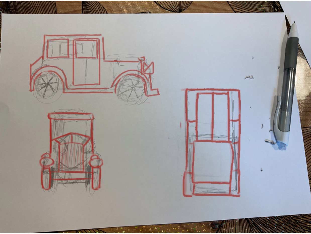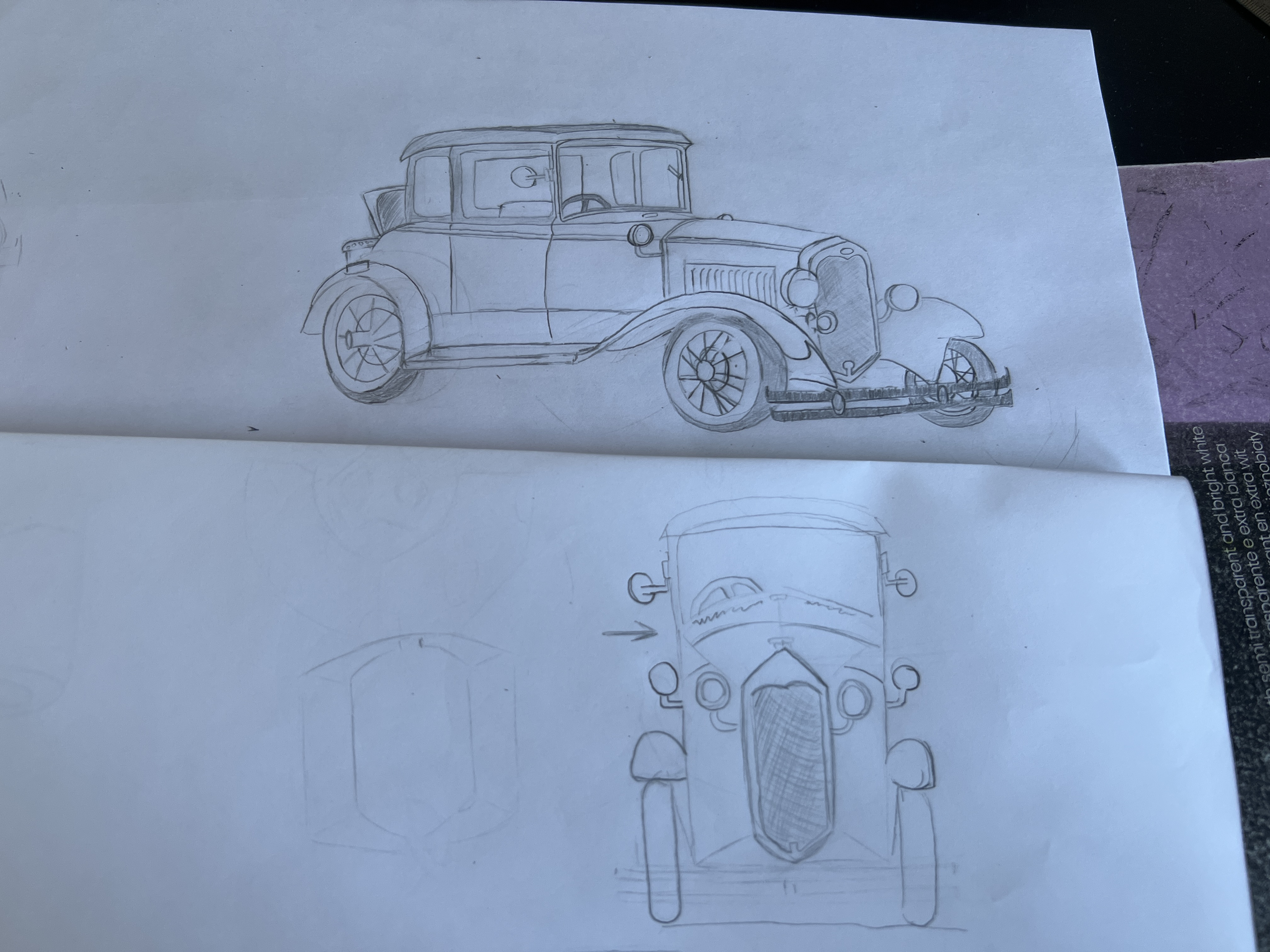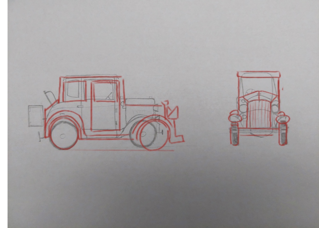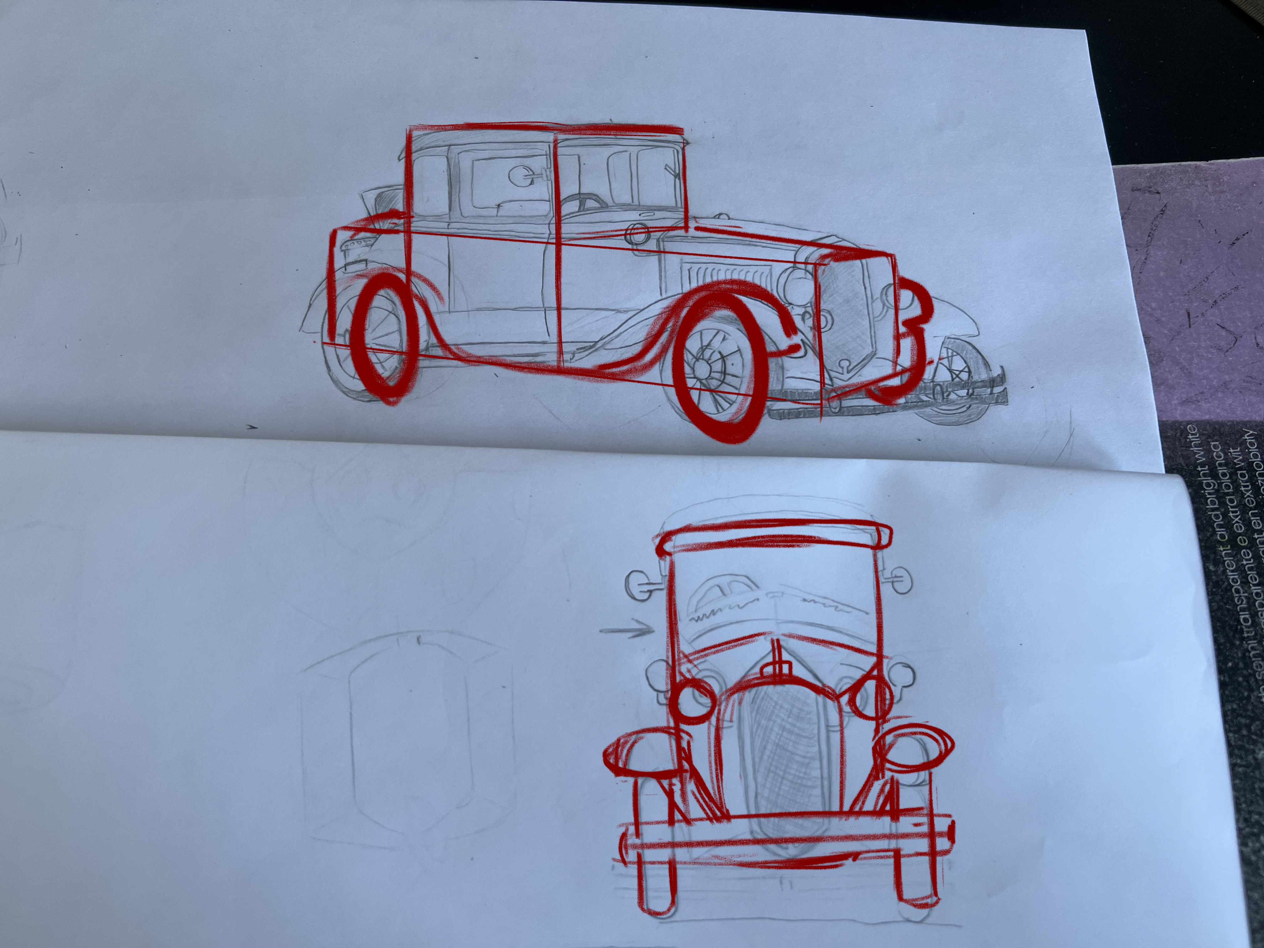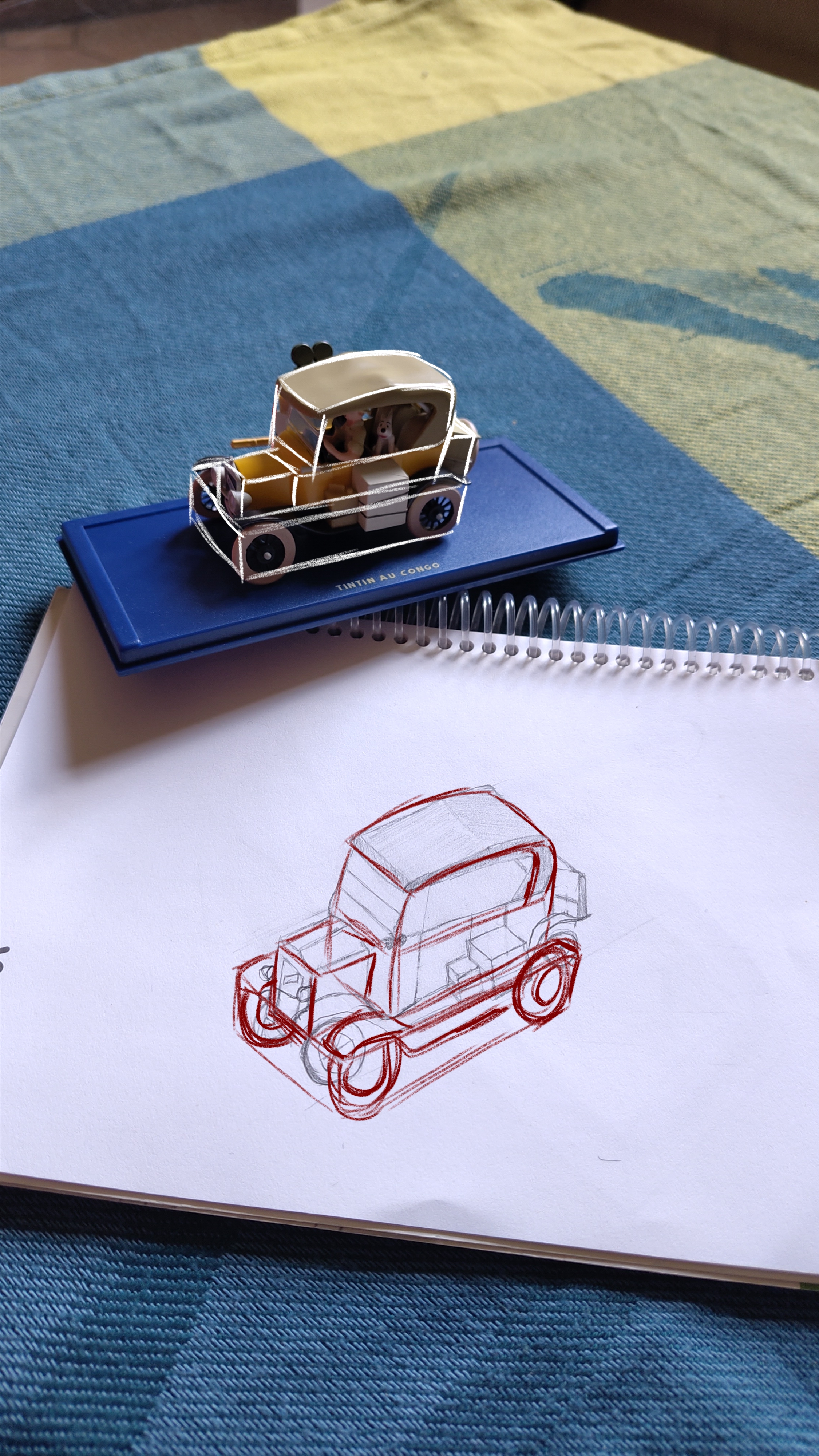 J'ai essayé de reprendre l'angle de la photo mais j'ai du mal à faire de beaux traits en respectant les bons gestes qu'on a vue dans une précédente vidéo et pour la vue de face je me suis rendue compte que le capot était trop bombé 😅