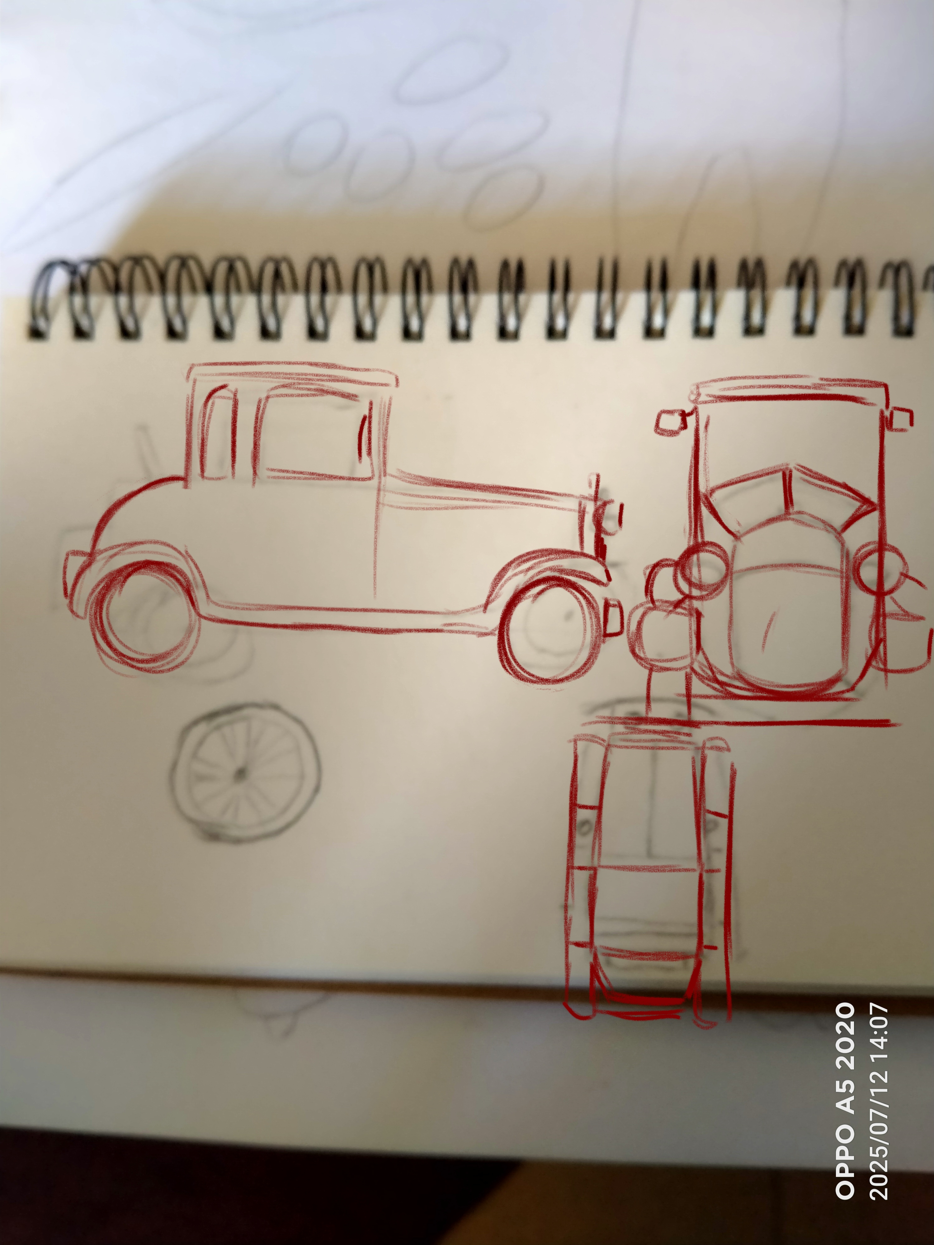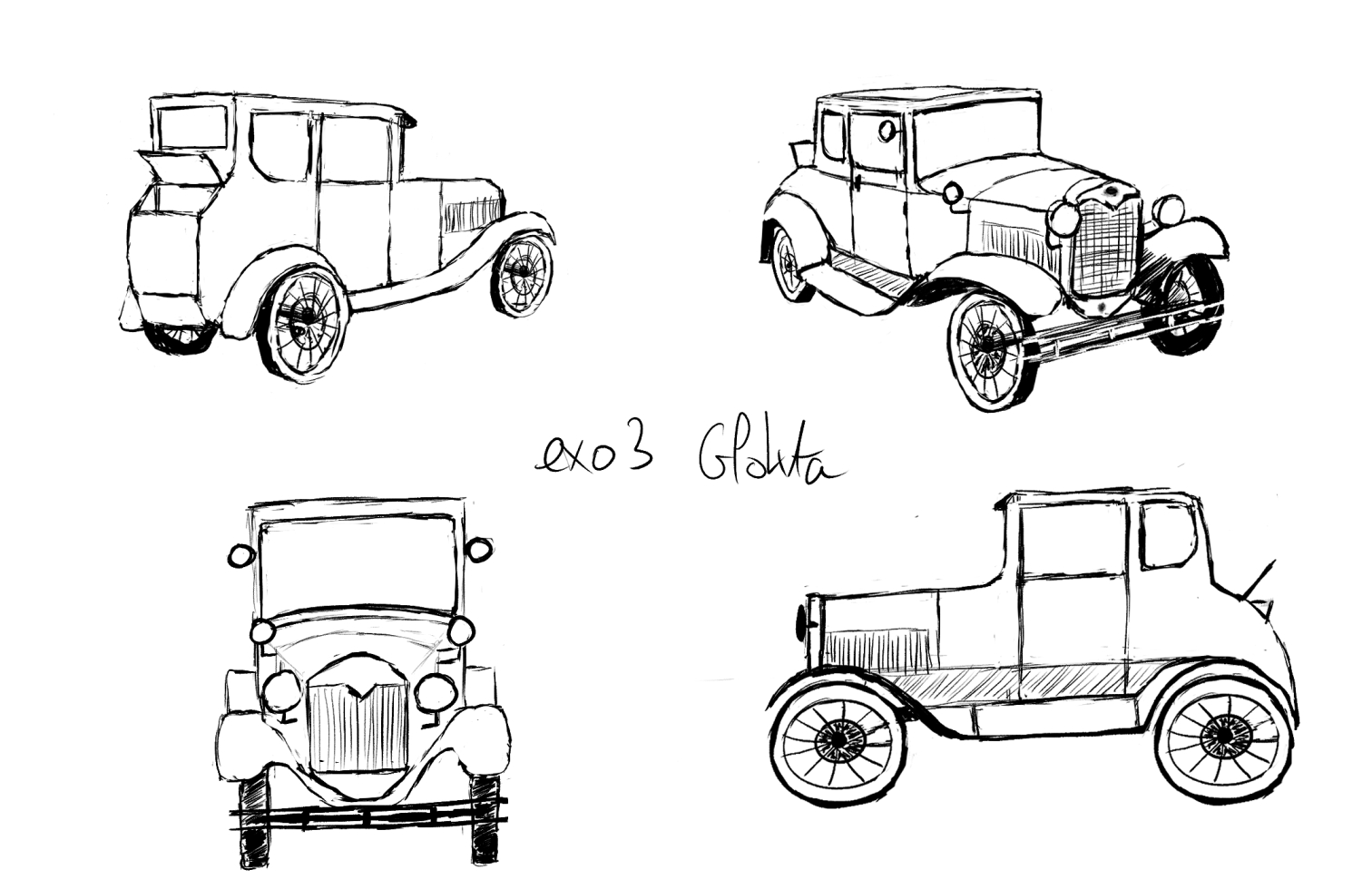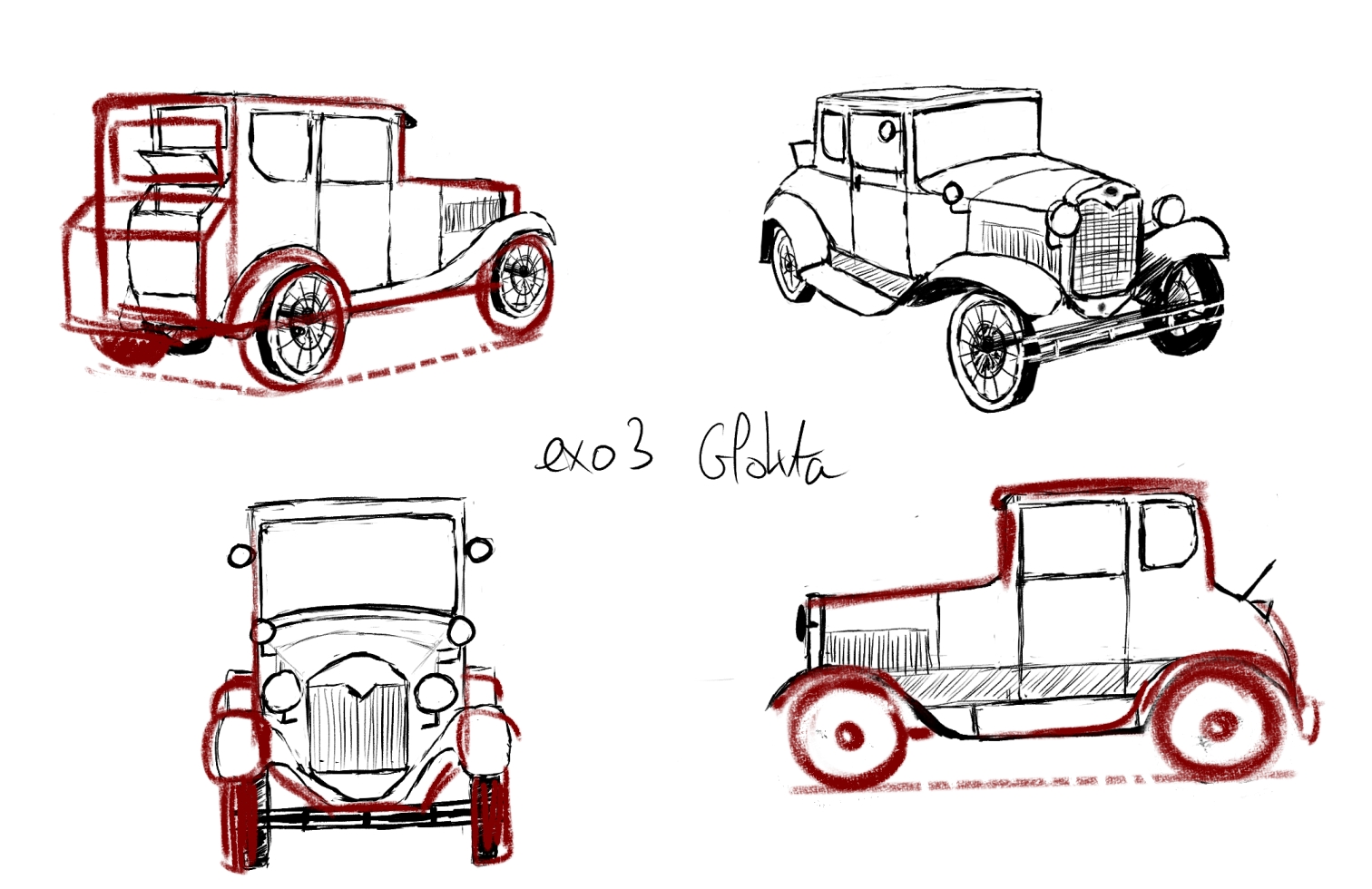 Bonjour Akya, ne t'inquiète pas de faire des beaux traits pour le moment, ça vient avec le temps et la pratique. Pour te faciliter la tâche sur la vue en perspective, fait ta voiture dans un bloc général qui comprendra l'habitacle, le capot, le coffre, ça te permettra d'avoir un résultat plus équilibré entre les différentes parties! Pour la vue de face, c'est vraiment pas mal, il juste de léger souci de proportion, mais rien de bien méchant! ^^ Essaie de faire plus d'angles de vue (de face, de côté, de dessus, etc...), le but de l'exercice et de pouvoir comprendre ton sujet sous différents angles à partir des quelques informations à ta disposition sur la photo. Beau boulot! :)