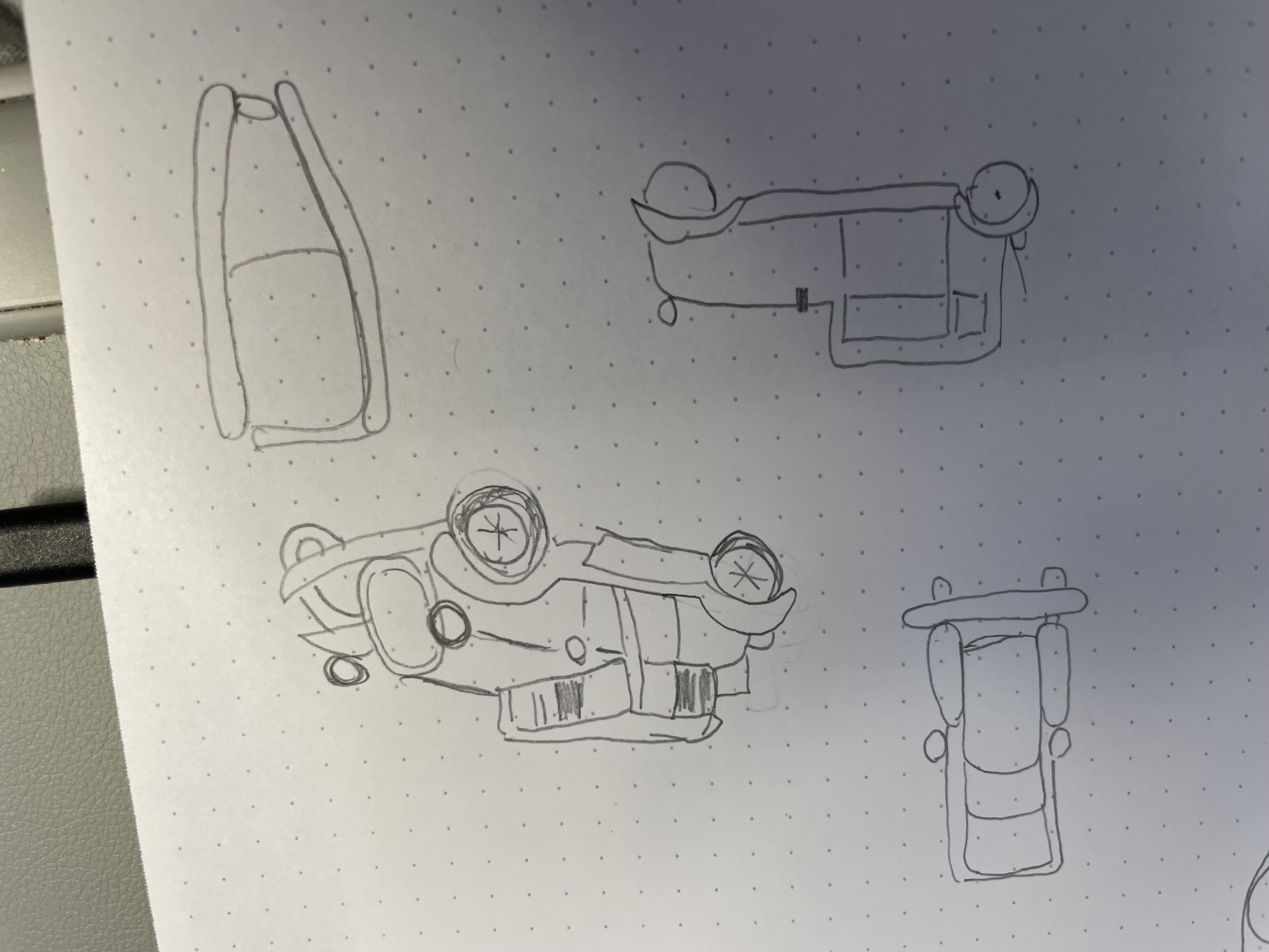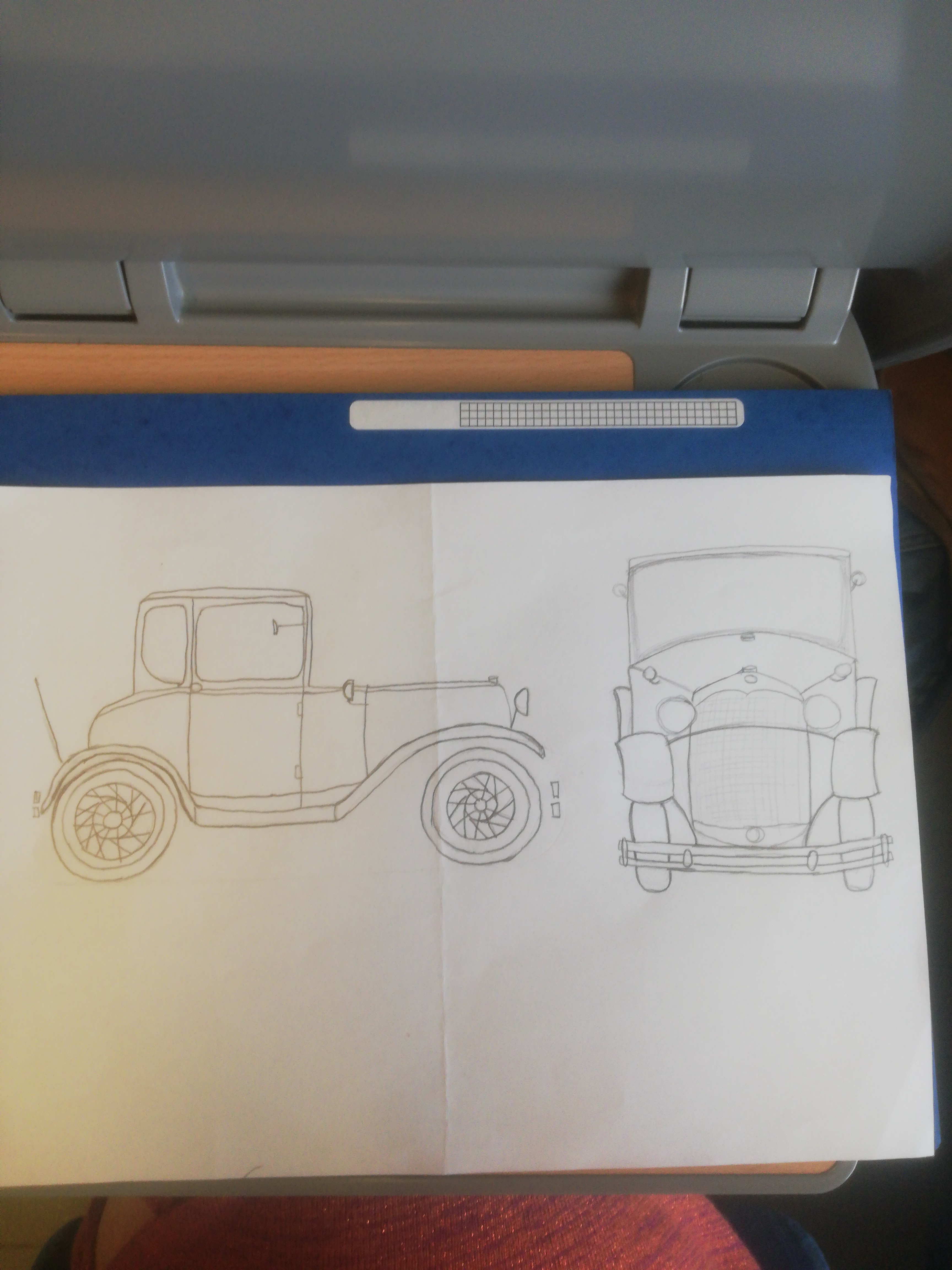 C'est vraiment bien !! Surtout qu'effectivement ça n'est pas évident de dessiner dans le train (quoique ça reste moins pire qu'en voiture aha). Globalement la seul petit erreure qui revienne c'est que tu as fais la voiture un peu large, bon il y a aussi ce petit problème pour la roue arrière mais tu l'abais déjà vu. Bien joué, continue comme ça ! 👍
