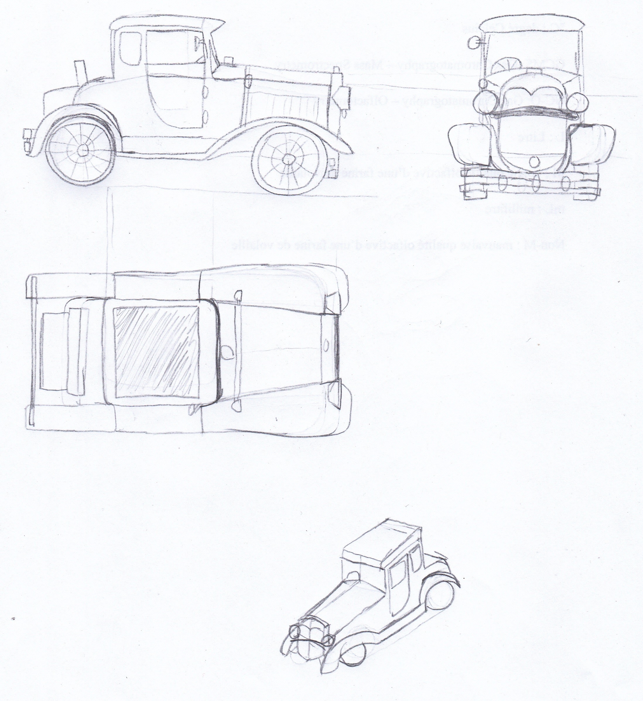 Tus bocetos no están mal, entendiste el ejercicio muy bien, ¡bien hecho! Me doy cuenta de que tenía un poco de preocupación con el automóvil 3/4, tenga cuidado, las características deben ser paralelas 😉 Aparte de eso, es muy bueno, ¡continúa así!