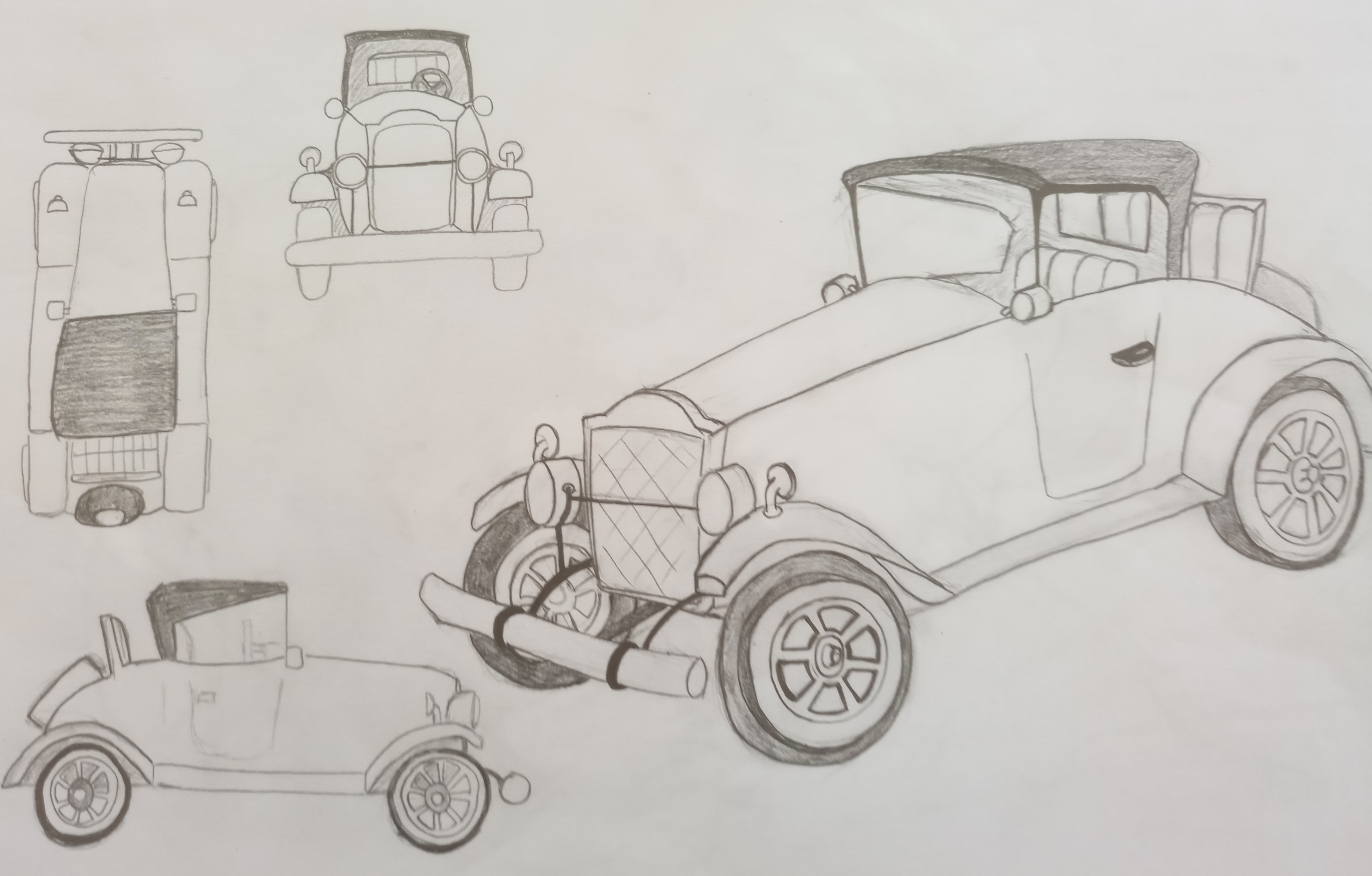 En comparación con el auto (me parece que te corrigí los otros dos objetos), ¡lo que puedo ver no es malo! La hoja que está en la altura, desafortunadamente, no puedo corregirla debido a la calidad 😞 su automóvil de perfil en la parte inferior derecha es demasiado plana, ¡el cuerpo debería ocupar más espacio! El de la izquierda ya es mejor, sin embargo, la parte posterior del automóvil es demasiado imponente. Para la vista desde el frente, su dibujo derecho es mejor que el de la izquierda, ¡pero esta vez el automóvil es demasiado bajo! Te aconsejo que lo vuelva a trabajar, has entendido cómo funciona el objeto, ¡pero hay algunos centros pequeños!