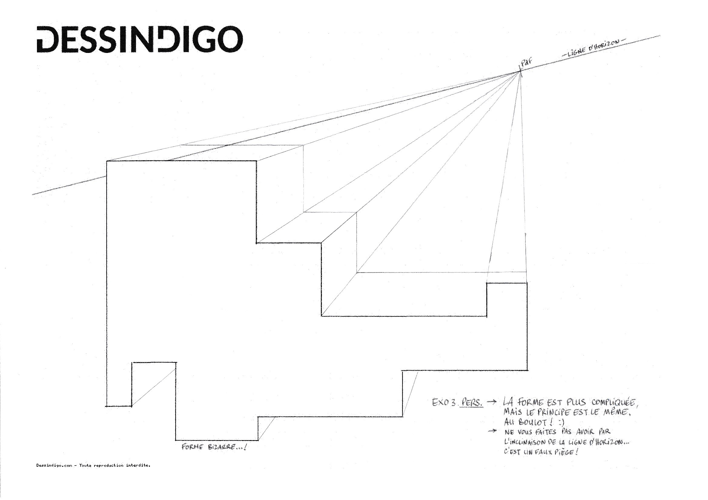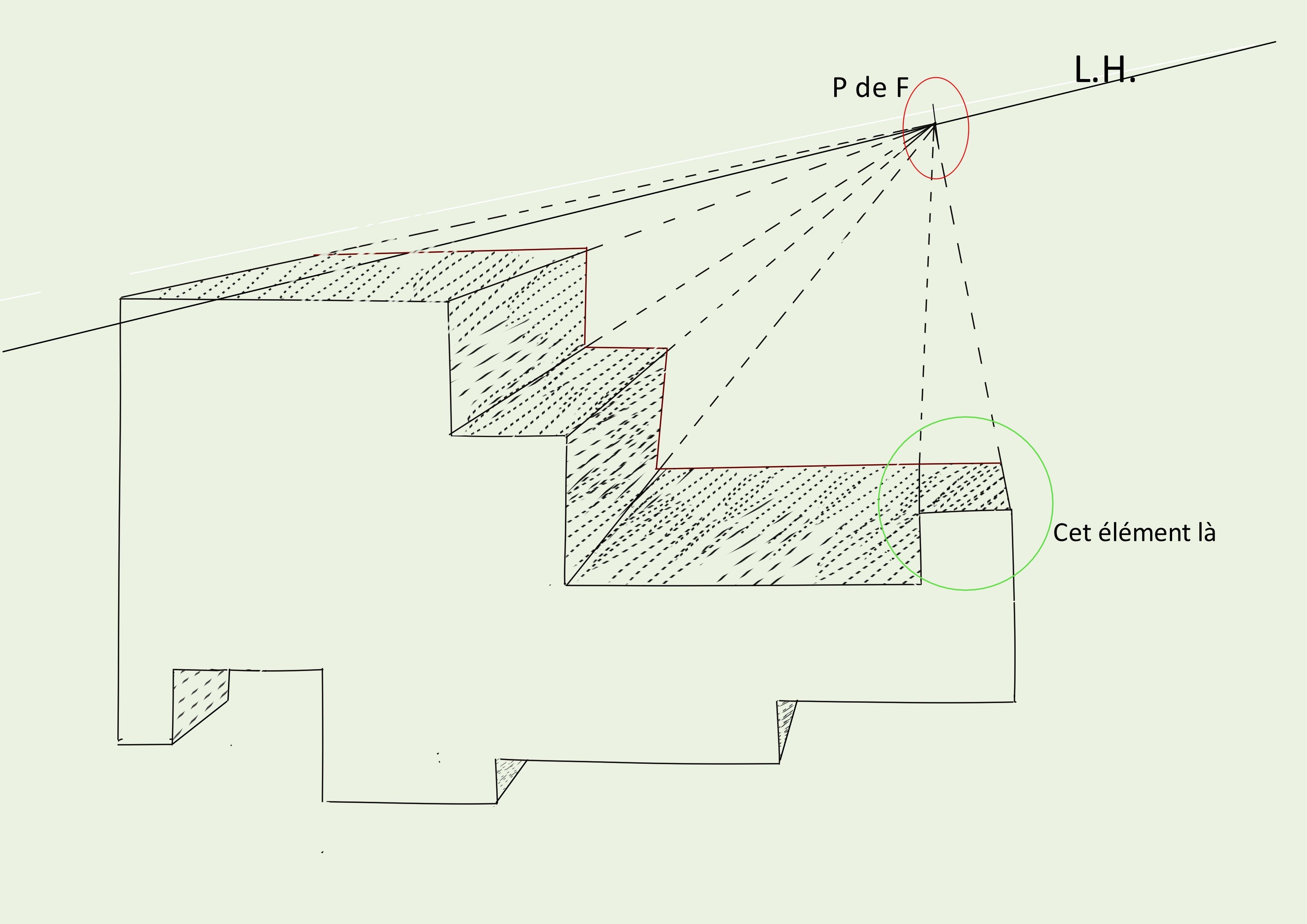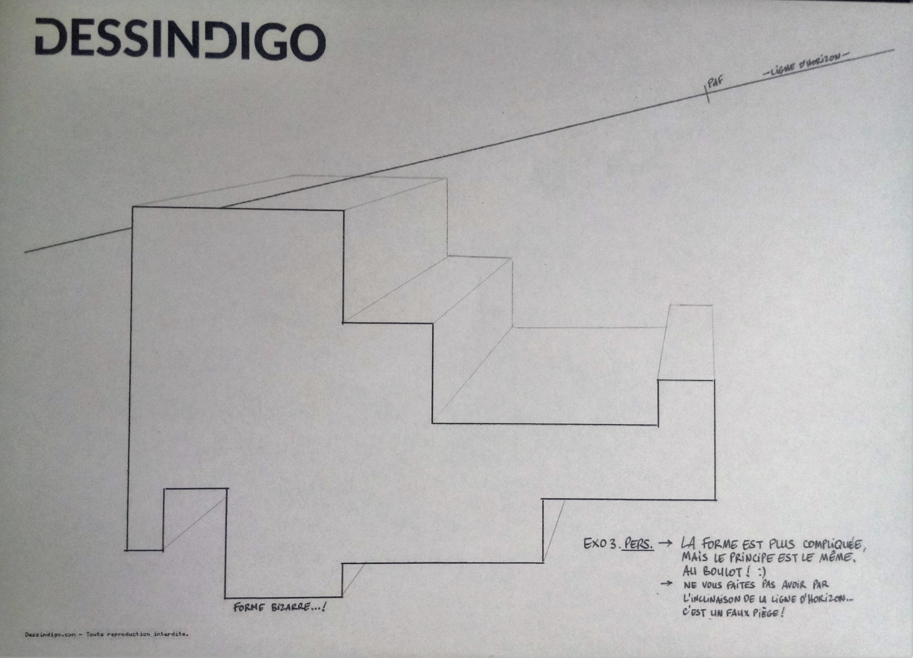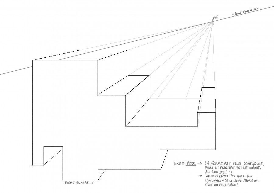 Bonjour, voici le 3ème exercice, je n'ai pas enlevé les lignes qui rejoignaient le point de fuite car cela vous permet de voir comment j'ai procédé !