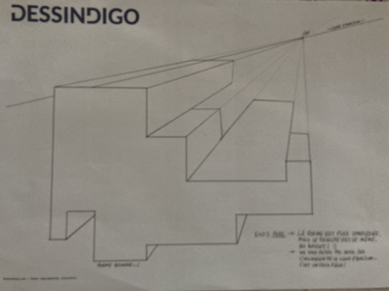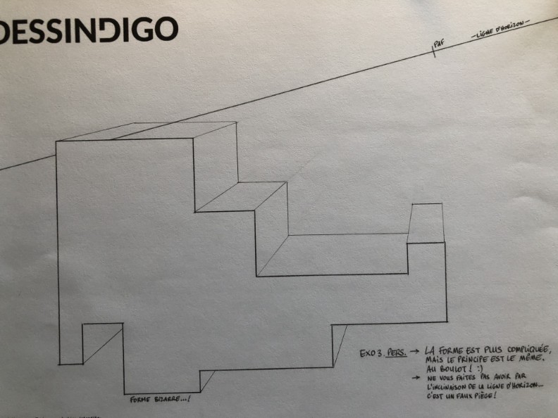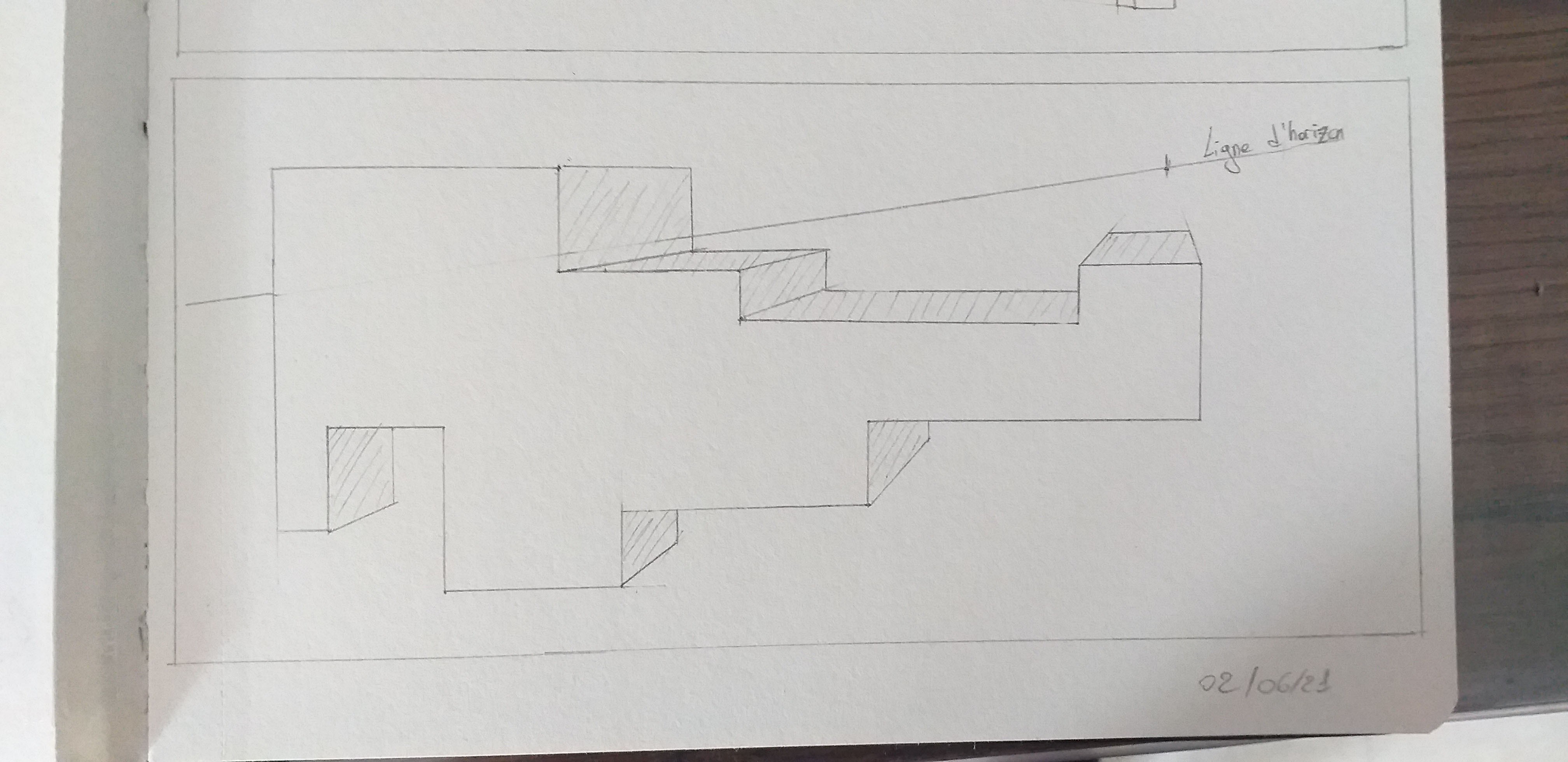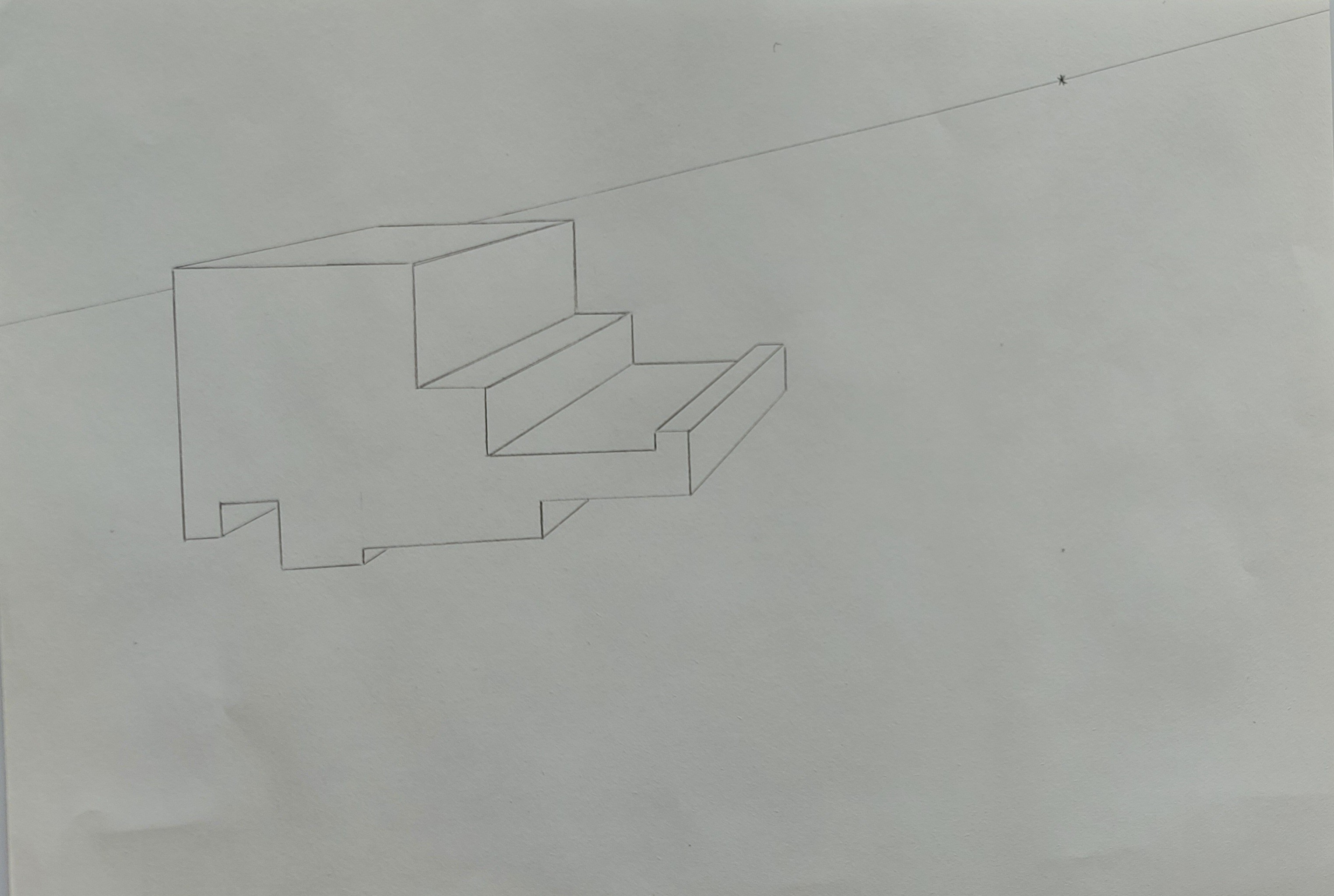 En gros, dessine d'abord le reste de la forme précédente (en transparence), puis remonte à la verticale vers tes lignes de point de fuite, et trace ton horizontale.