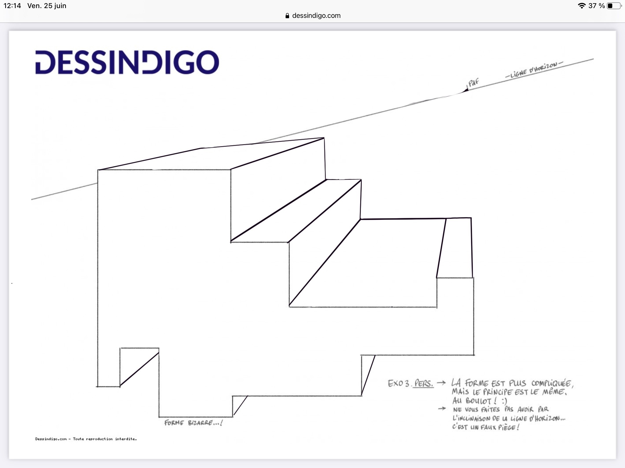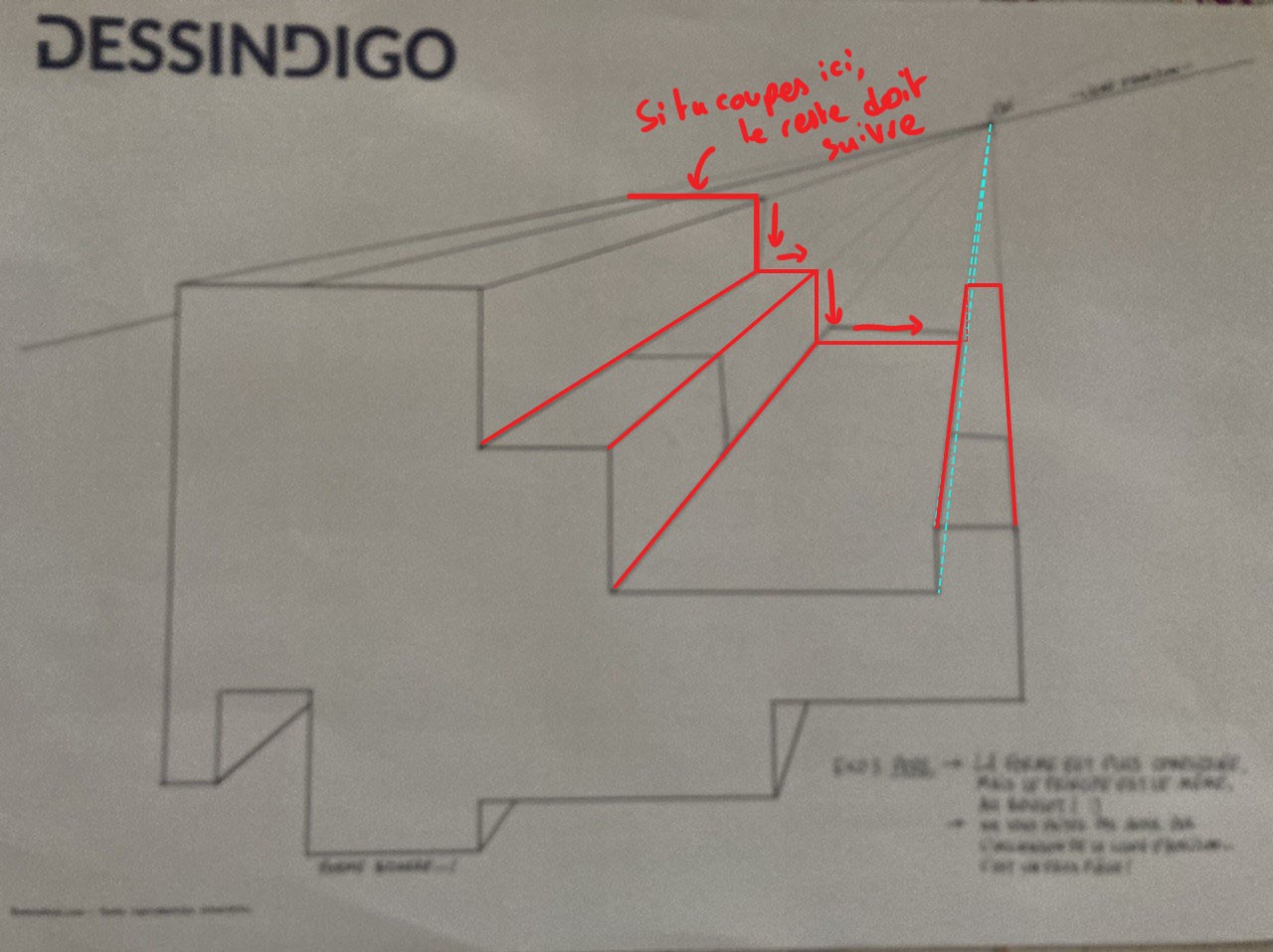 Quand tu choisis de couper tes diagonales (lignes qui partent vers le point de fuite) pour créer l'épaisseur de ton volume, il faut qu'elle reste la même tout du long.