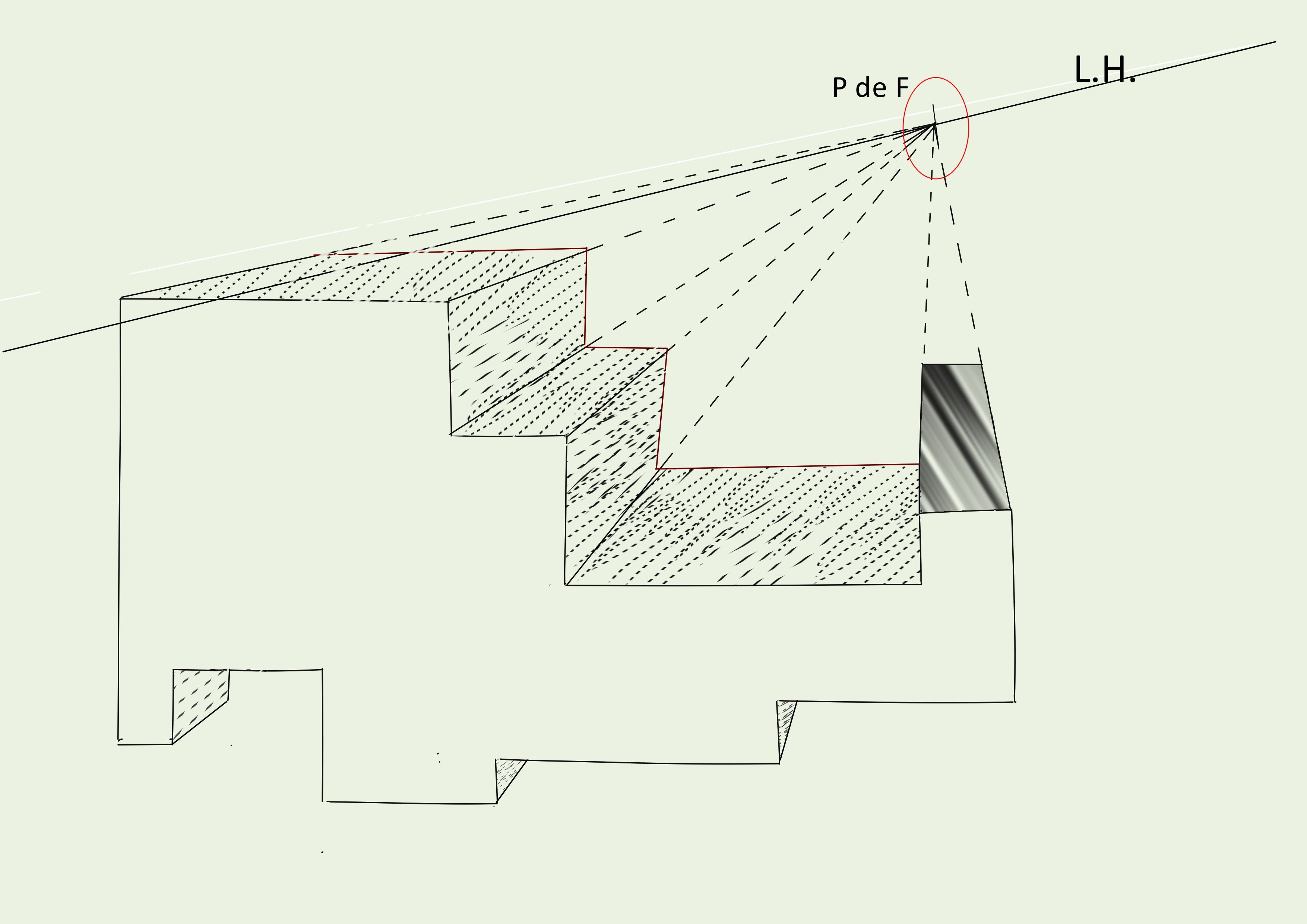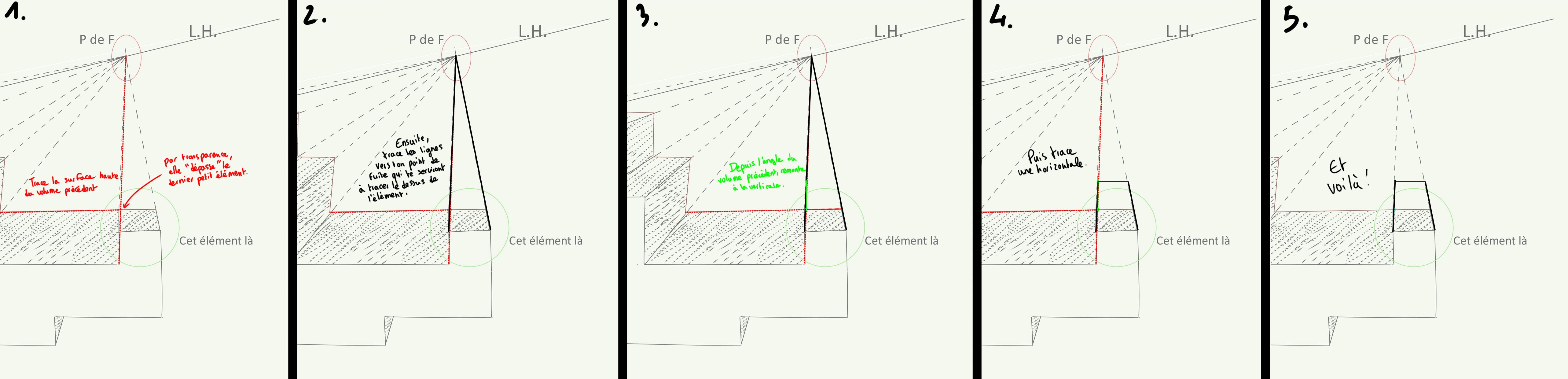 Básicamente, primero dibuja el resto de la forma anterior (en transparencia), luego regresa a la vertical hacia sus líneas de punto de fuga y traza su horizontal.