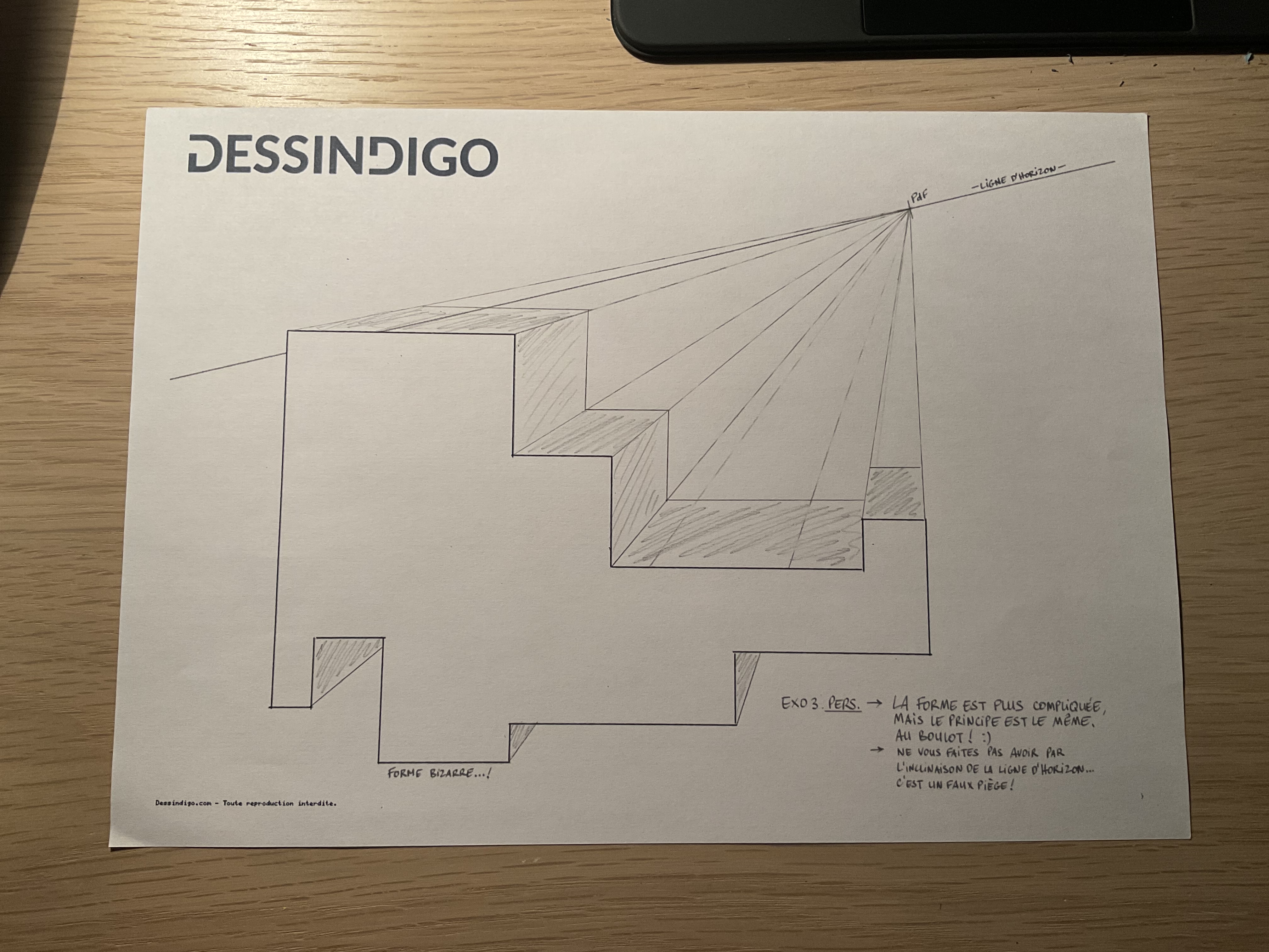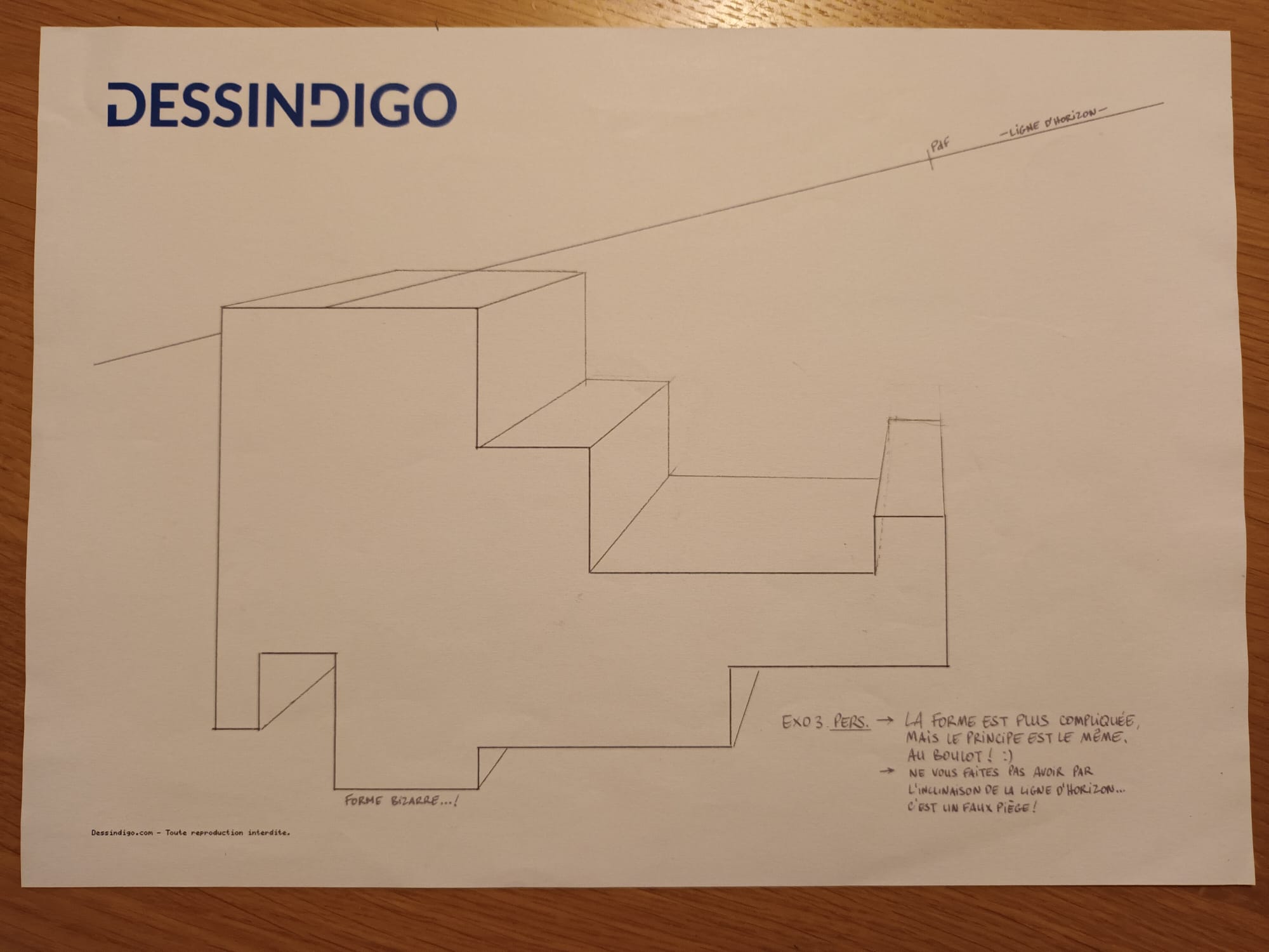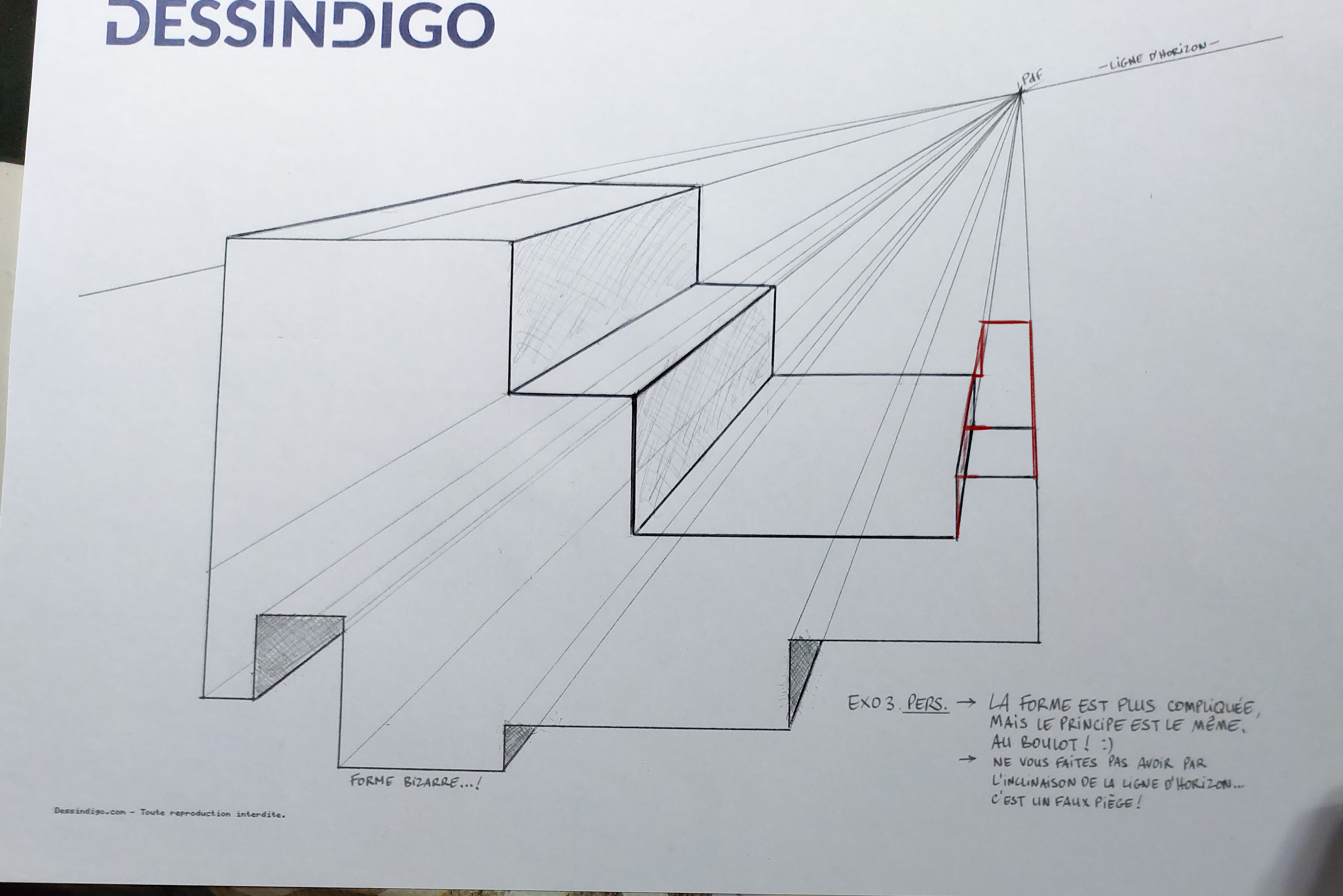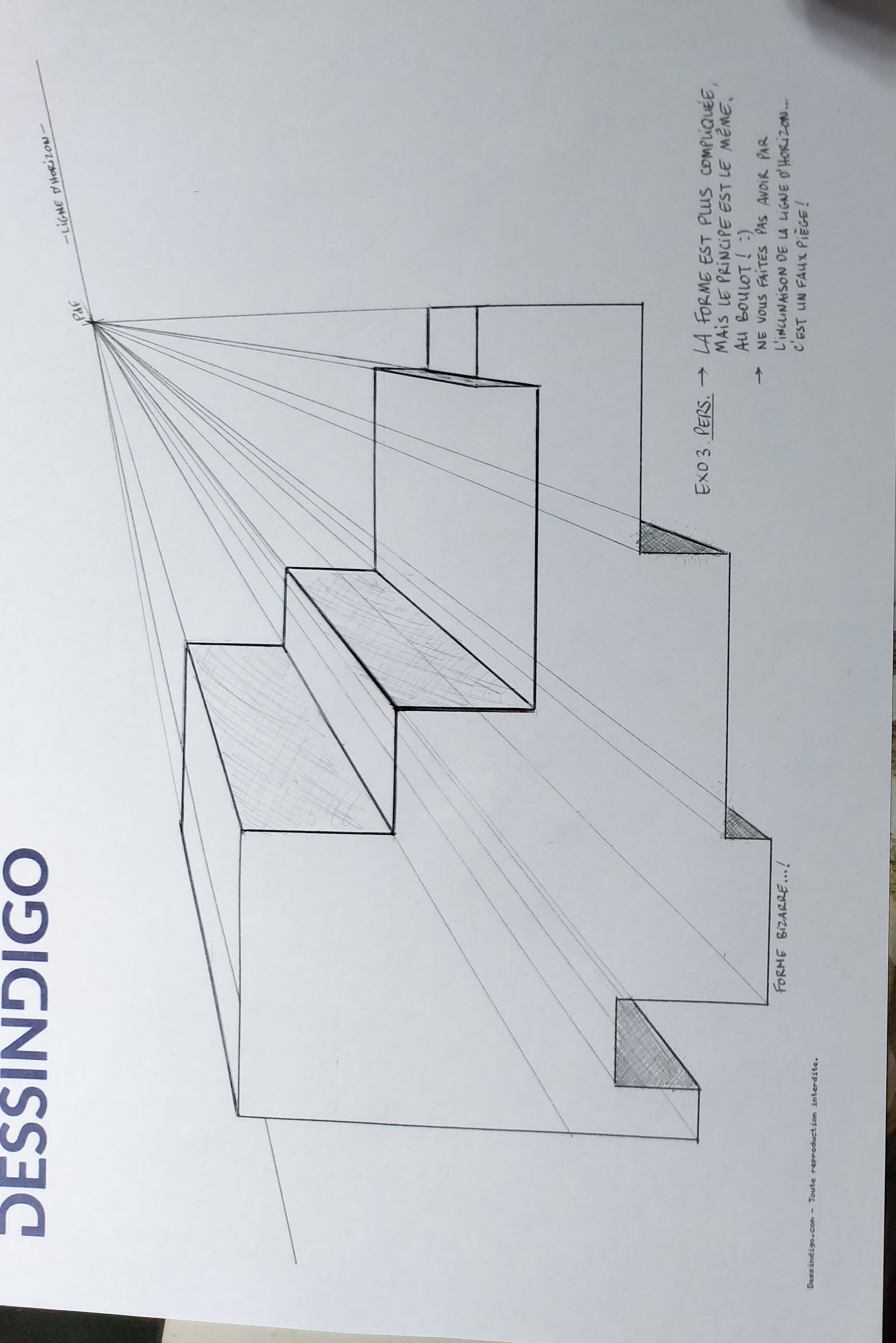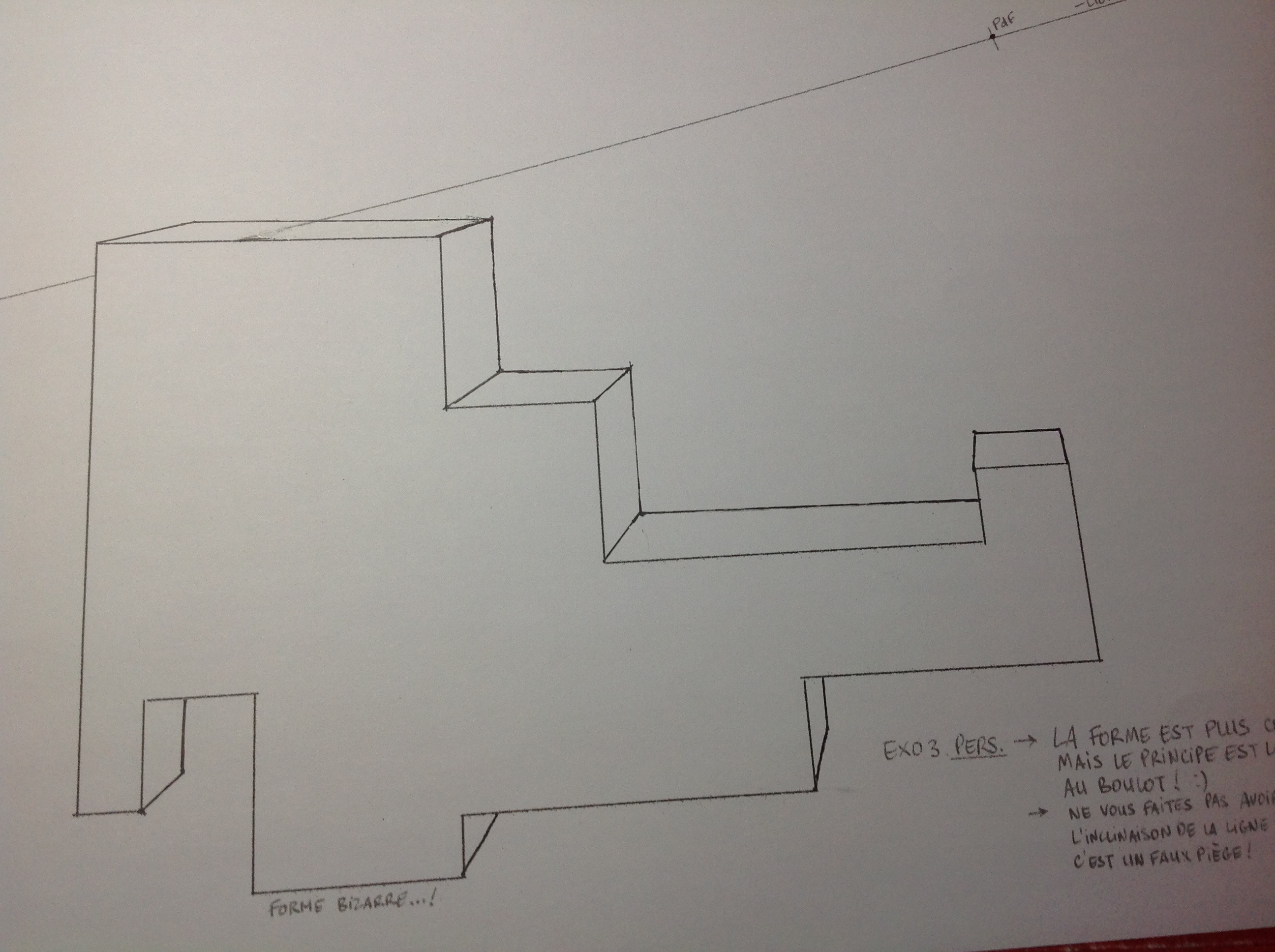 Et voilà l'exercice 3 où il y a un endroit où je me suis trompée là où la forme bizarre et la ligne d'horizon se croise, c'est pour cette raison qu'il y a du tipex à cet endroit