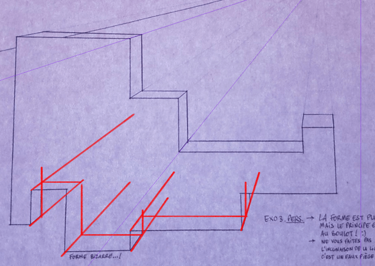 Il y a deux manières de déterminer la hauteur (qui sont sensées donner le même résultat, sur ma correction c'est pas exactement le cas parce que je pense que les horizontales sont pas exactement bonnes à cause de la pers' de la photo ^^). Soit tu fais remonter l'arrête du fond qui est cachée comme suggéré dans la correction, mais en l'occurrence c'est pas facile de bien voir car les traits se touchent presque. (en rouge sur la correction)