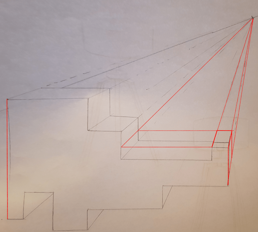 Sinon tu peux reporter la hauteur du muret sur la ligne à gauche, tu la met en perspective et grâce à la ligne du fond tu as l'intersection pour trouver la hauteur du muret en perspective !