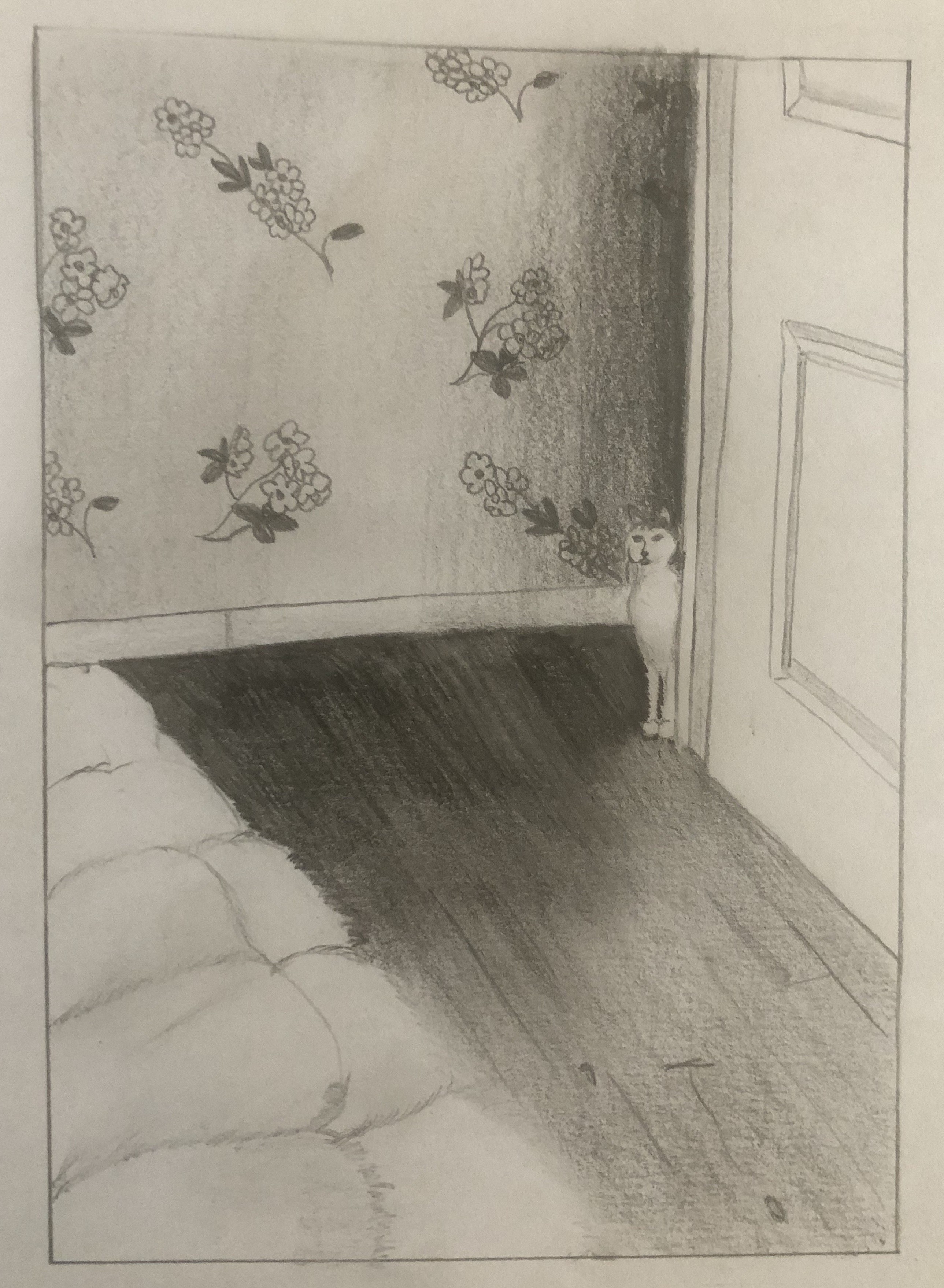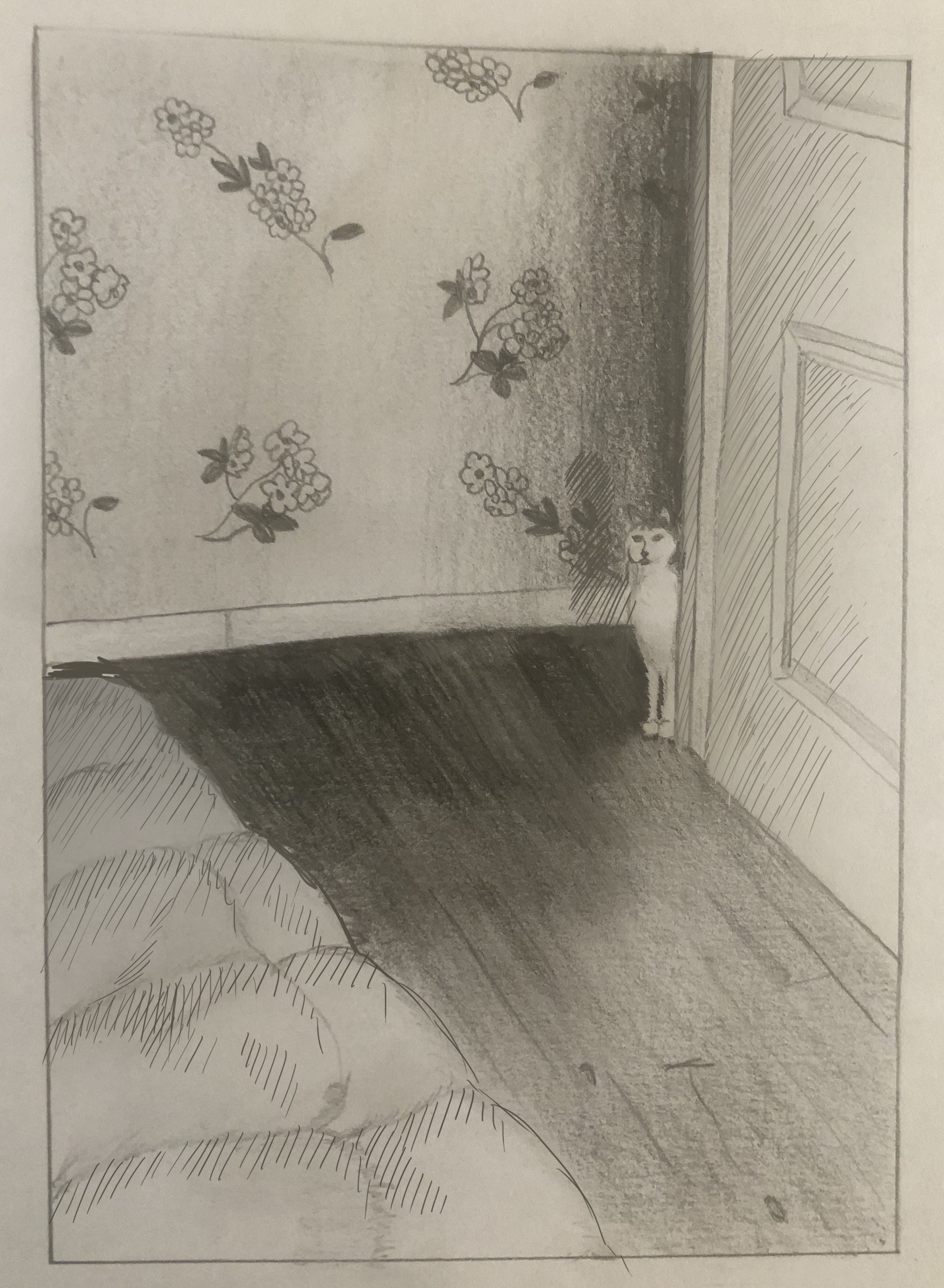 Aparte de eso, la pregunta enojada: ¿Dónde está la fuente de luz? Obviamente hacia abajo de la imagen. Es una fuente fuerte de luz (sombras muy oscuras en la pared y en el piso). Podría provenir de una ventana y de una lámpara de noche. Entonces, ¿dónde están las sombras en el edred / alfombra y en la puerta? Necesariamente habrá. Si es blanco = es brillante o muy muy claro. Incluso el pelaje blanco del gato está ligeramente sombreado, falta en la puerta. Un pequeño gradiente del fondo de la habitación (menos luz) incluso hacia la fuente de luz (luz). La misma preocupación en el edredón / alfombra, tenemos sombra de volumen, pero no dependen de la luz, ya que las sombras se colocan en el costado de la fuente de luz. Esto no es un error, pero, por lo tanto, deberíamos tener un tono para las sombras estrictamente hablando.