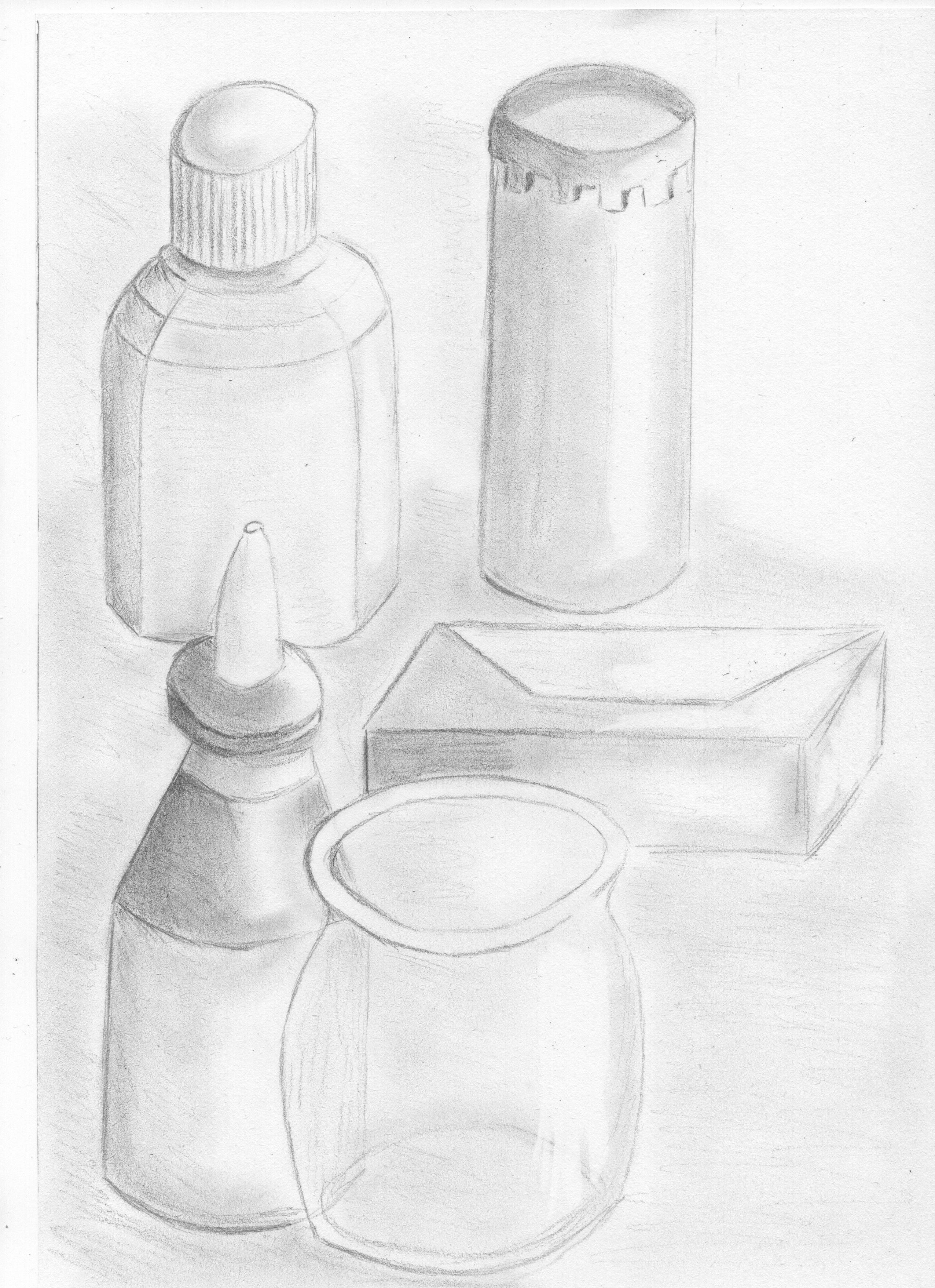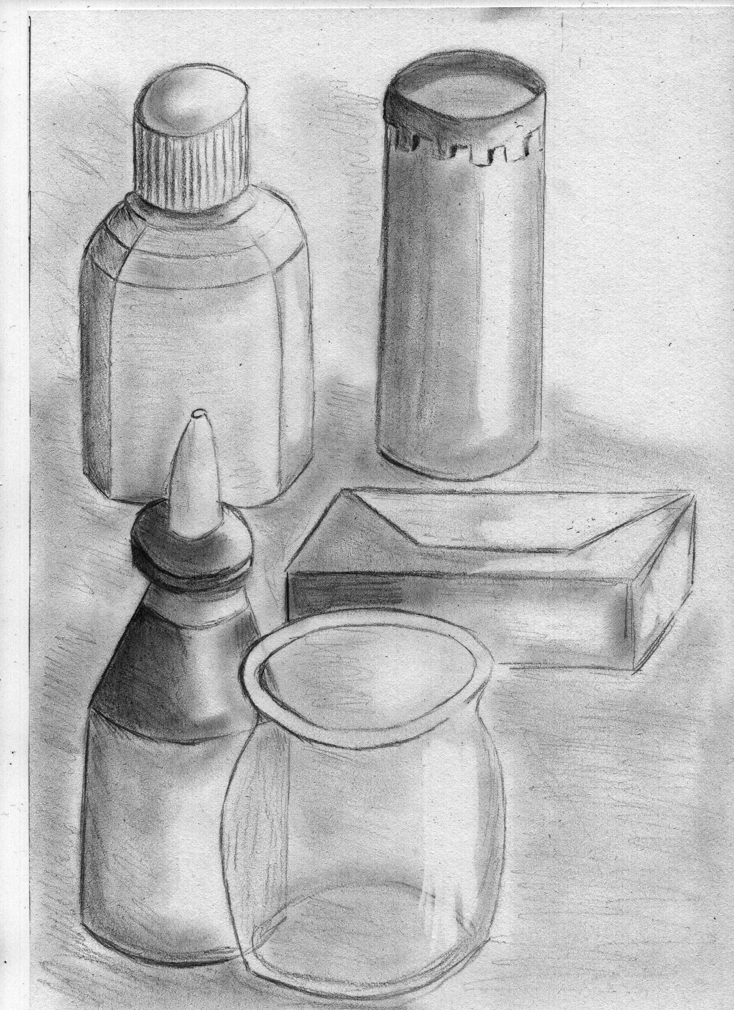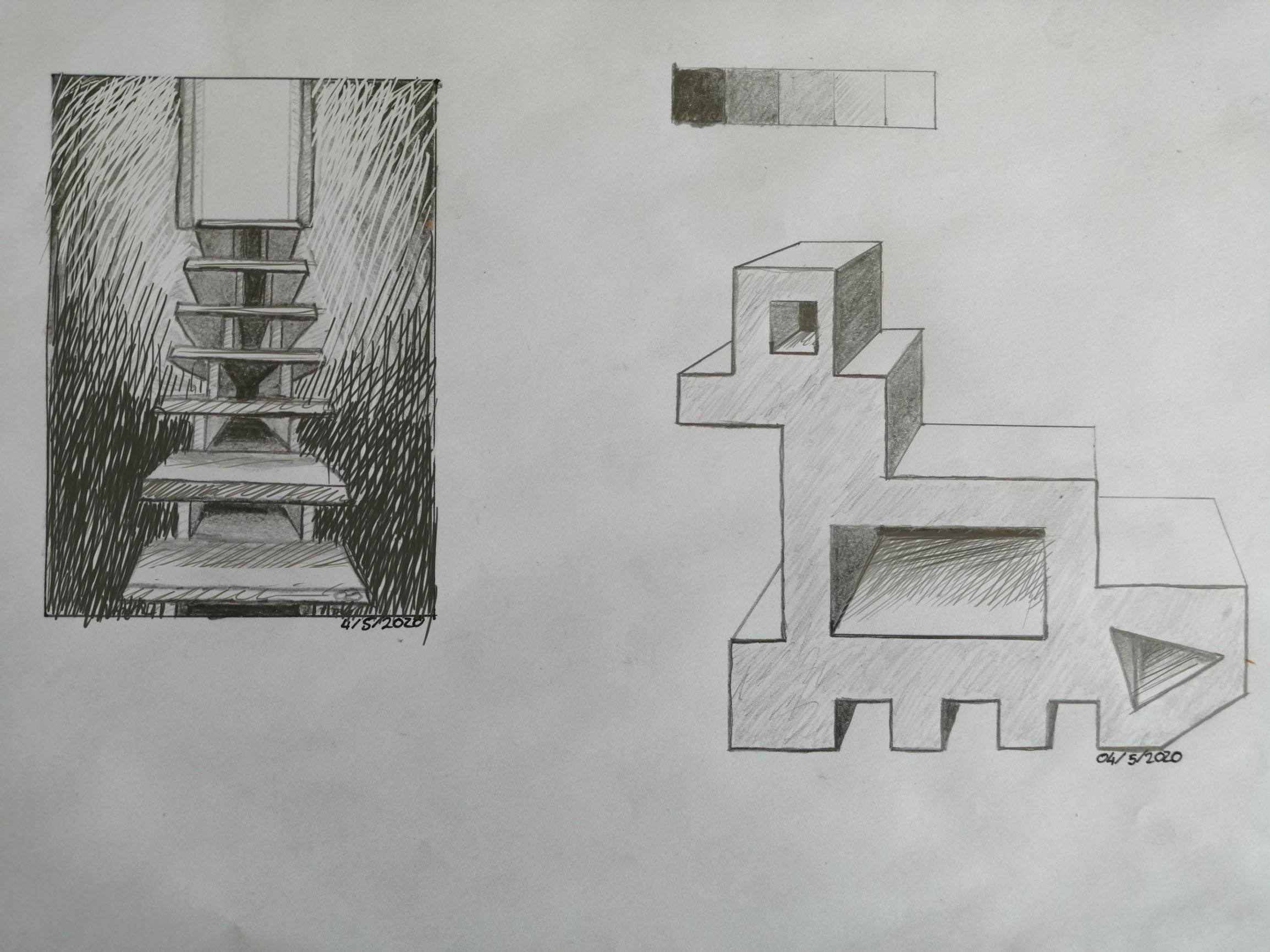 Descubrimiento de las escalas de valores y es cautivador, difícil para mí, pero realmente muy agradable. En el primer dibujo, intenté trabajar en la luz y las sombras. En el segundo, intenté poner diferentes valores dependiendo de la orientación de las caras de la figura.
