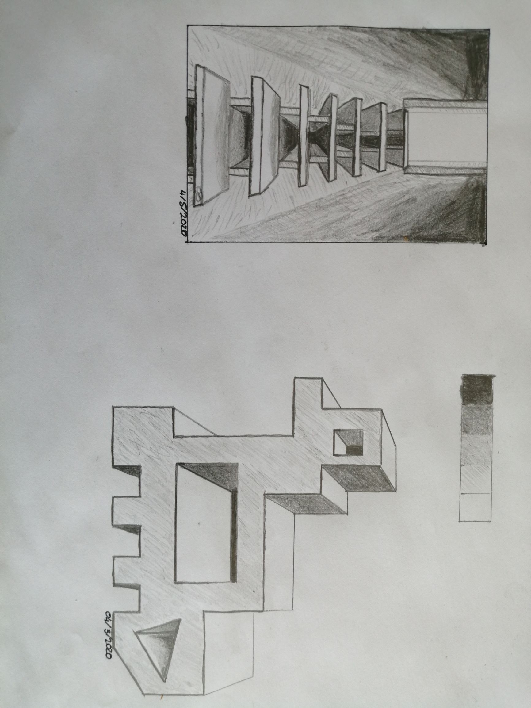 C'est très intéressant ce que tu as fait. Ton deuxième exercice est quasi juste. Il n'y a que deux faces, orientées vers le haut (et que tu as donc choisi de laisser en blanc) qui font étrange car elles sont surplombées par une autre forme et on s'attend donc à voir un ombrage dessus.
