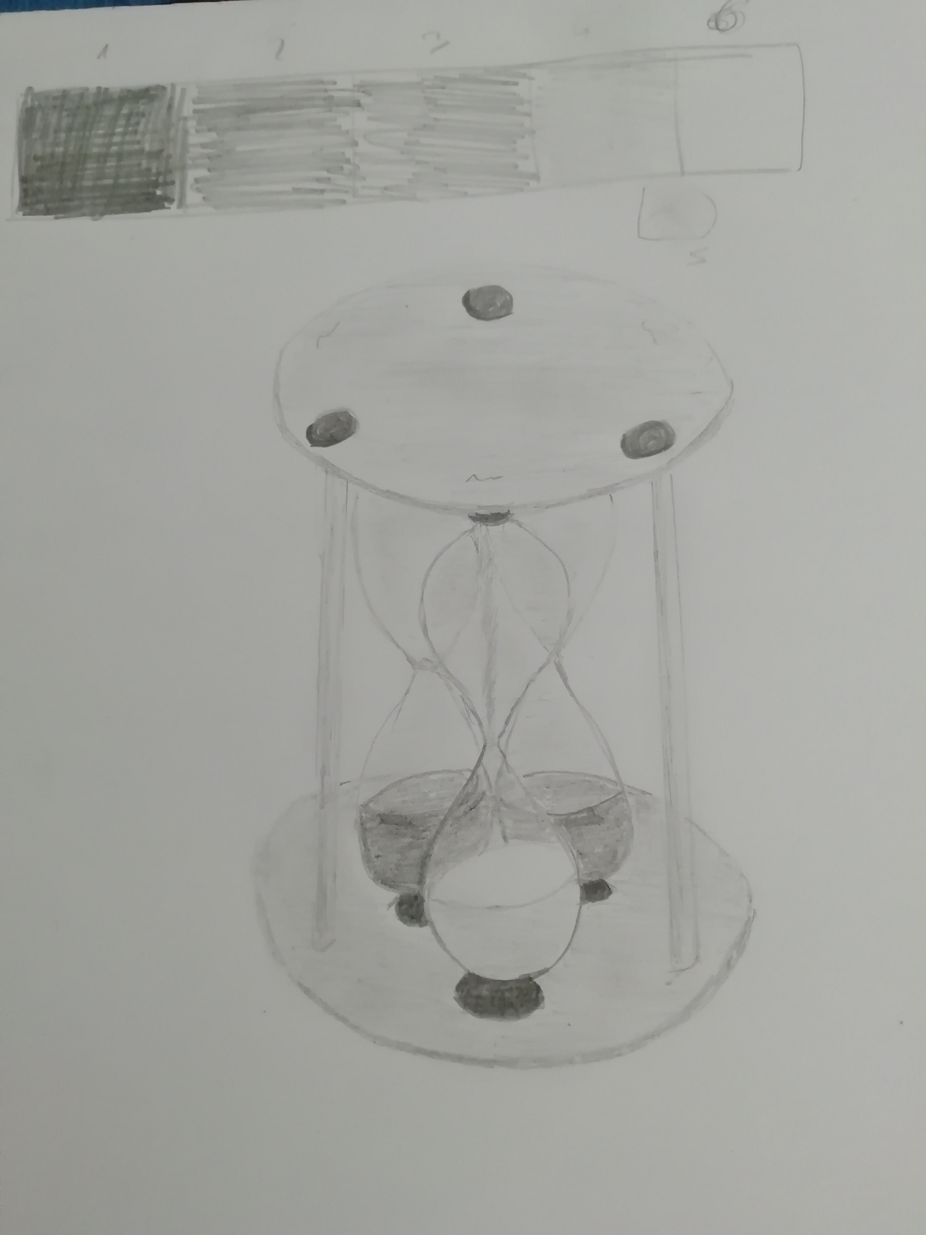 Ve, empiezo. Traté de trabajar en los valores con un objeto de la casa. Este trío de relojes de arena. Pequeño problema de proporciones en mi dibujo: el elipse de la base (abajo podría haber sido más pequeño). Agregué un nivel gris en el camino porque con los juegos de transparencia, era un poco corto.