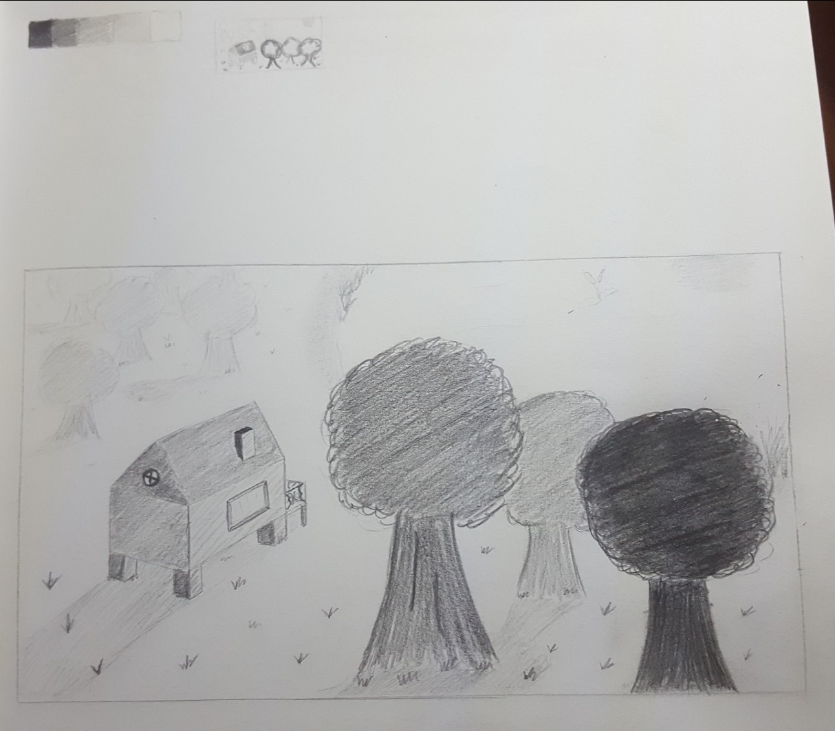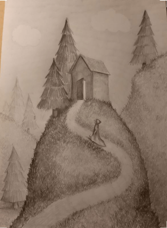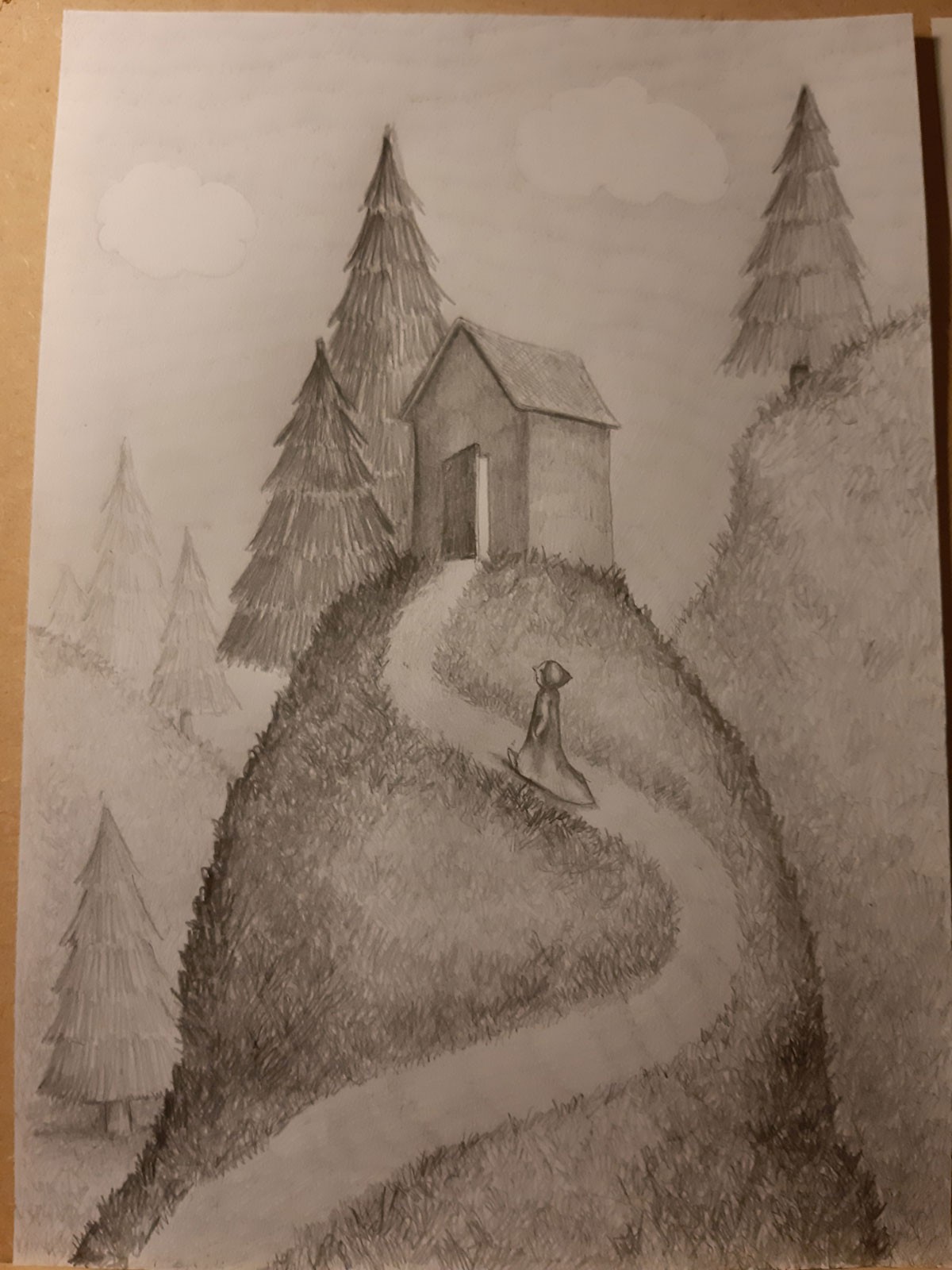 Realmente me gusta tu dibujo, muy bonito y tenemos la sensación de altura :) Me parece que podemos distinguir bien los planes porque has entendido el principio de la perspectiva atmosférica, más claramente está claro y no muy contrastante. Tu personaje en el camino de la luz sale bien. En términos de valores, habría hecho un ligero gradiente en el camino que es un poco monobloqu. Ligeramente más oscuro en la parte inferior, un poco más de la guarida en la parte superior, especialmente que parece que el interior de la casa está iluminado. De lo contrario, lo que me molesta un poco es el árbol más pequeño justo detrás de la colina, tienes una pequeña impresión de que flota en el vacío que encuentro. Cambié un poco tu dibujo con lo que dije para el camino, pero también puse este árbol al frente, encuentro que mejora. Lo acorté un poco porque de lo contrario habría pasado frente al camino, lo que habría reducido la fluidez de leer la imagen. Francamente estás en el camino correcto, es un gran trabajo :)