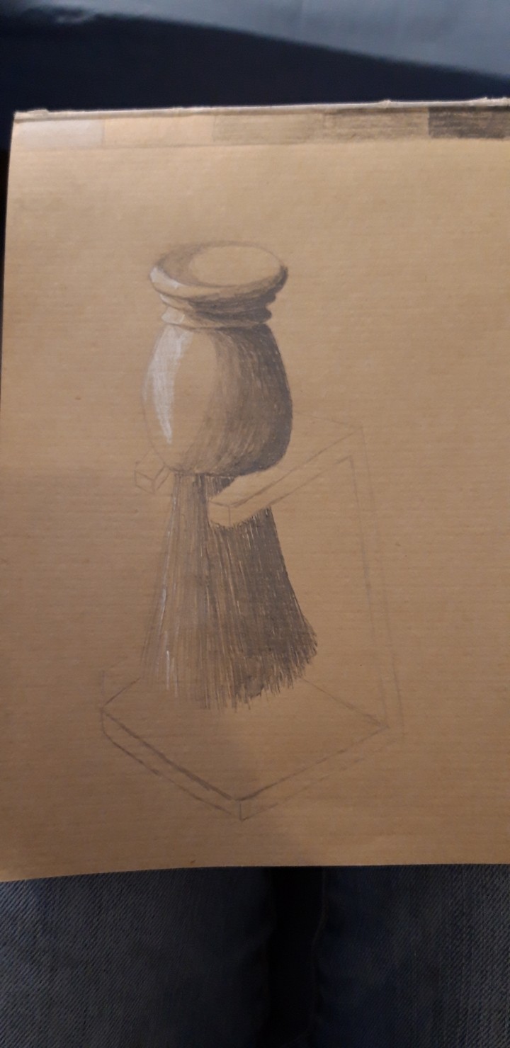 C'est du bon travail aussi, c'est bien le kraft pour pouvoir aussi faire les reflets en blanc :) Le défaut est un peu le même que sur ton premier dessin, les ombres s'arrêtent un peu trop nettement surtout sur la partie arrondie. Aussi sur les poils de ton truc (c'est un mélangeur pour le matcha ?), la zone de lumière n'est pas la même qu'au dessus, ton ombre est trop étendue par rapport au reste comme si ça n'avait pas tout à fait la même direction de lumière. A part ça les volumes sont bien rendus, bon travail :)