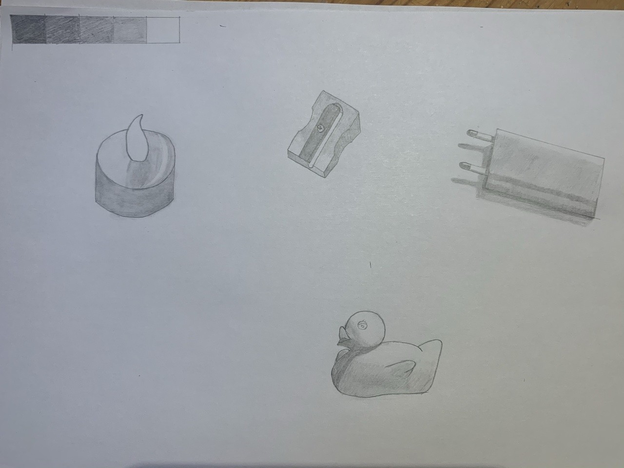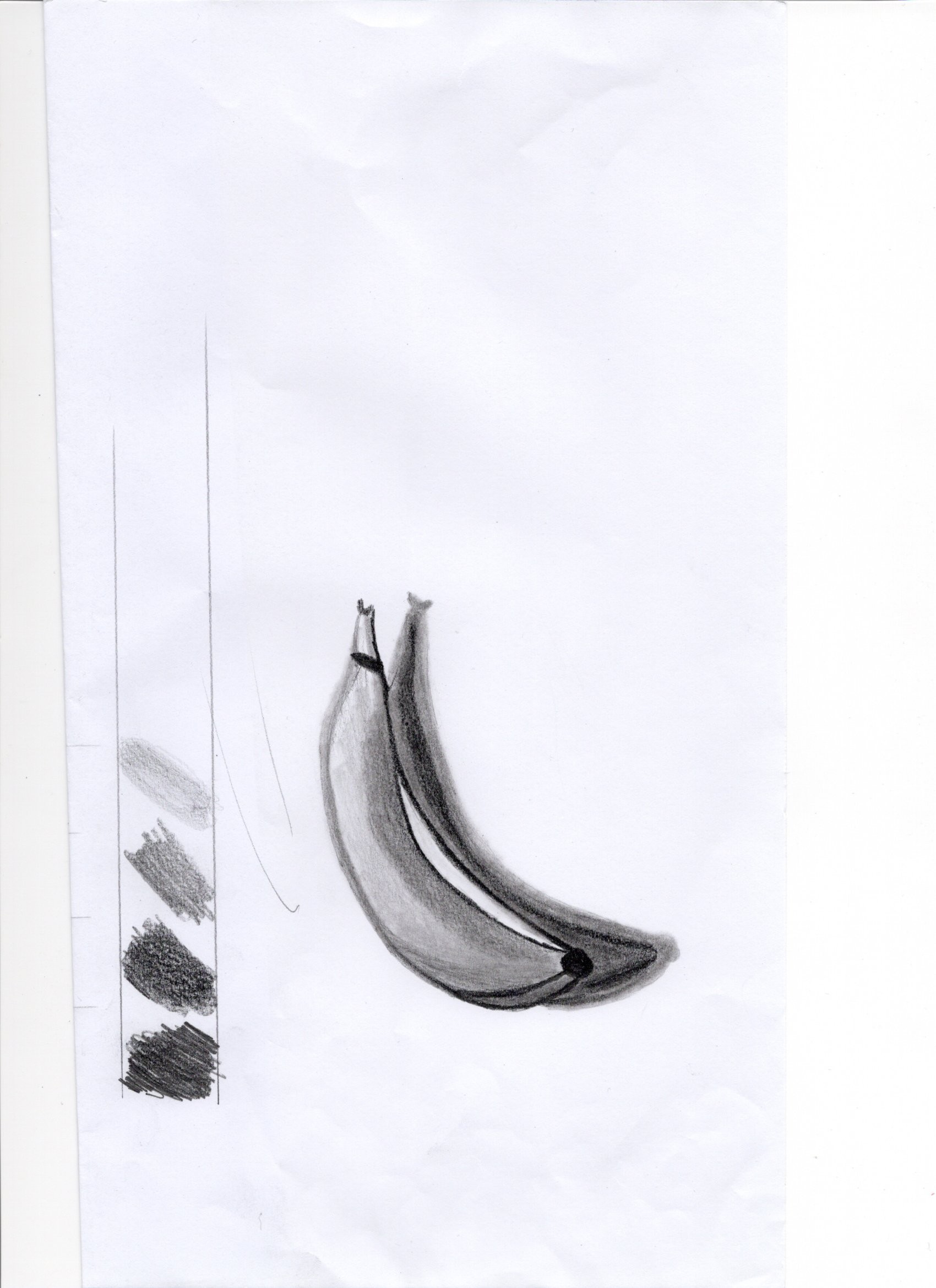 C'est du joli travail ! Tu n'as pas mis trop de blanc, les ombres semblent bien placées et réalisées. Par contre, ça manque de contraste, tu peux d'ailleurs le voir sur ton échelle des valeurs, les 2 teintes les plus foncées ne sont presque pas présentes. Il faut oser y aller plus, foncer plus fort les zones vraiment ombrées, faire des dégradés qui aillent vers du plus foncé quand il le faut. Si tu as du mal à avoir du foncé même en appuyant, n'hésite pas à prendre un crayon plus gras. C'est bien réalisé en tous cas :)
