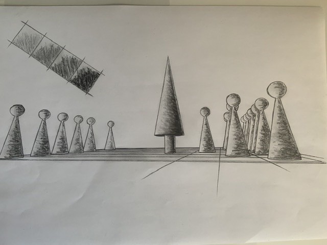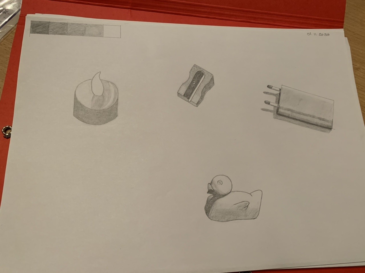 Je vous met mes dessins. Pas facile le dégrader et pas facile de bien représenter les objets choisis.