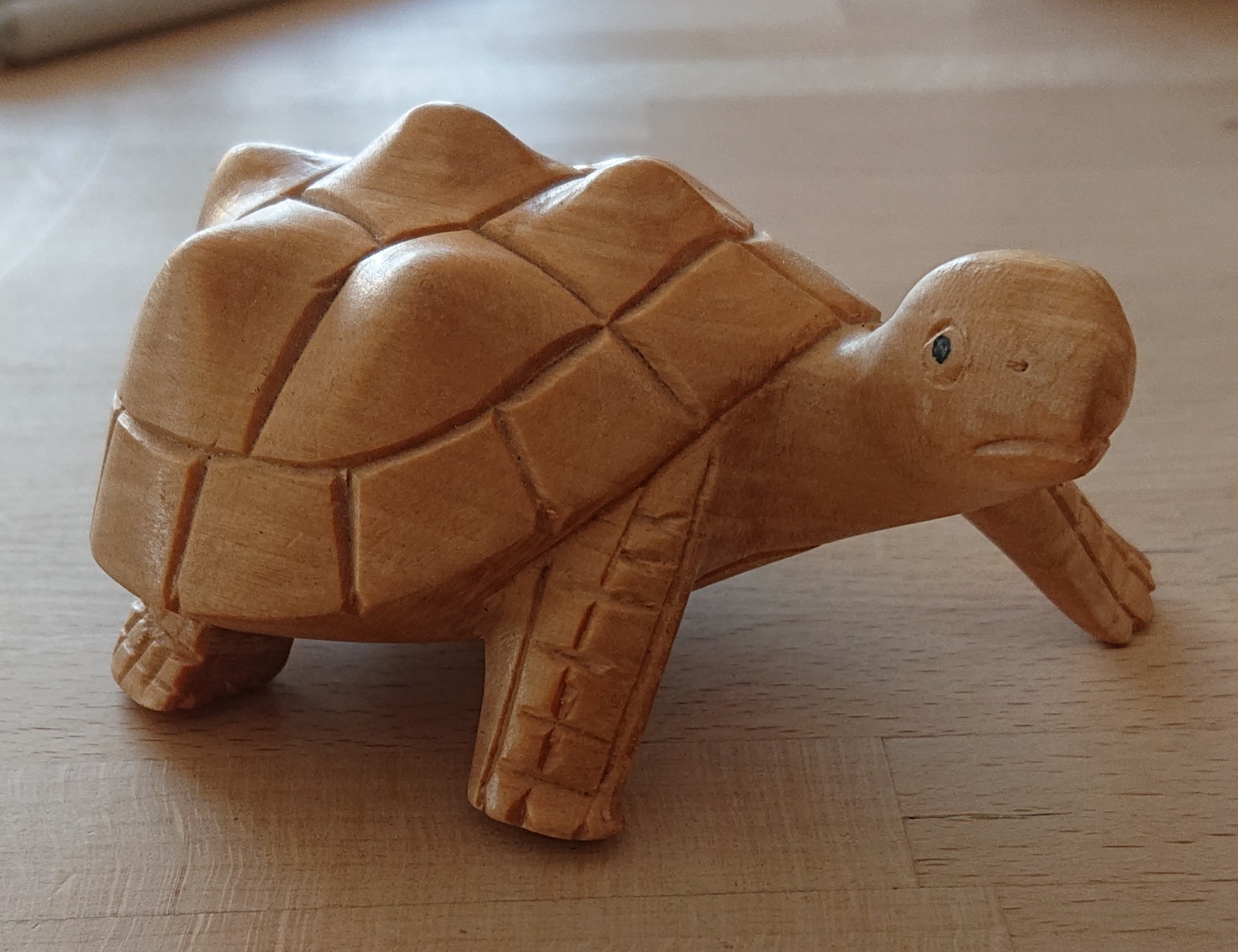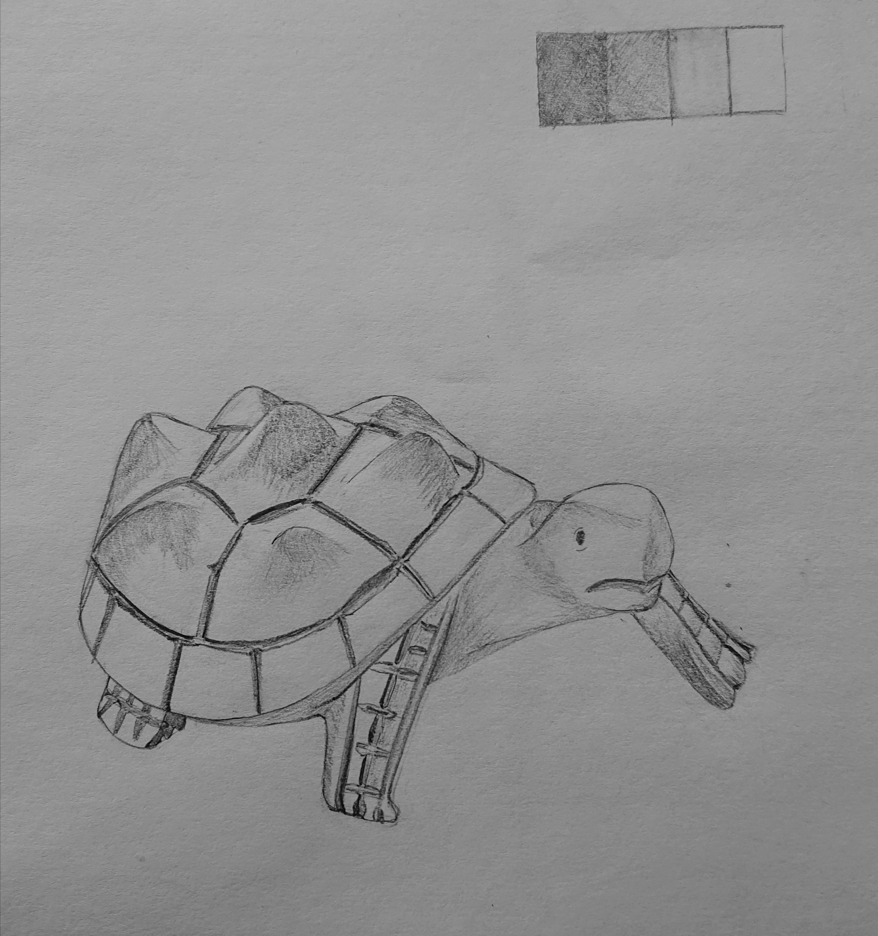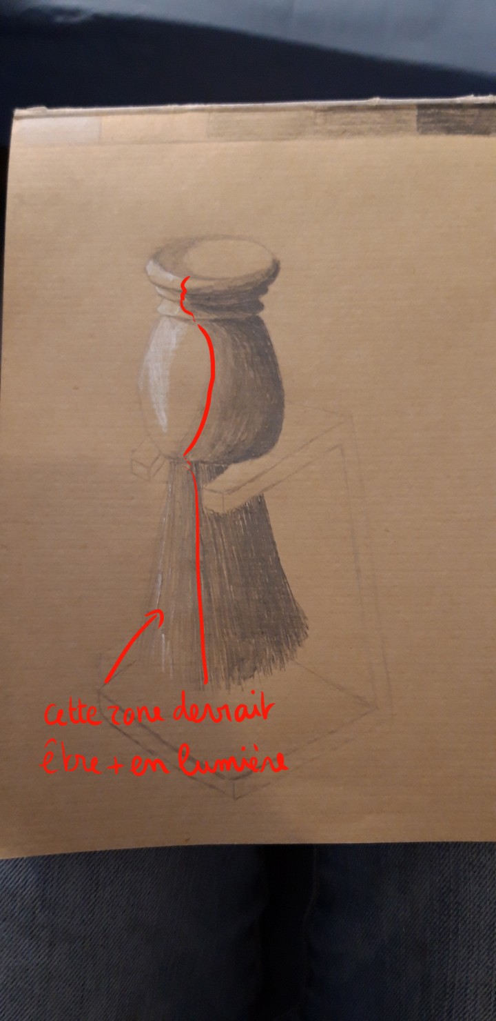 Merci d'avoir mis l'objet en photo, ça m'aide à mieux visualiser :) C'est pas mal mais tu n'es pas allé assez loin dans tes valeurs, par exemple le bas de la carapace est resté tout blanc. Tu as l'impression que l'objet est trop clair mais ce n'est pas du tout le cas ^^ En fait dans la réalité presque rien n'est aussi clair que le blanc sauf des lumières très très fortes. En fin de compte la valeur majoritaire sur ton dessin serait une valeur entre tes 2 du milieu de ton échelle de valeurs. tu as mis tout en blanc de cette valeur moyenne jusqu'aux vraies lumières, ce qui rend moins bien les volumes. Les seuls endroits que tu devrais laisser en blanc sont les lumières sur les bosses de la carapace et derrière la tête de la tortue. Ensuite tu pourras mieux travailler les dégradés d'ombre.