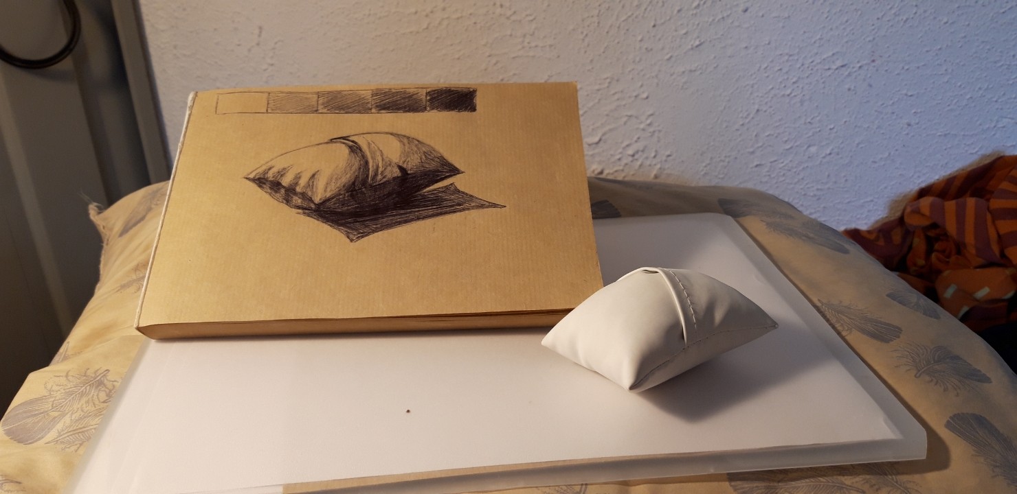 Moi je pense que tu peux être satisfait car c'est un très bon début :) Et c'est très bien d'avoir ton modèle en réel, ça pousse encore plus loin l'observation. Je dirais juste que sur la droite de ton petit coussin l'ombre s'arrête un peu trop nettement, il faudrait dégrader progressivement un peu plus. Bon travail en tous cas, bravo !