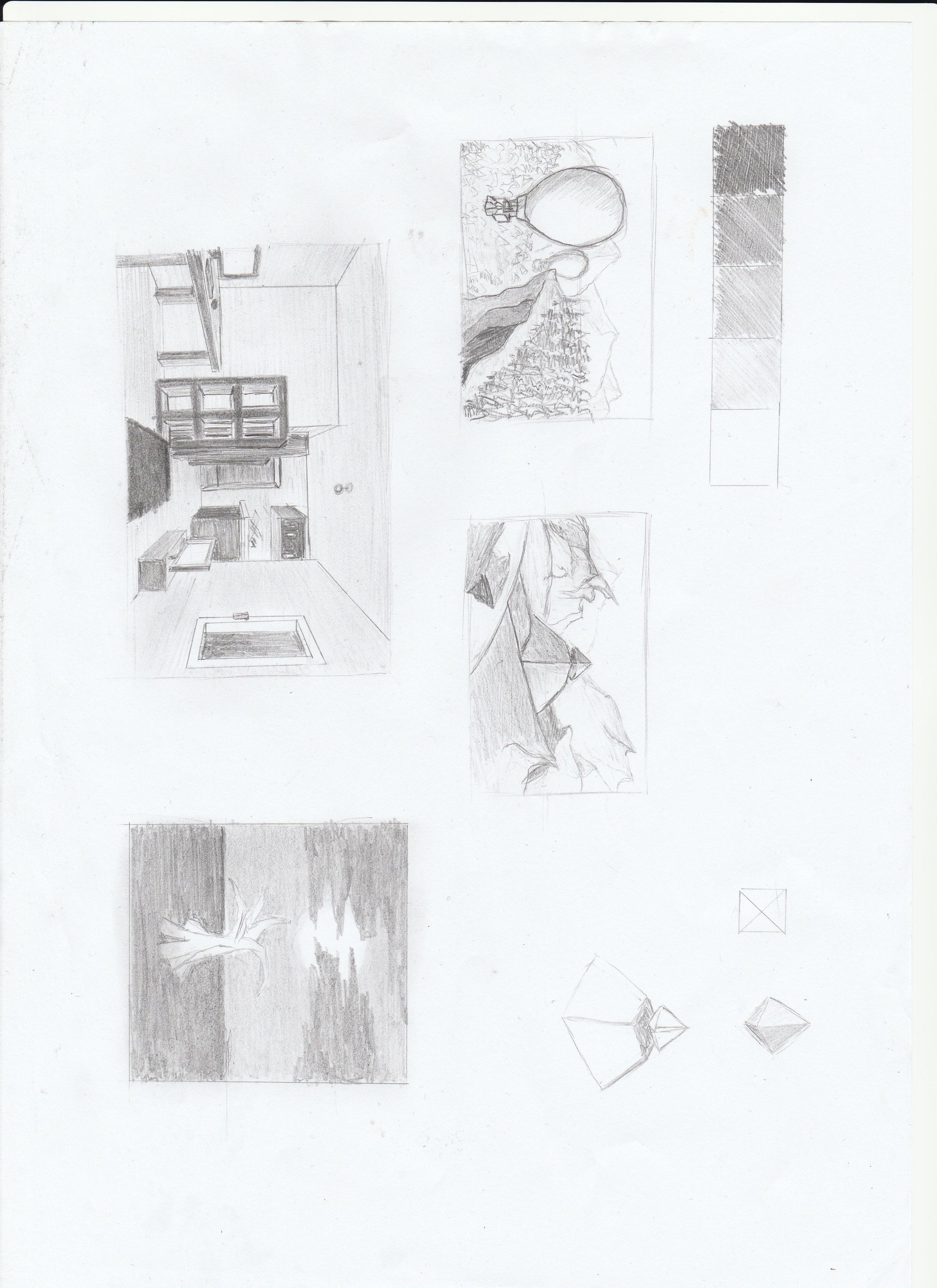 C'est pas mal, tu as bien utilisé les différentes valeurs de ton échelle. Cependant, j'ai l'impression que tu es confus sur certaines notions. Tu utilises souvent tes valeurs non pas pour montrer des ombres et lumières mais seulement pour les changements de couleur des objets, ça se remarque surtout sur ton dessin en bas à droite. Il manque une direction de lumière, sur ce même dessin on peut voir par exemple que tu as ombré l'avant du meuble de tv, mais pour le meuble de cuisine c'est le côté qui est ombré, ce n'est pas cohérent. De même, tes murs ont tous les mêmes valeurs alors qu'avec une direction de lumière bien établie ça ne devrait pas être le cas. Ton dessin tout à droite a des soucis similaires, différentes valeurs pour séparer les éléments mais pas d'ombres ou d'ambiance lumineuse.