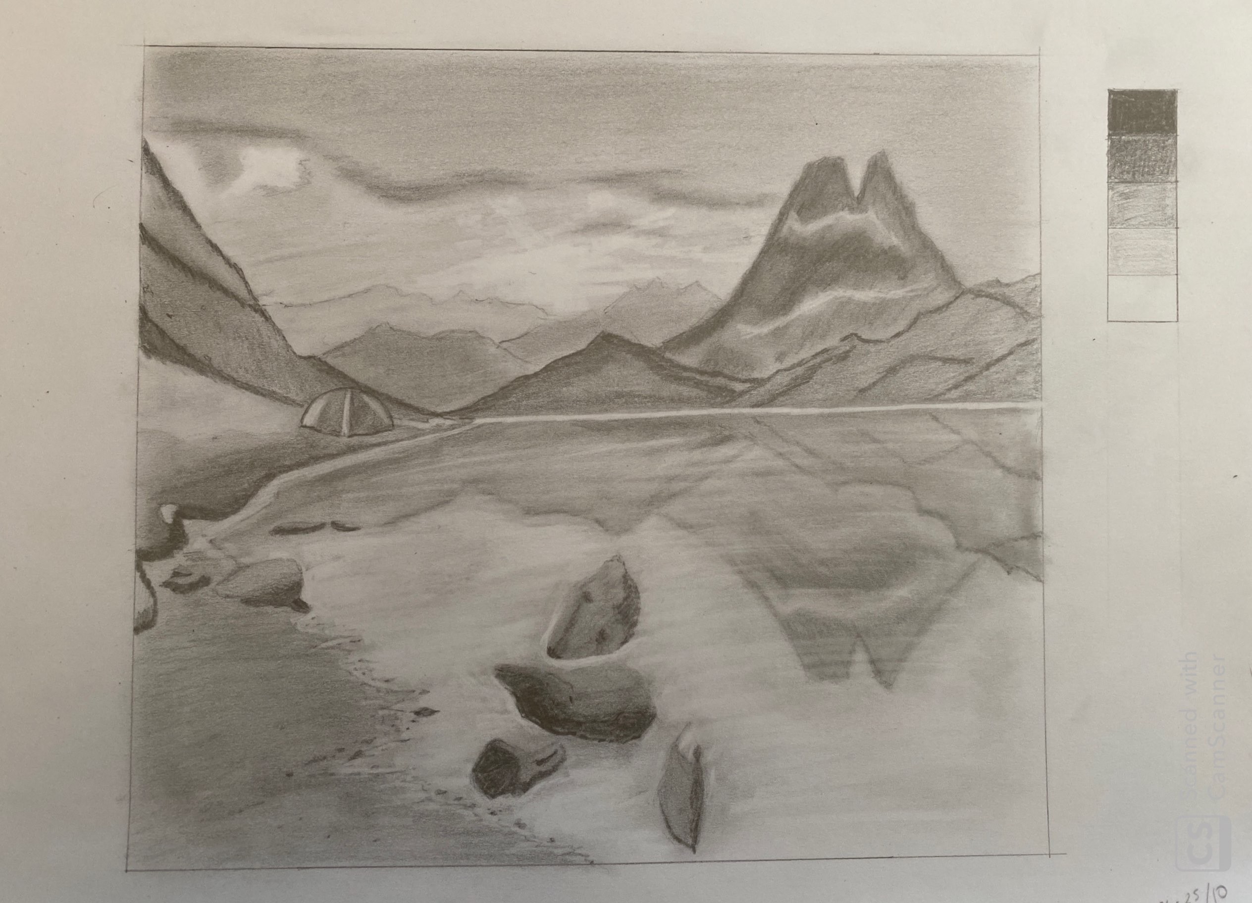 Sympa ce dessin, tu as bien contrasté les éléments et utilisé toute ton échelle de valeurs, c'est un bon point :) Faire des reflets dans l'eau c'est pas facile, mais je trouve que c'est plutôt bien réalisé alors je te félicite :) Ce qui me perturbe plus c'est ta hiérarchisation des plans avec les valeurs. J'ai l'impression que tes premières montagnes derrière le lac sont ce qu'il y a de plus foncé, mais ce n'est pas très logique. Pareil tes cailloux dans l'eau sont super foncés et contrastés et ont dirait qu'ils flottent un peu dans le vide. Ils sont certes à l'avant donc c'est normal qu'ils soient assez foncés mais si on regarde la plage au même niveau ce n'est pas traité pareil.