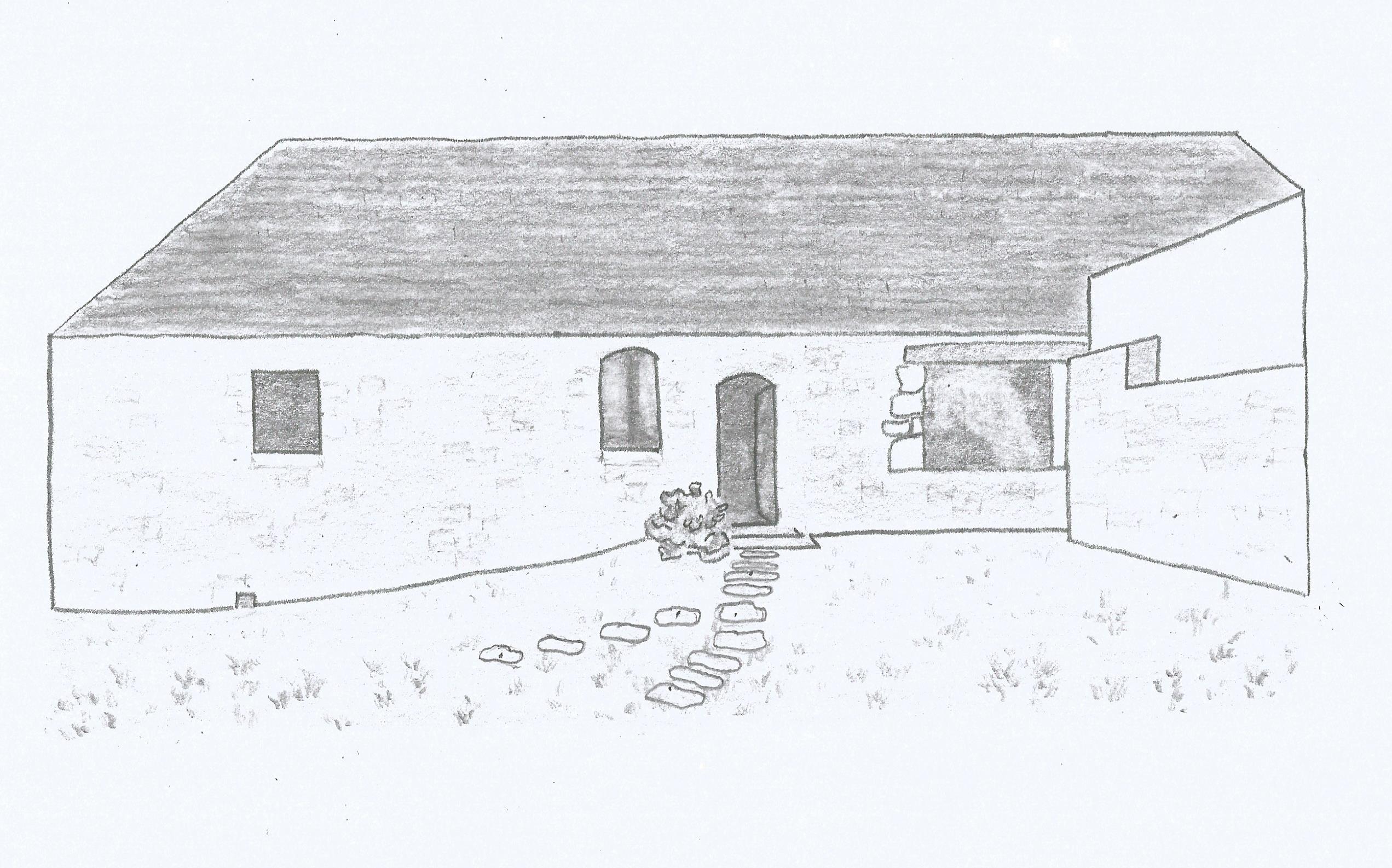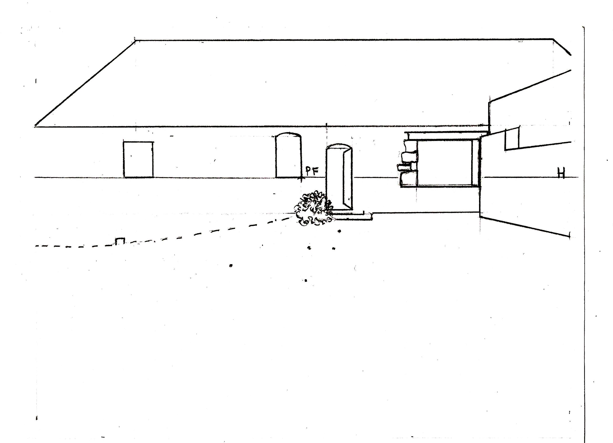 J'essaye de dessiner cette maison et son petit jardin en perspective et ensuite lui donner des valeurs de gris. j'ai quelques soucis avec la perspective :