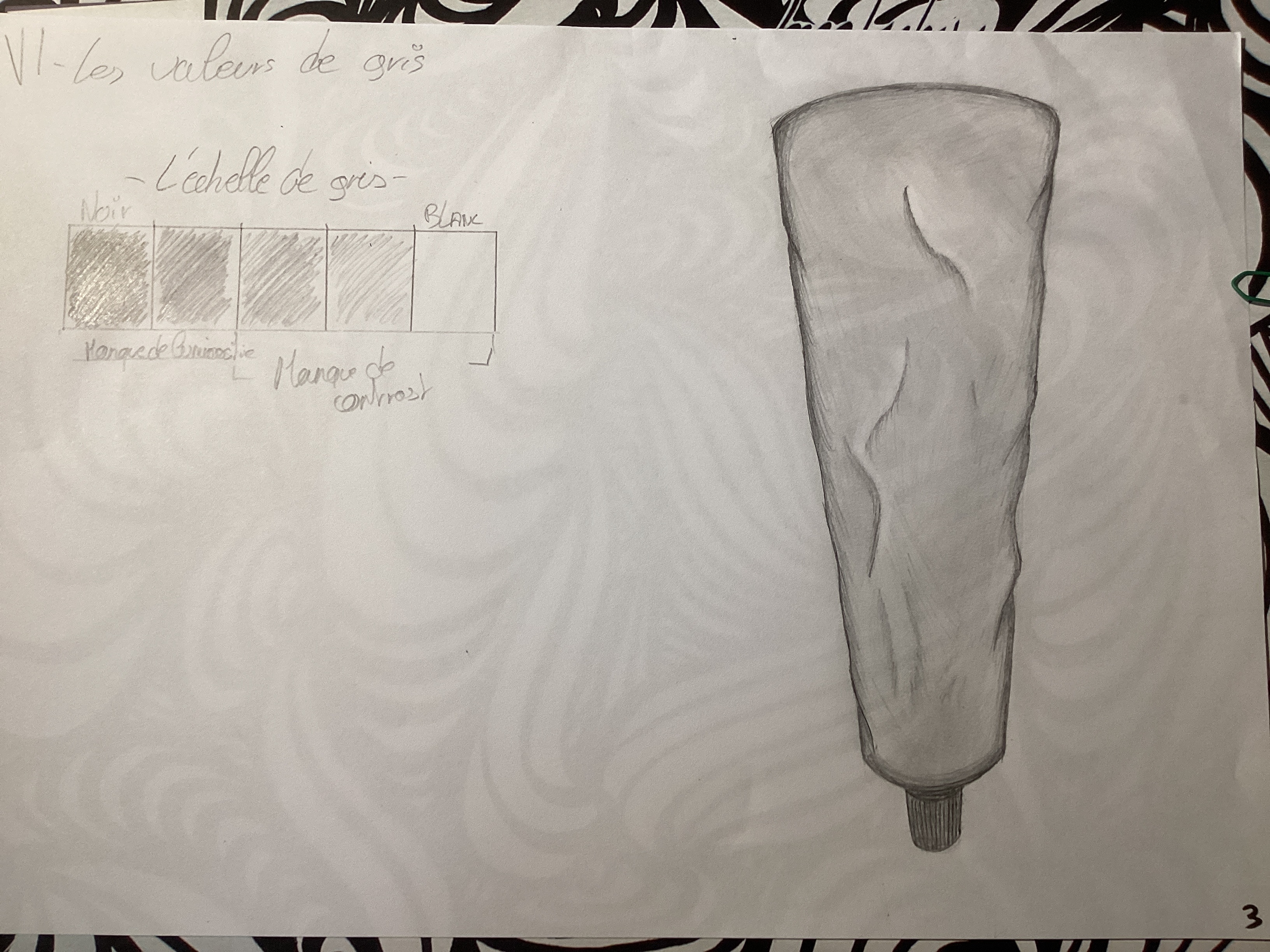 Concernant les niveaux de gris je suis partie sur une palette de 6 et ai troqué le critérium pour un crayon 2B afin d'avoir une meilleure uniformité.